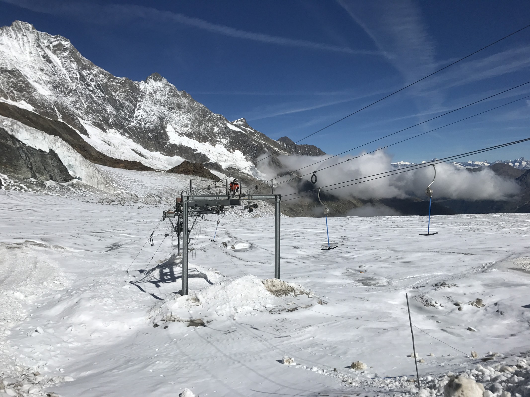 Nach der kurzen Fahrt nach Saas Fee und dem mühseligen Fussmarsch zum Alpin-Express stellte ich mich also um 6.50 Uhr in die lange Kolonne, die 37min dauerte. Durch den unterhaltsbedingten Ausfall einiger Kabinen war nicht die volle Kapazität verfügbar. Dafür war das Anstehen viel gesitteter als in Hintertux. Vermutlich dies aber nur, weil das Durchschnittsalter der Teams zumindest in meinem Anstehbereich erheblich höher war.