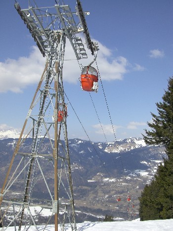 Ebenfalls direkt von Flaine aus startet dieses kuriose Ding, der Korblift "Telebenne" von Creissels, 1973, der die Verbindung vom eigentlichen Ort Flaine zu einem darüberliegenden Plateau ermöglicht, von dem aus dann weitere Lifte erreichbar sind.