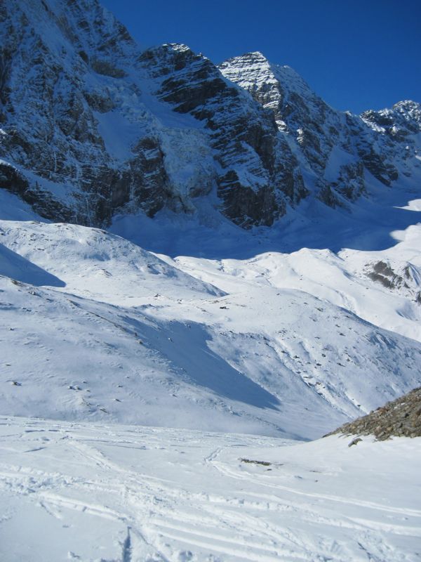 Die Abfahrt zur Mittelstation ging offpiste ebenfalls. Der Steilhang ließ sich im Tiefschnee bestens fahren, im Flachstück waren 200m ziemlich grenzwertig.