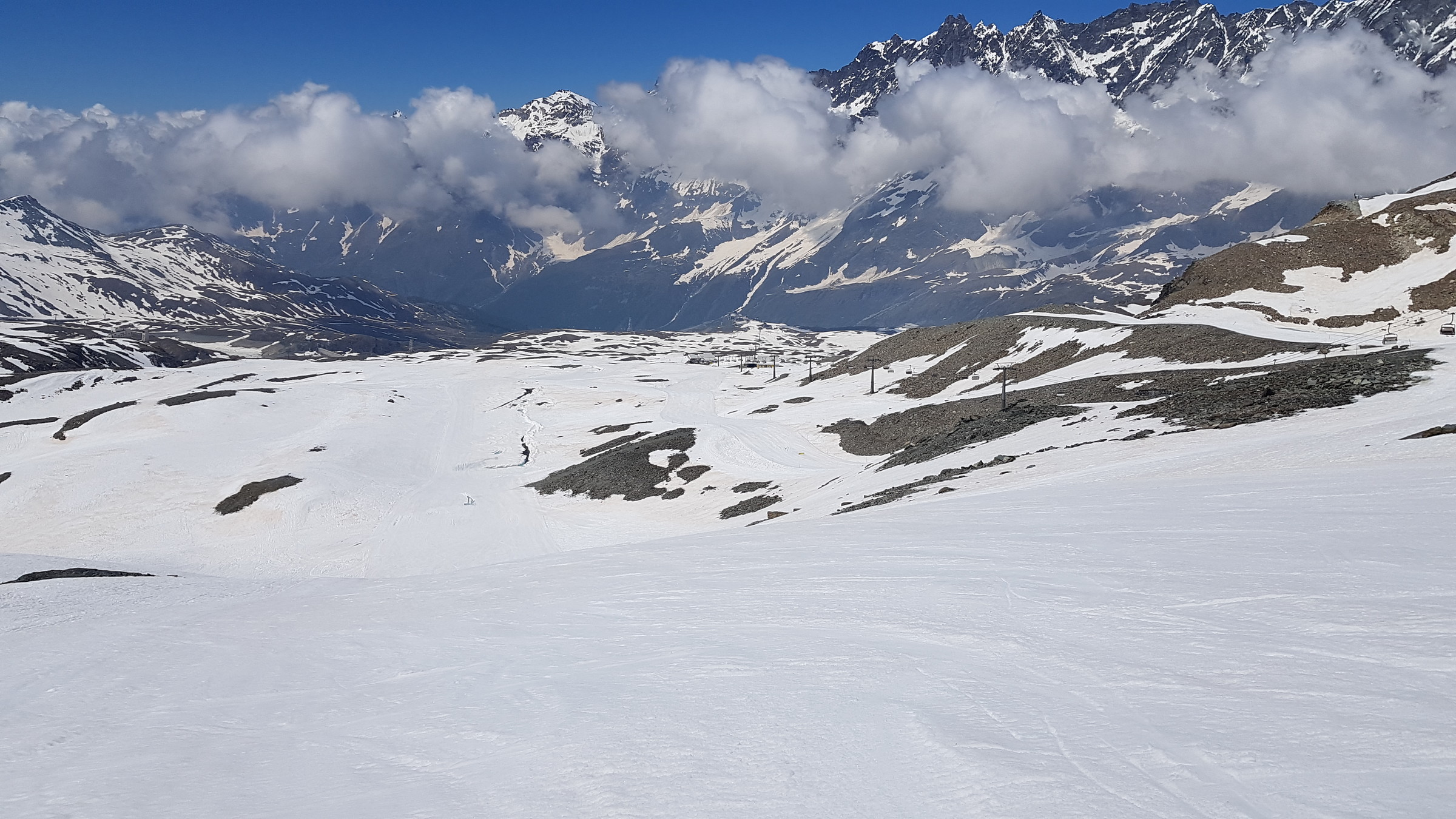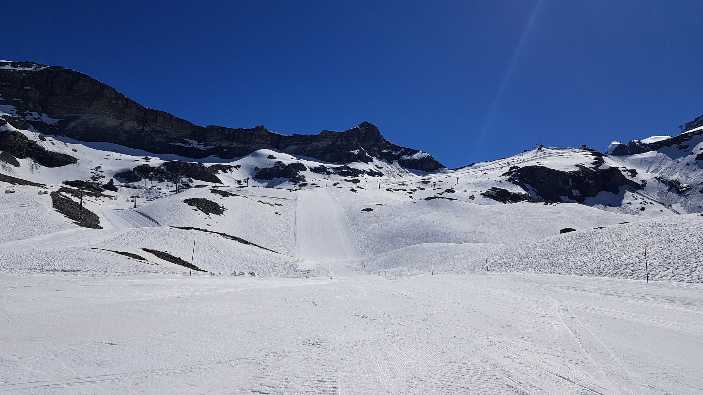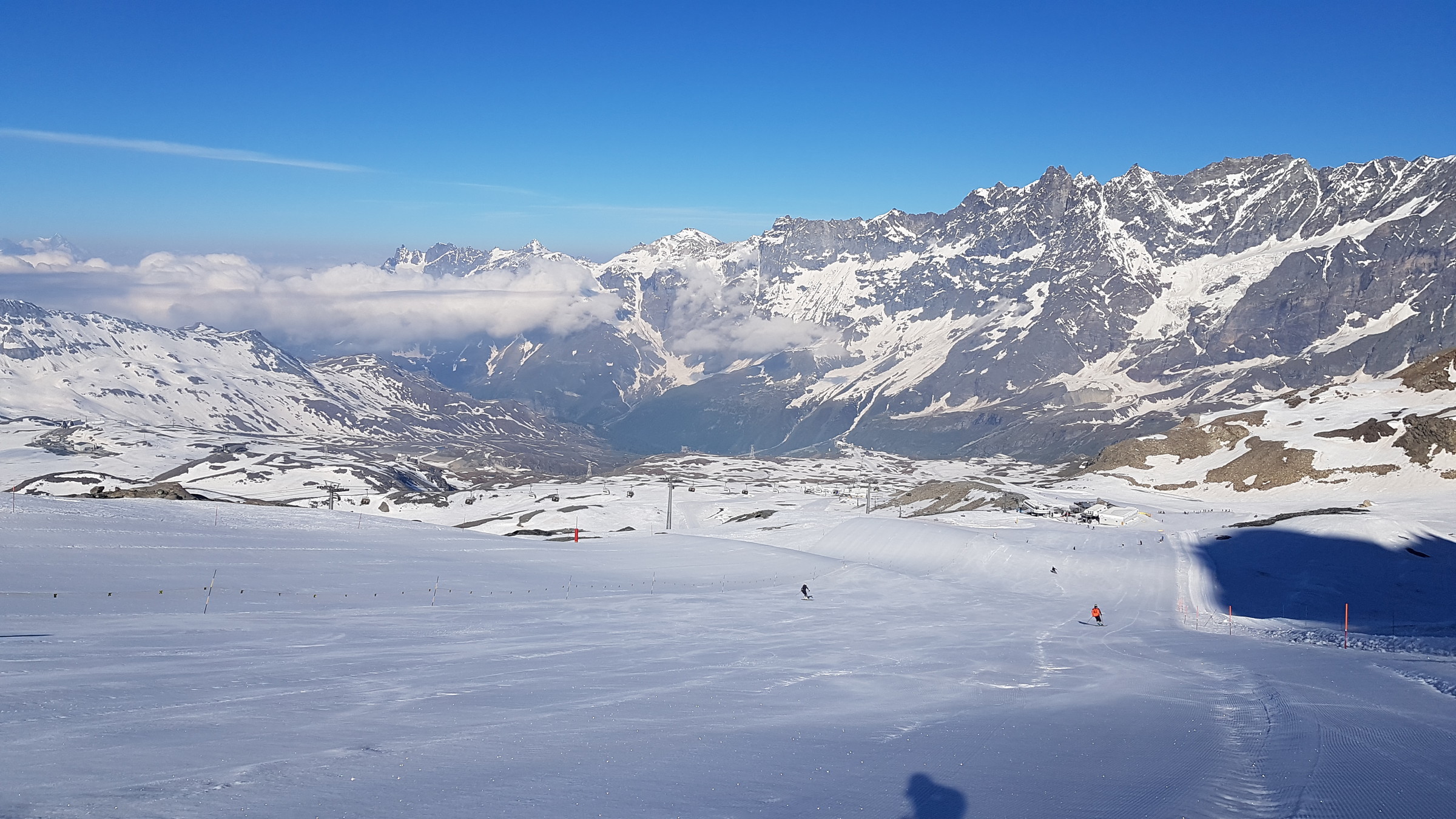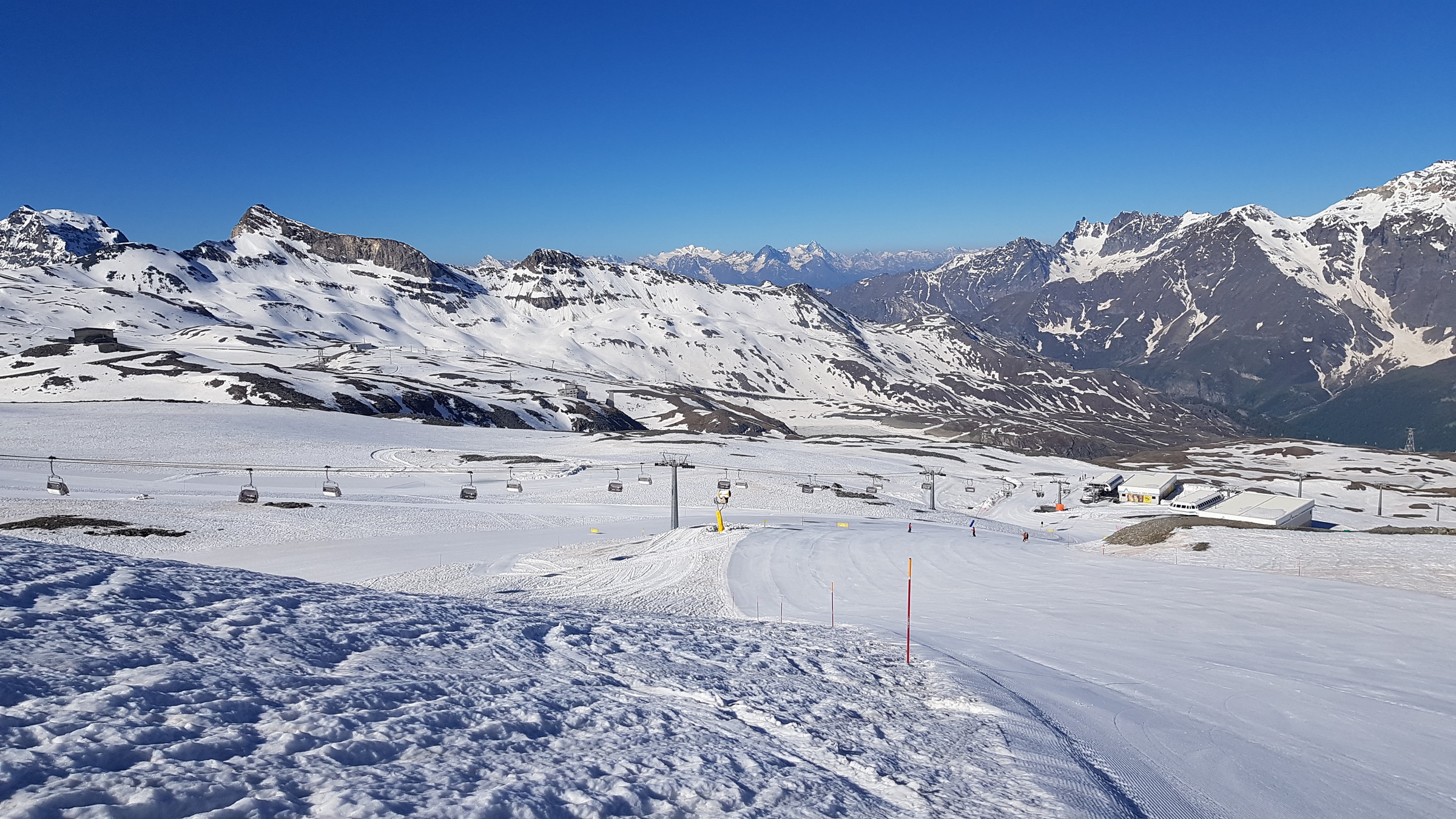 Seit Samstag ist wieder die internationale Verbindung offen und Cervinia bietet diese und vsl nächste Woche noch ein ordentliches Angebot mit den beiden KSB Bontadini (bis 13:30) und Fornet (8:15-13:15) und je drei Pisten sowie geöffneter Abfahrt bis Plan Maison. Die Ventina ist leider geschlossen und kaum fahrbar: beim oberen Hang war eine Pistenraupe am Schneeverschieben (dadurch komplett verwüstet), unten wurde es zwar irgendwann nochmal präpariert, aber da kreuzt eine Baustraße. Aber dieses Jahr braucht man sie ja auch nicht zwingend