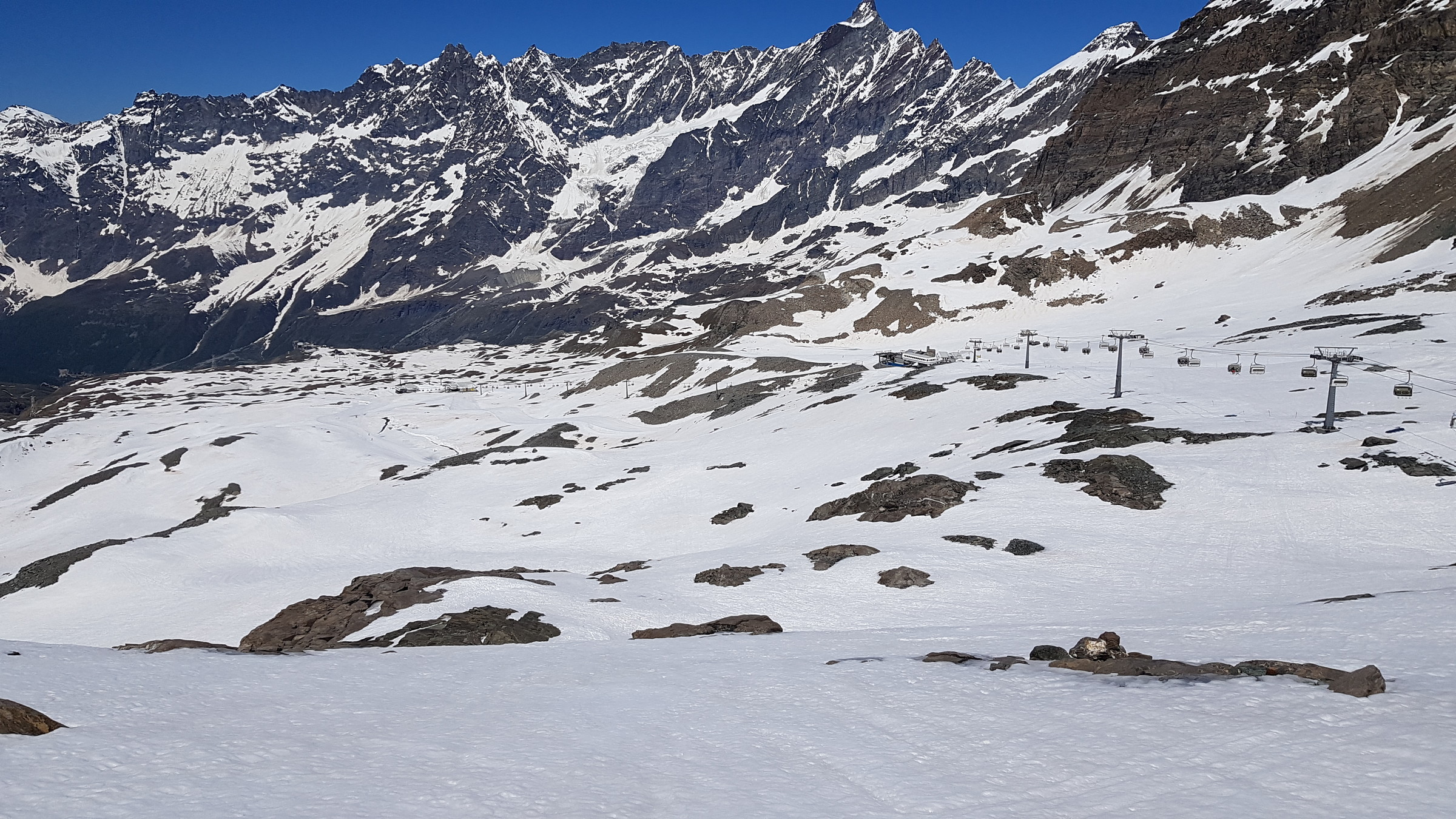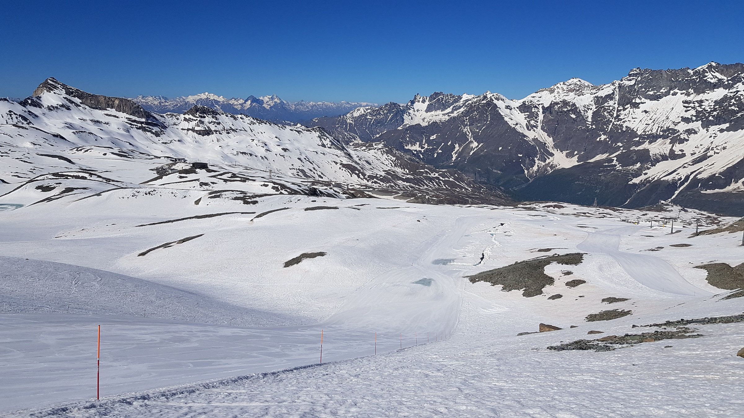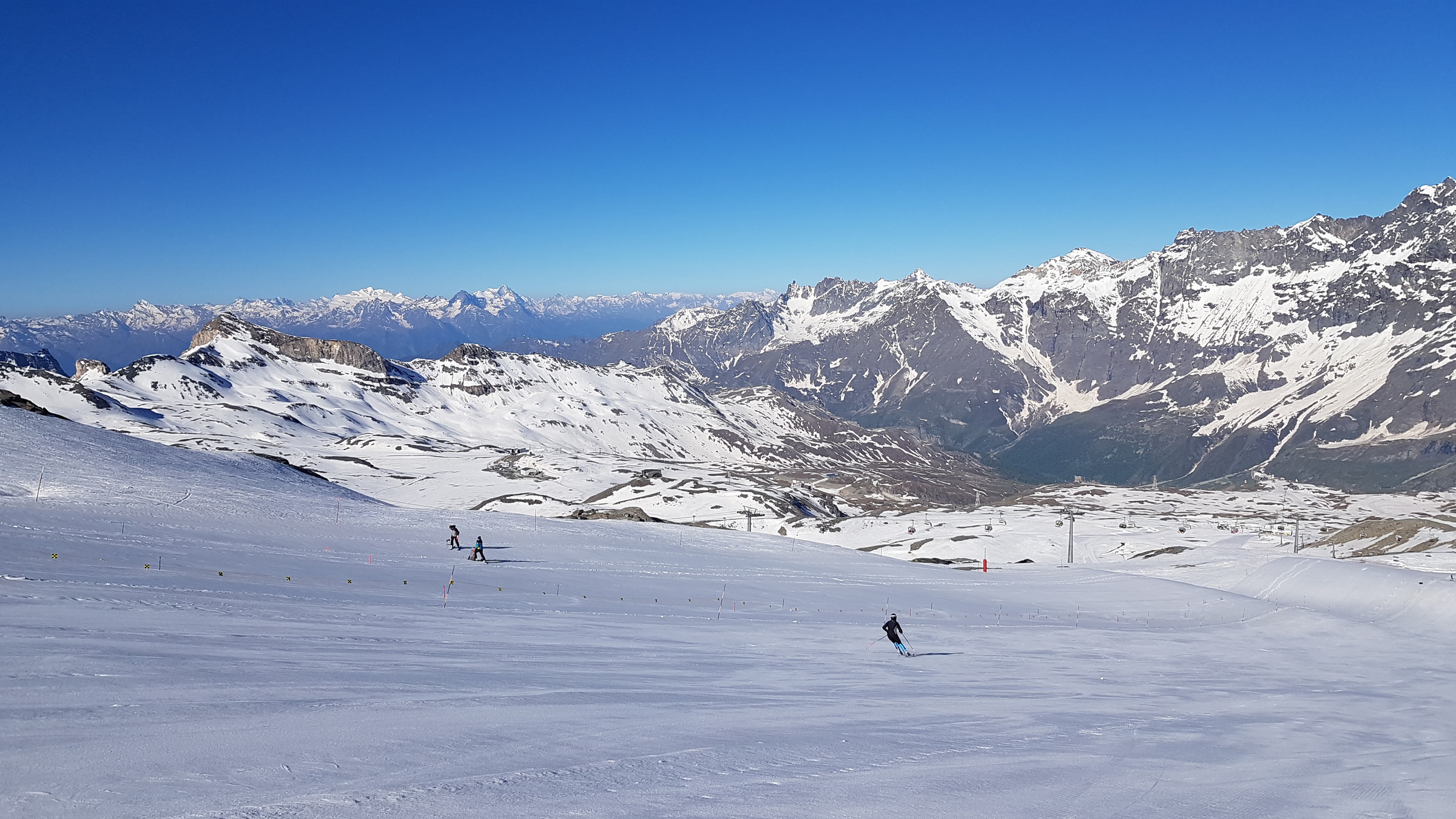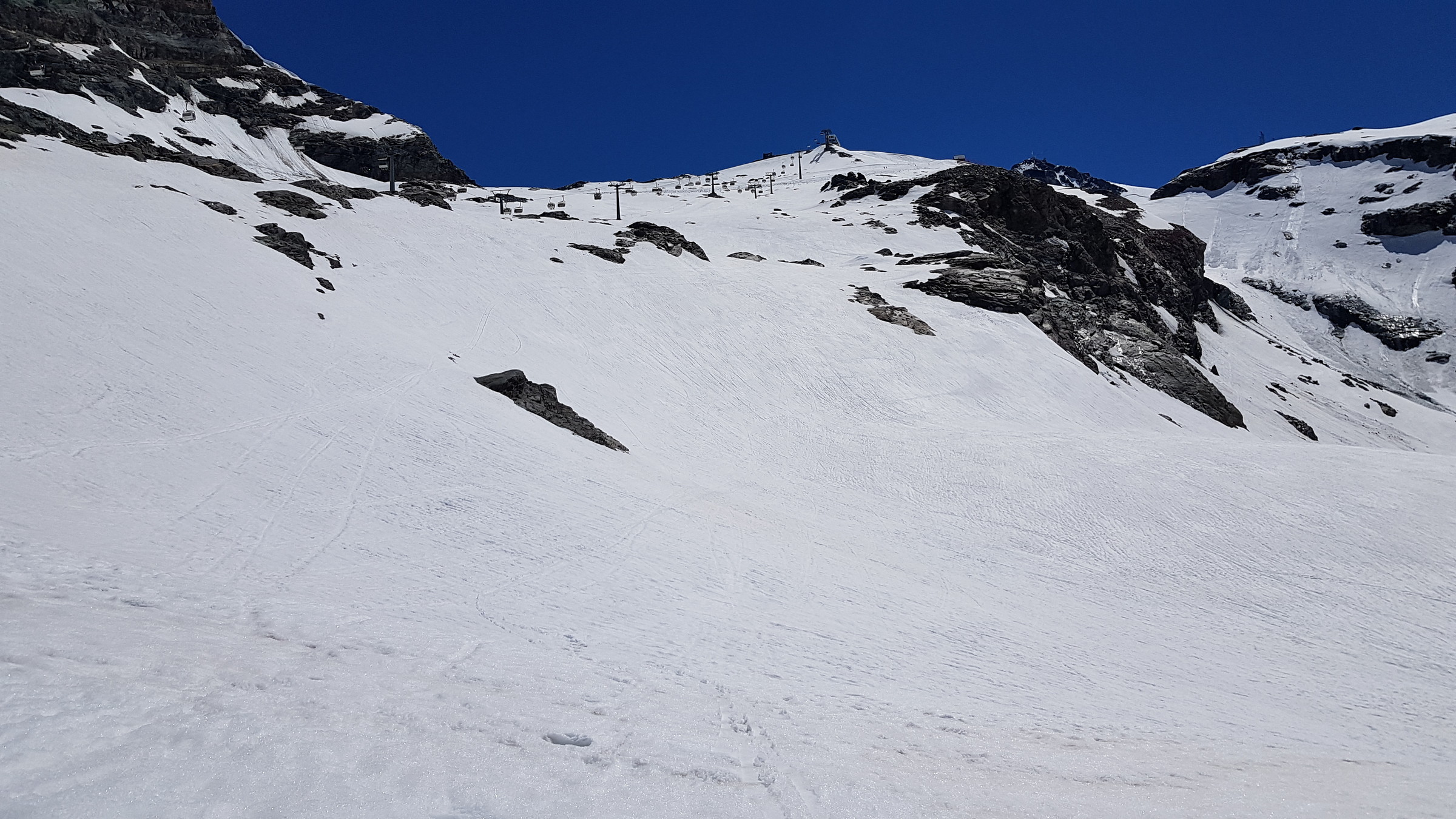 Seit Samstag ist wieder die internationale Verbindung offen und Cervinia bietet diese und vsl nächste Woche noch ein ordentliches Angebot mit den beiden KSB Bontadini (bis 13:30) und Fornet (8:15-13:15) und je drei Pisten sowie geöffneter Abfahrt bis Plan Maison. Die Ventina ist leider geschlossen und kaum fahrbar: beim oberen Hang war eine Pistenraupe am Schneeverschieben (dadurch komplett verwüstet), unten wurde es zwar irgendwann nochmal präpariert, aber da kreuzt eine Baustraße. Aber dieses Jahr braucht man sie ja auch nicht zwingend