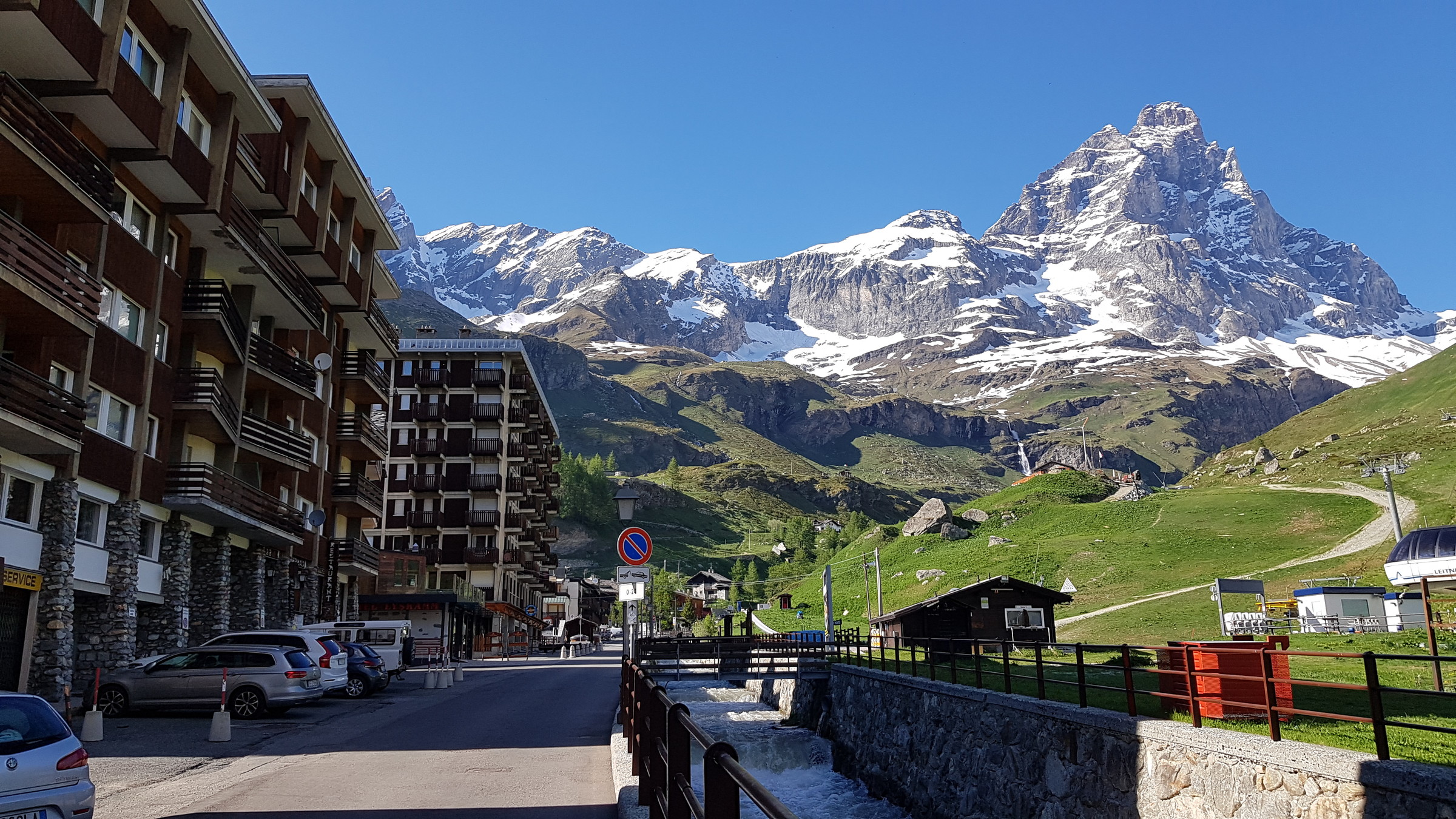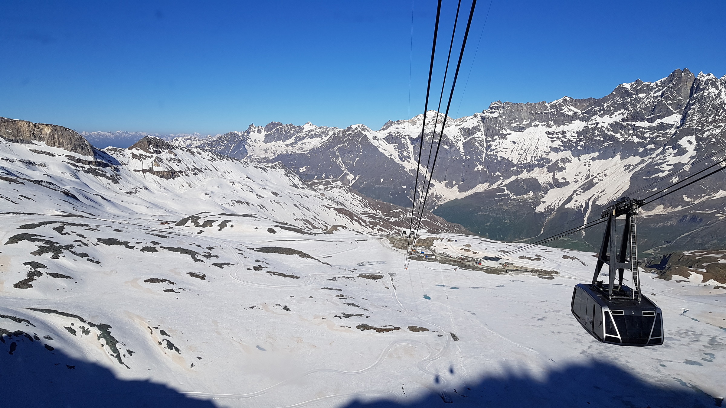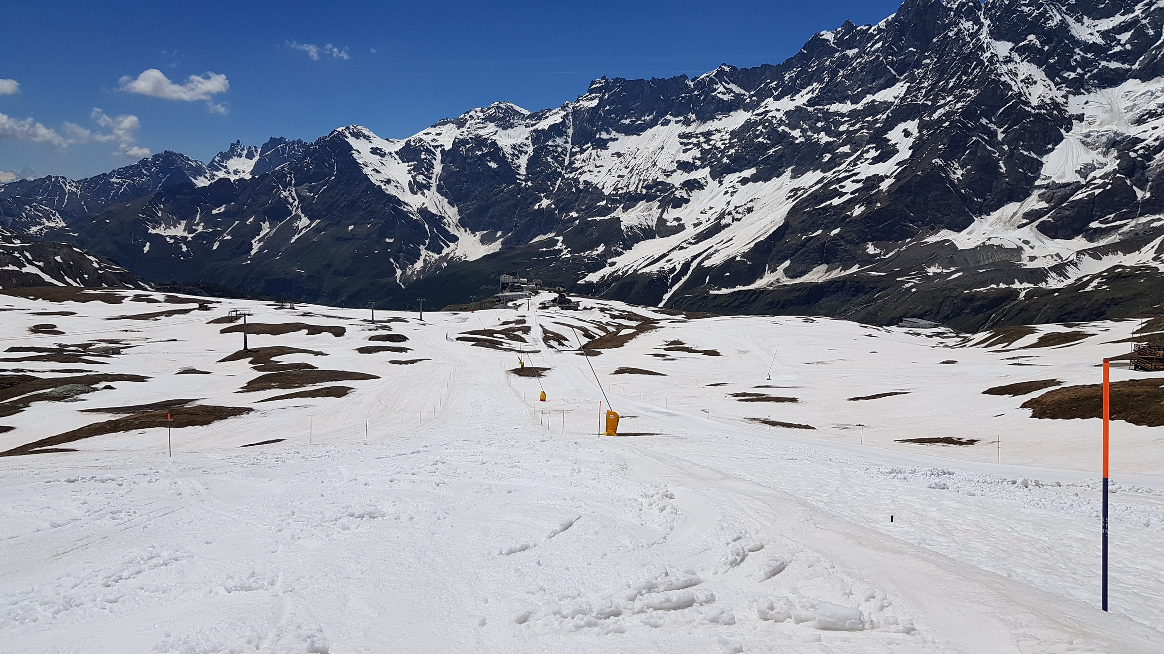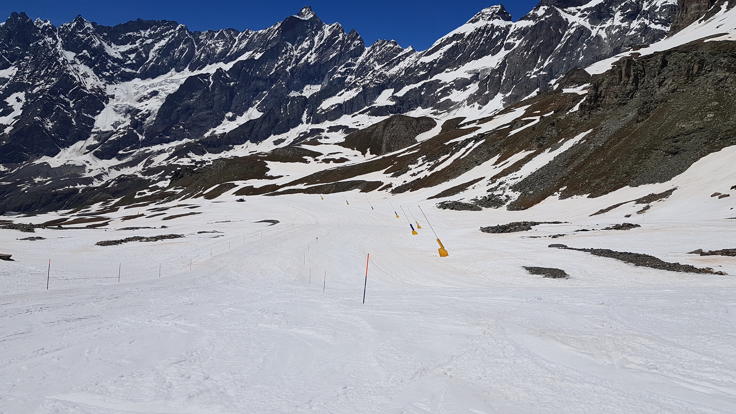 Seit Samstag ist wieder die internationale Verbindung offen und Cervinia bietet diese und vsl nächste Woche noch ein ordentliches Angebot mit den beiden KSB Bontadini (bis 13:30) und Fornet (8:15-13:15) und je drei Pisten sowie geöffneter Abfahrt bis Plan Maison. Die Ventina ist leider geschlossen und kaum fahrbar: beim oberen Hang war eine Pistenraupe am Schneeverschieben (dadurch komplett verwüstet), unten wurde es zwar irgendwann nochmal präpariert, aber da kreuzt eine Baustraße. Aber dieses Jahr braucht man sie ja auch nicht zwingend