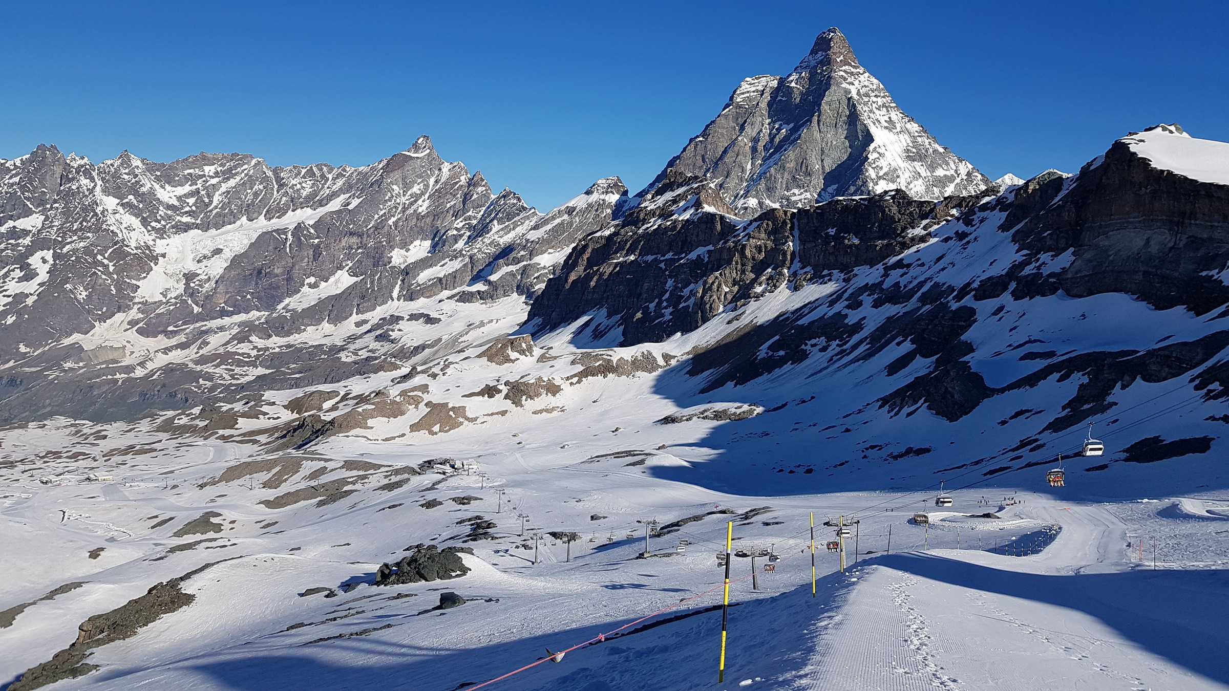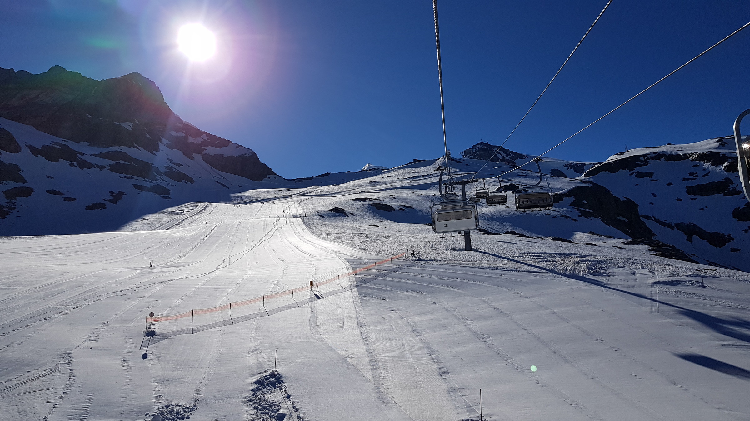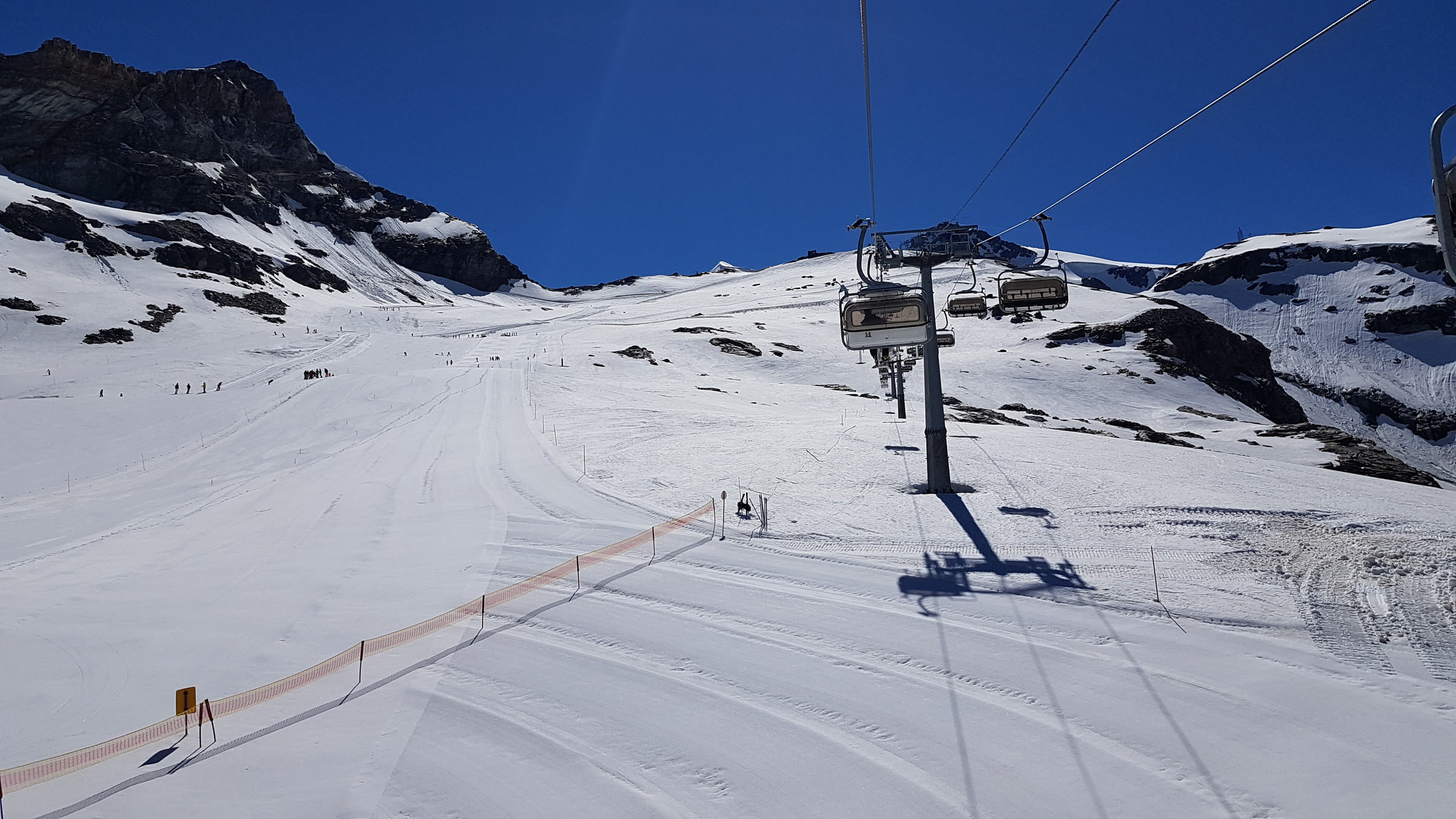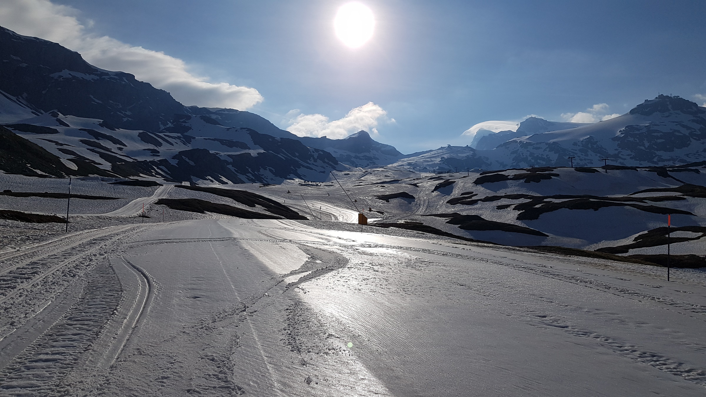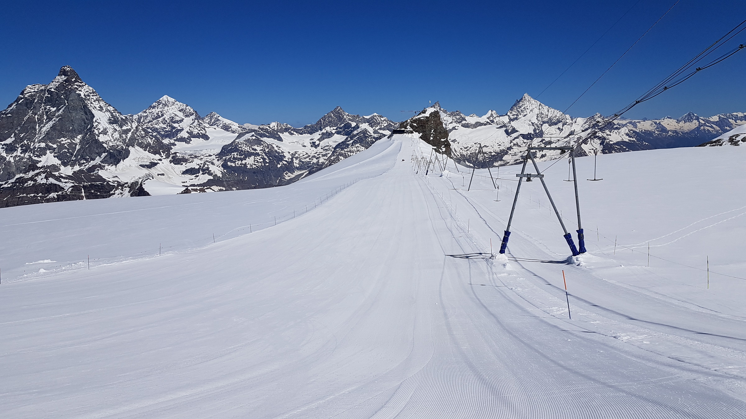 In Zermatt ist der SL Testa geöffnet (9:30-14), die 3S sowie der SL Plateau Breithorn. Auf Zermatter Seite war fast nichts los und wenig zerfahren bin selbst allerdings auch nur eine Runde dort gefahren). Der Bereich Plateau Rosa wird derzeit umfangreich hergerichtet. Dadurch wird man derzeit vom Klein Matterhorn kommend auf einen Steilhang geführt, den ich bisher gar nicht kannte (von oben gesehen sehr weit rechts).