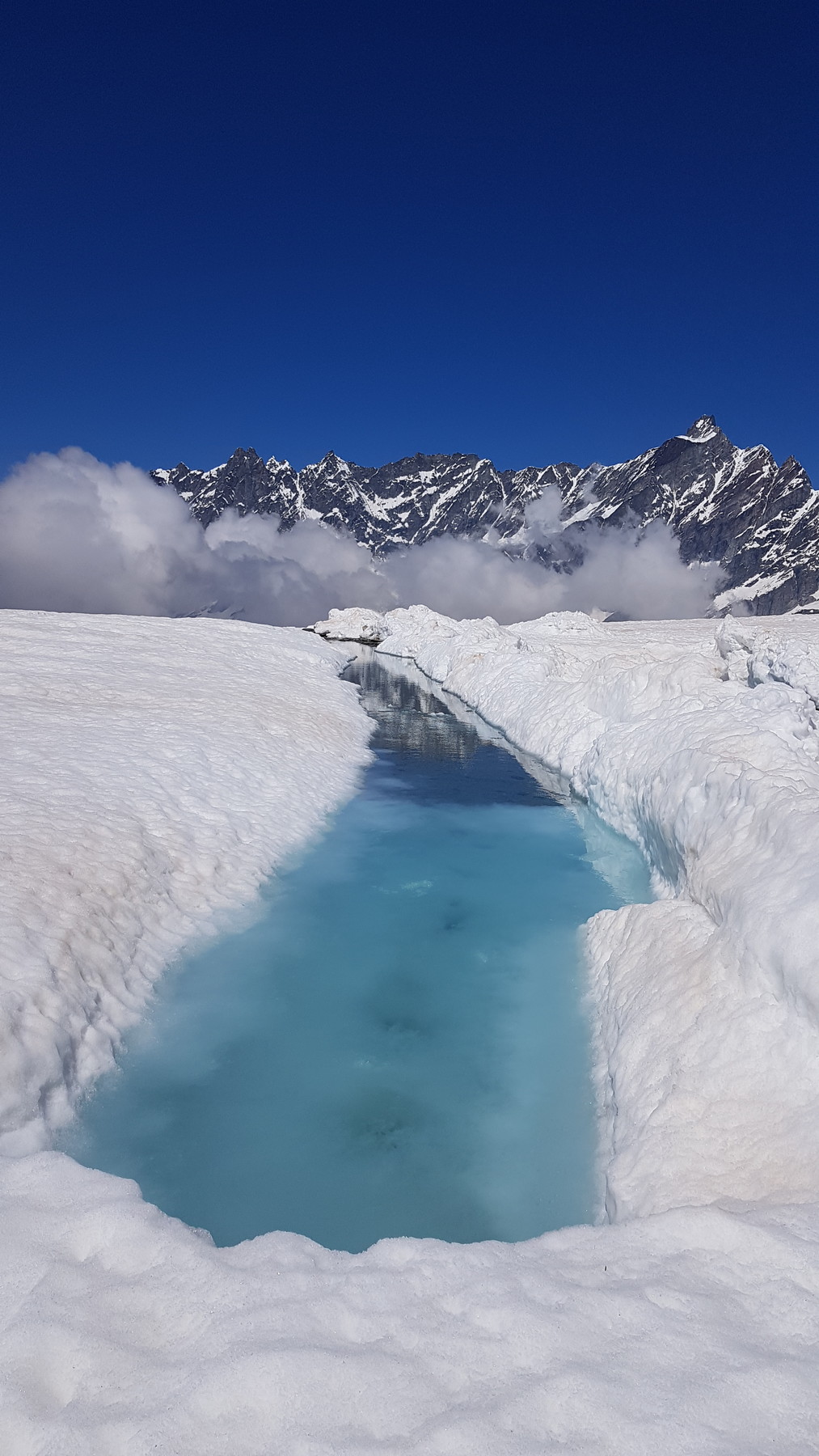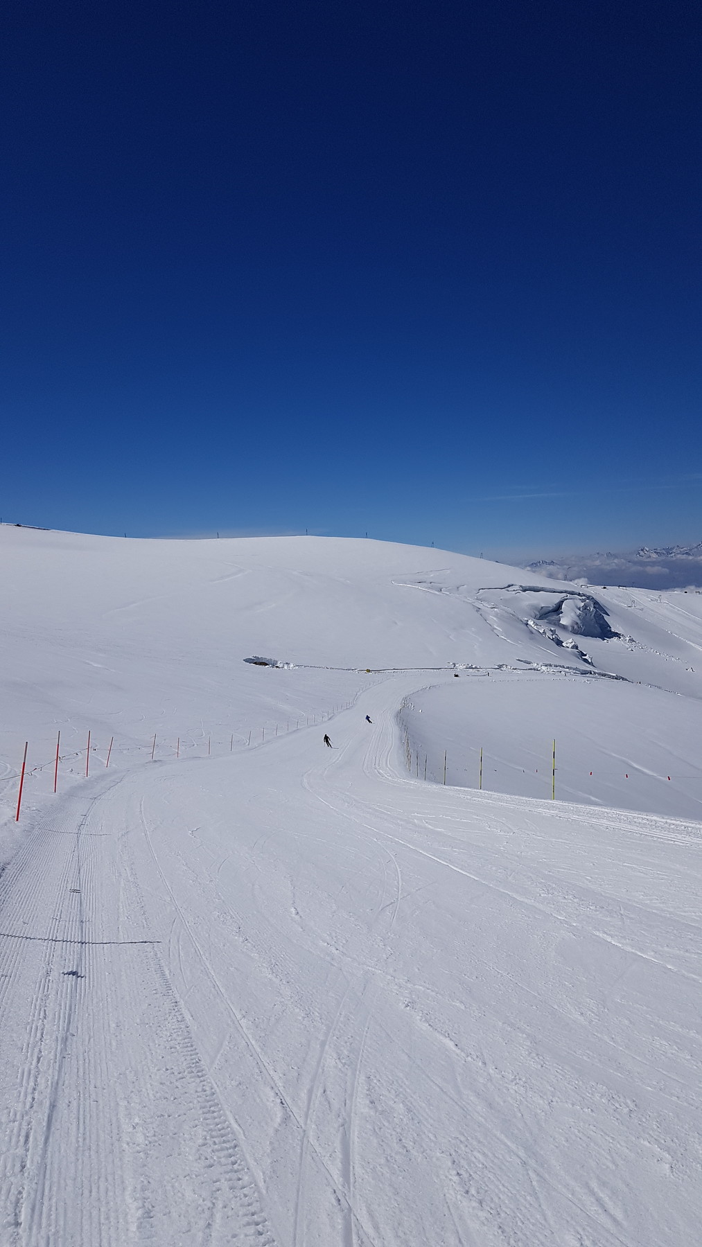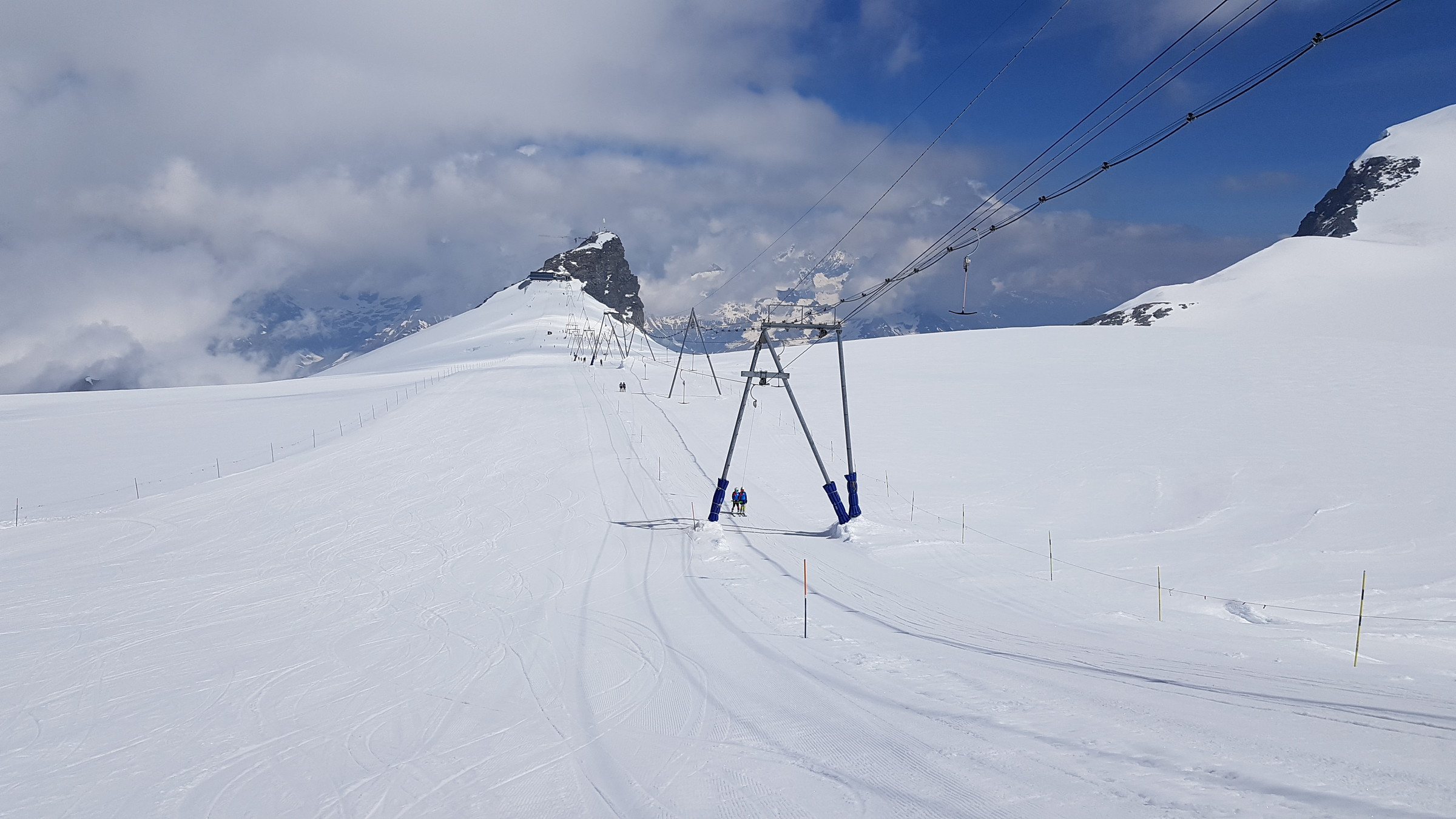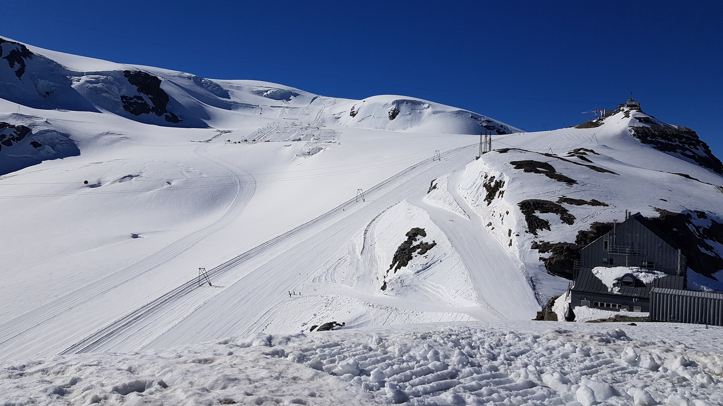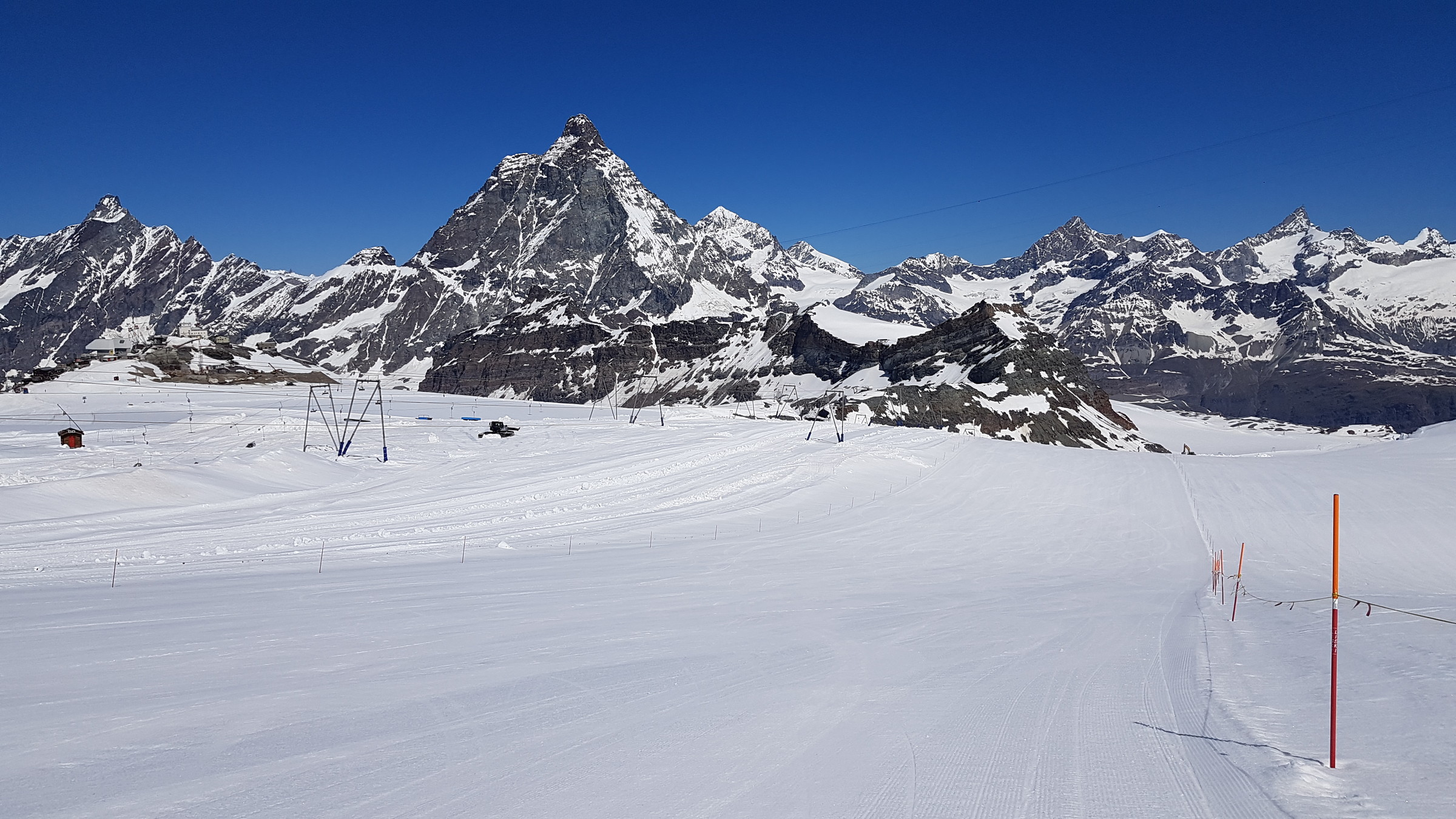 In Zermatt ist der SL Testa geöffnet (9:30-14), die 3S sowie der SL Plateau Breithorn. Auf Zermatter Seite war fast nichts los und wenig zerfahren bin selbst allerdings auch nur eine Runde dort gefahren). Der Bereich Plateau Rosa wird derzeit umfangreich hergerichtet. Dadurch wird man derzeit vom Klein Matterhorn kommend auf einen Steilhang geführt, den ich bisher gar nicht kannte (von oben gesehen sehr weit rechts).