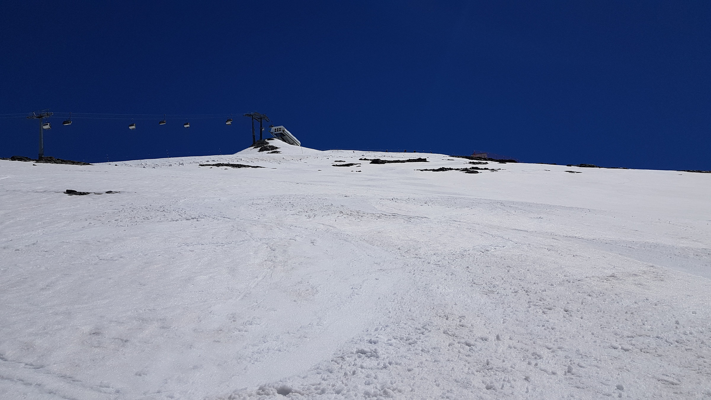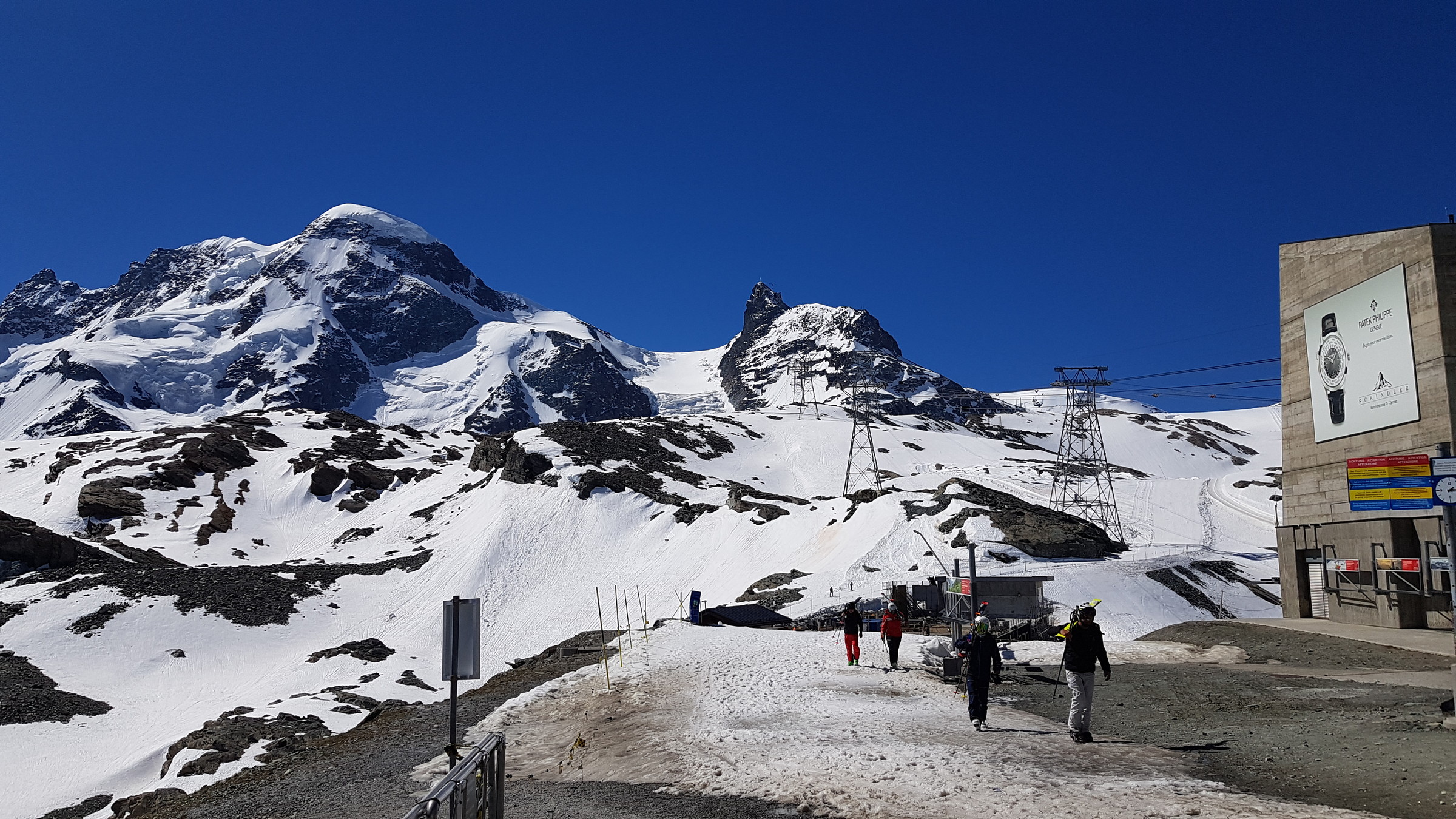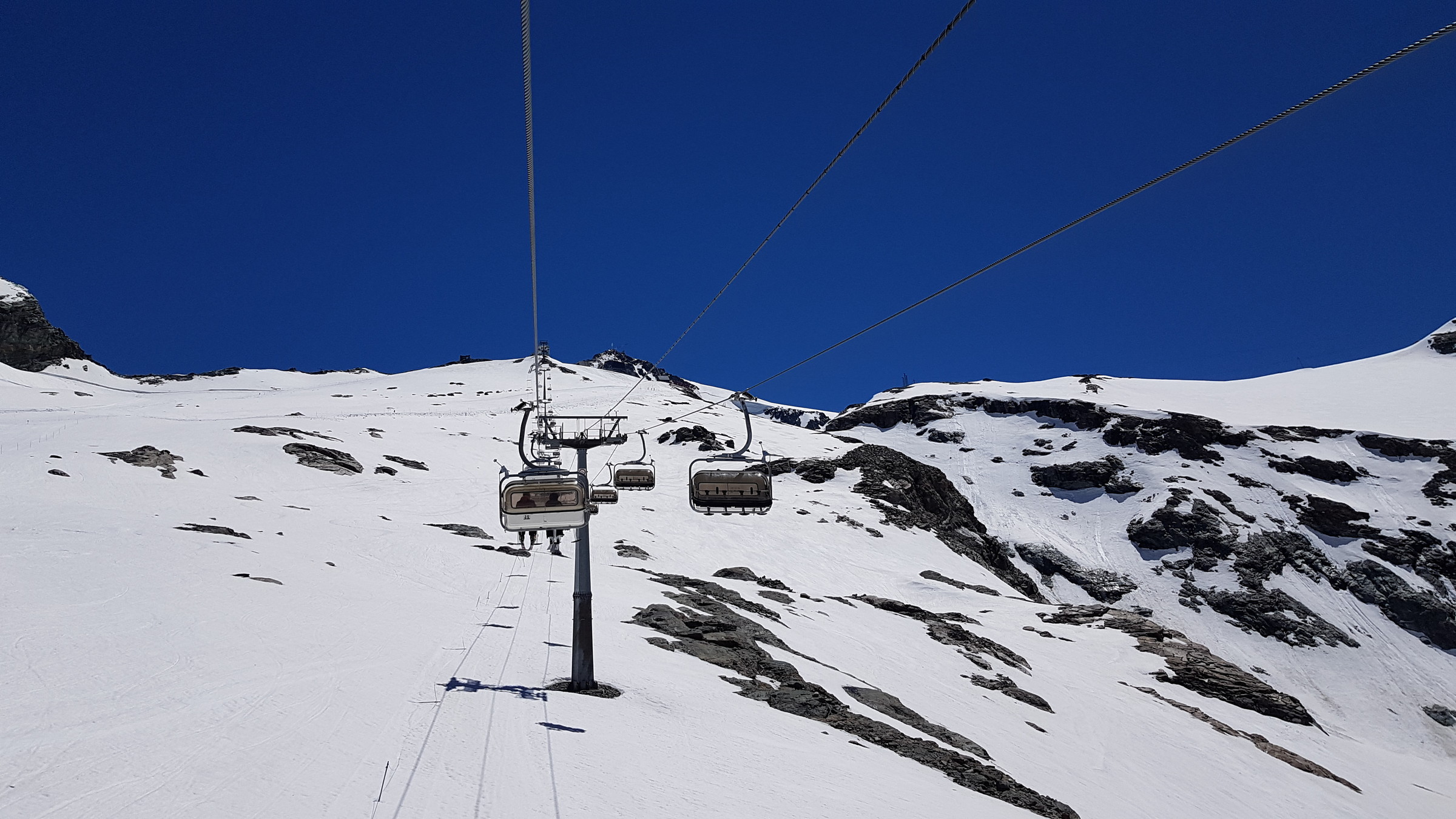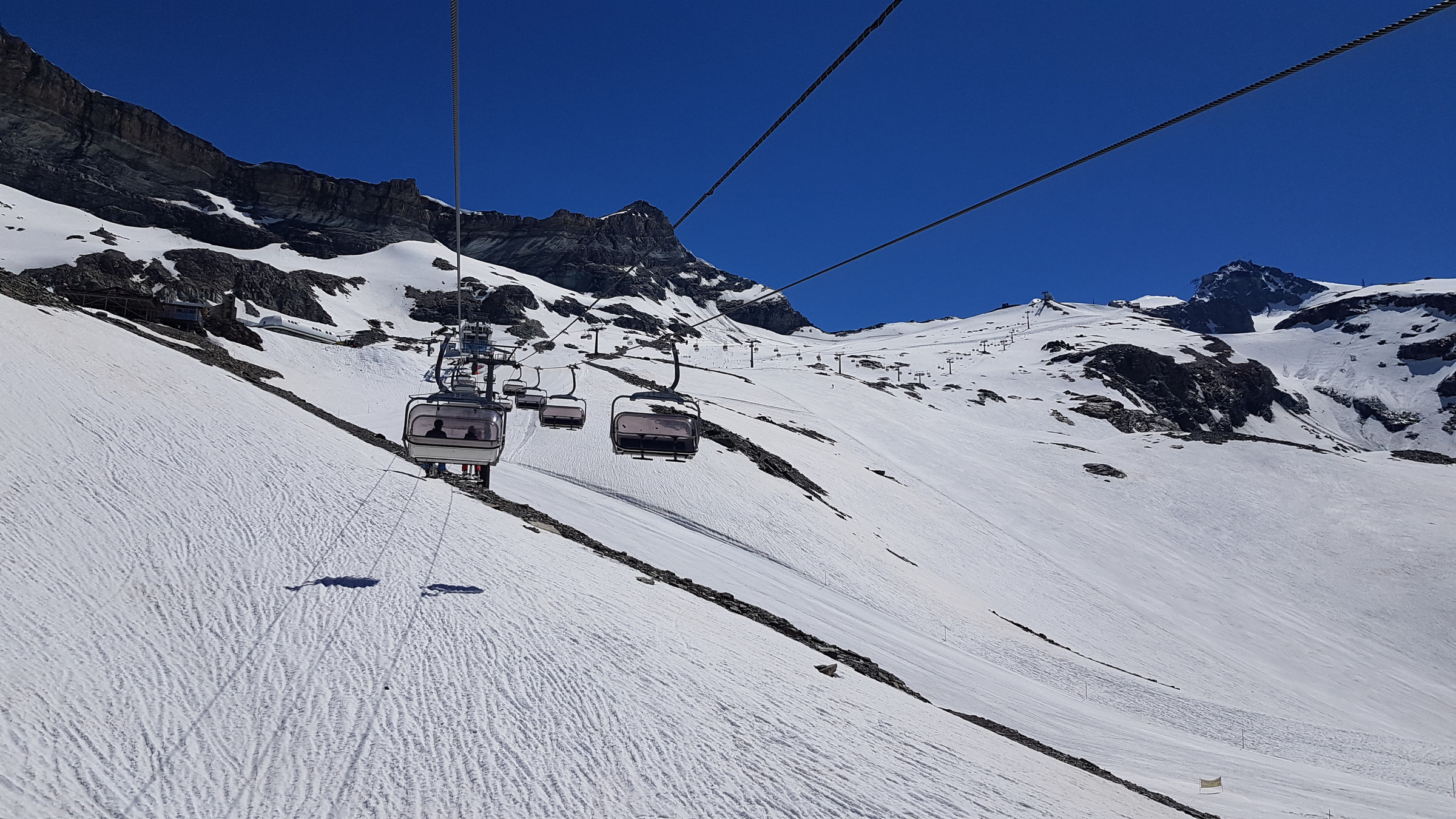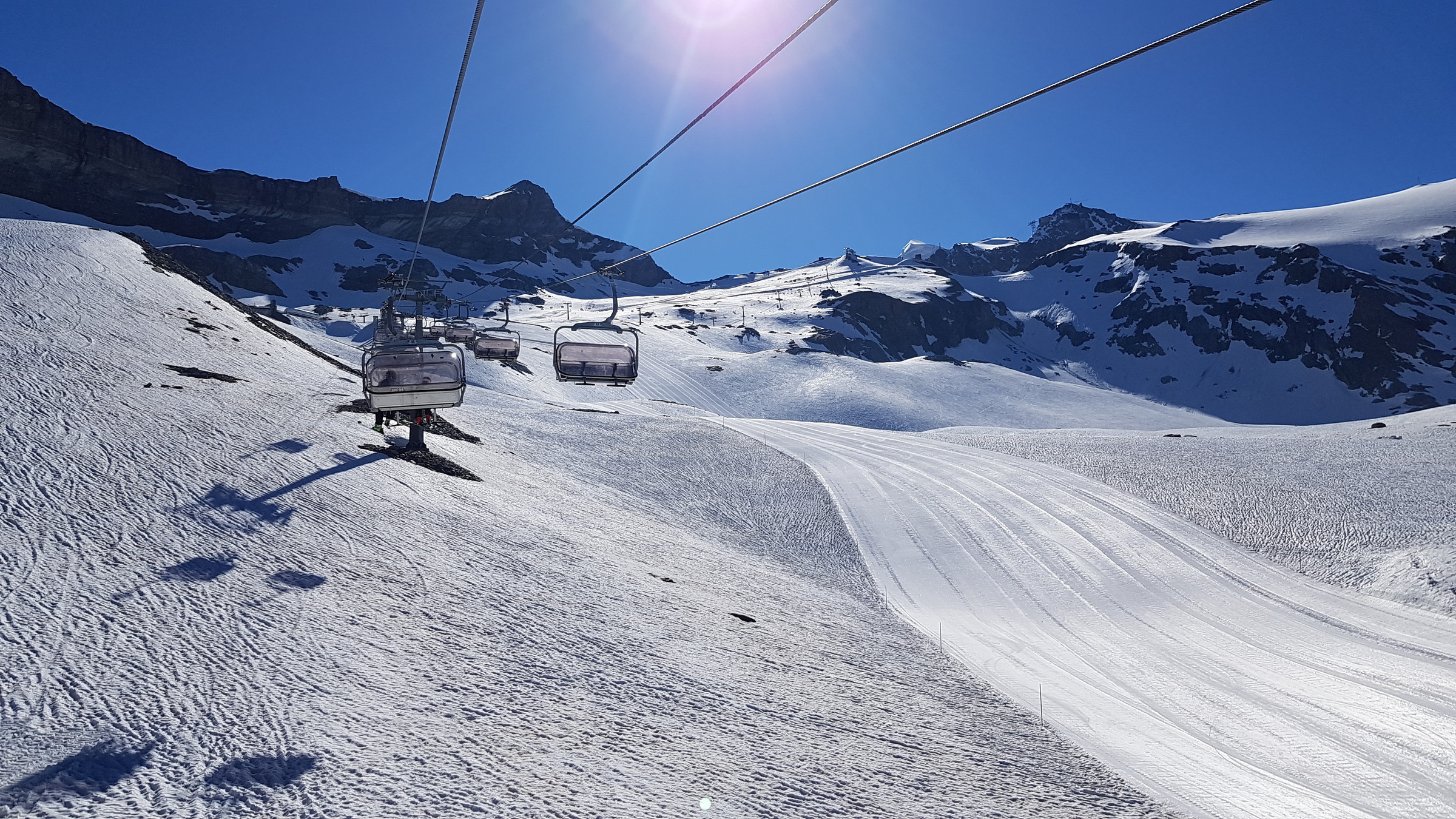 Der Schnee blieb lange hart (sehr angenehm nach der "weichen" Zeit in Österreich) und klebte auch danach nur an wenigen Stellen. Wirklich tolles Pistenfahren. Gelände generell gut verfestigt und am Bontadini schön zu fahren. Am Testa gab's zum Schluss sogar netten, glänzenden Firn. Die Pisten waren auch nicht allzu zerfahren, da der Andrang nur mittelmäßig war (nicht alle Tickets verkauft, vermutlich knapp 1.000). Wartezeiten mal wenige Sessel, in Zermatt wars leer.