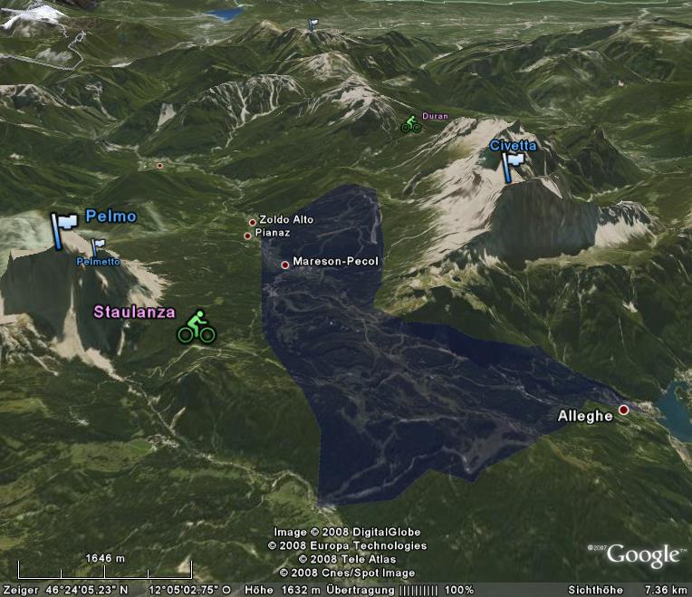 Da ich an diesem Montag einen 10jährigen im Blick behalten musste, der unbedingt mal einen Tag lang das Snowboarden lernen wollte (und das, soweit ich es als Skifahrer beurteilen kann, überragend gut gemacht hat), bin ich komplett auf der Nordseite des Pellegrino (im Bild bläulich eingefärbt) geblieben.