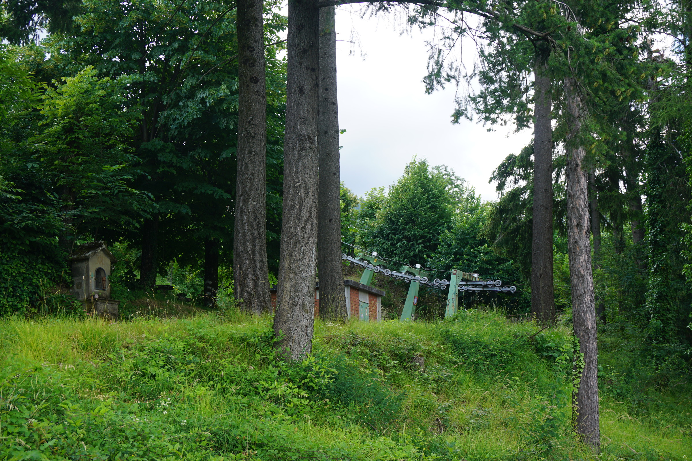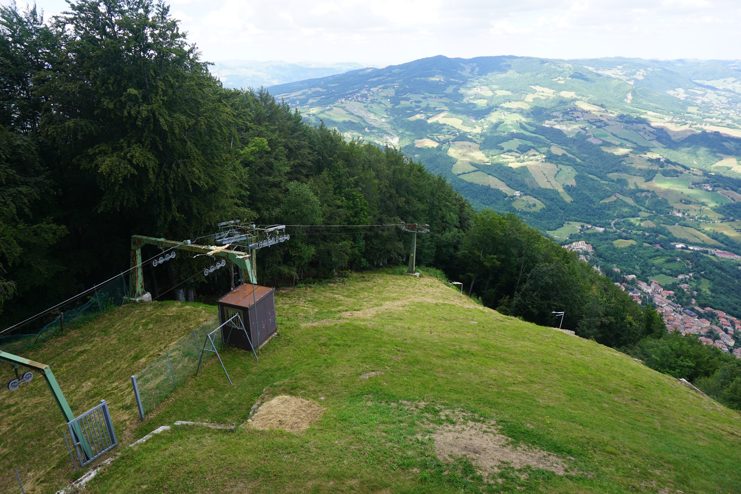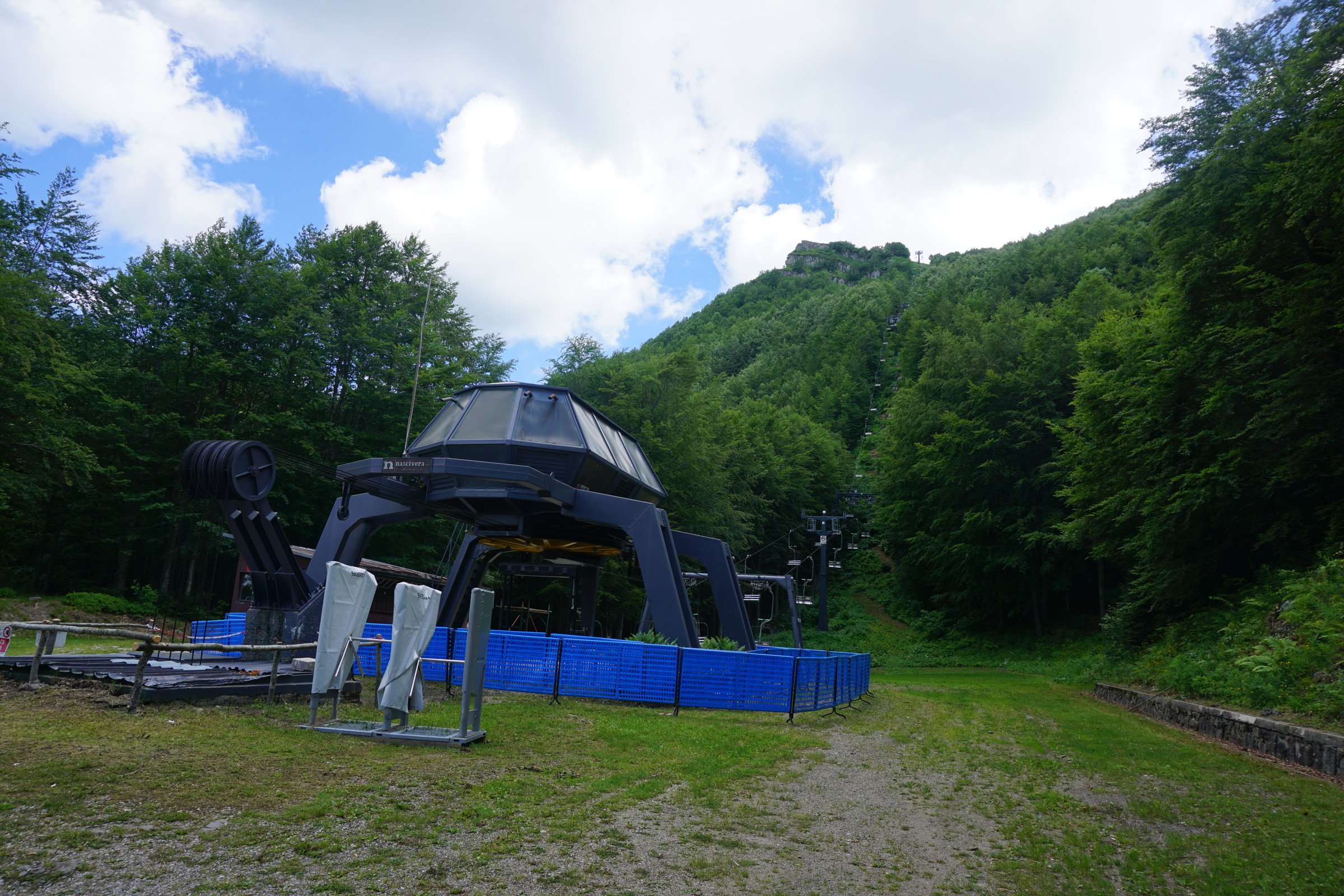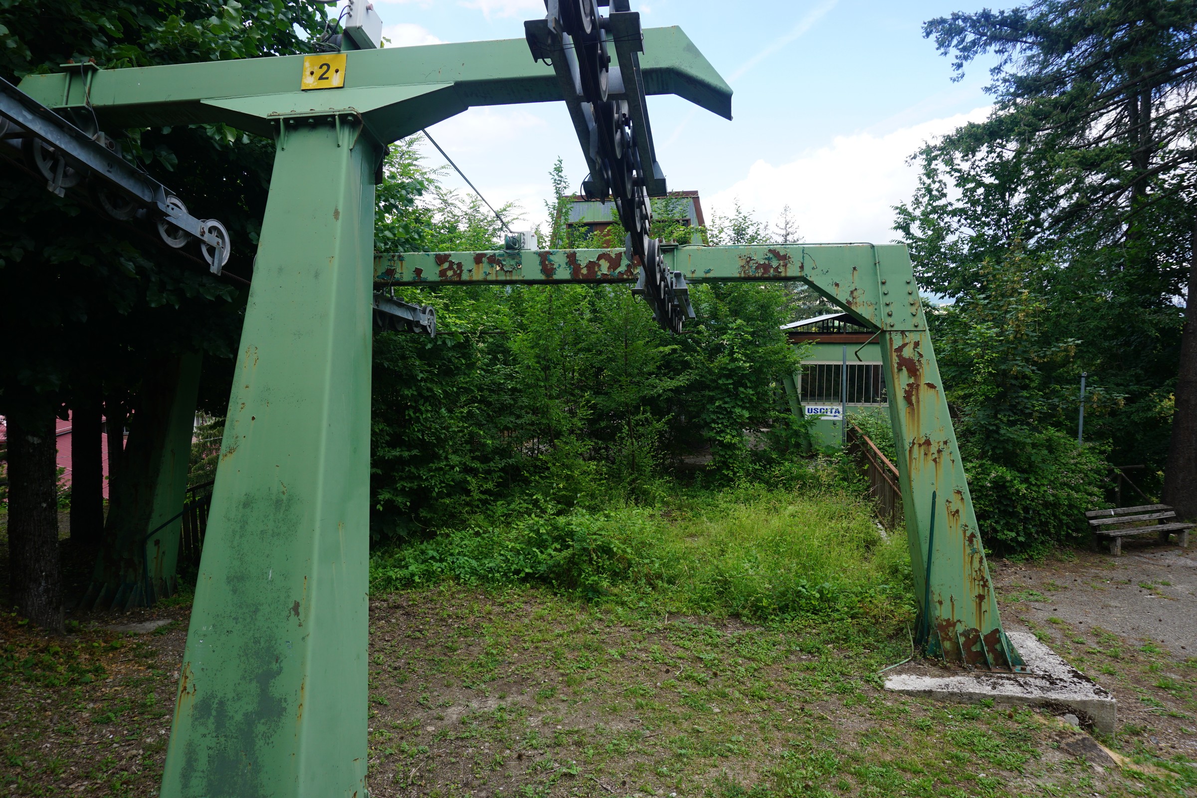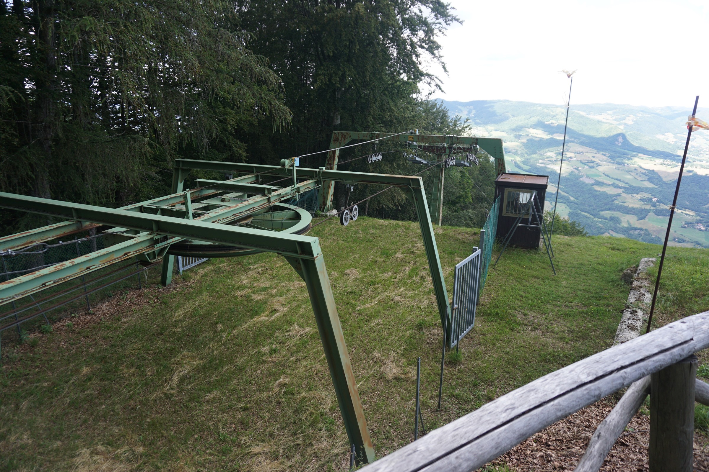 Vermutlich kann man davon ausgehen, dass das große Haus oben am Berg, vmtl. ein Hotel?, auch aufgelassen wurde. Ansonsten macht der Lift einen nicht so alten Eindruck, vermutlich aus den 70ern oder 80ern, d.h. die italiensiche 40-Jahres-Galgenfrist dürfte hier nicht der Grund für die Betriebseinstellung gewesen sein...