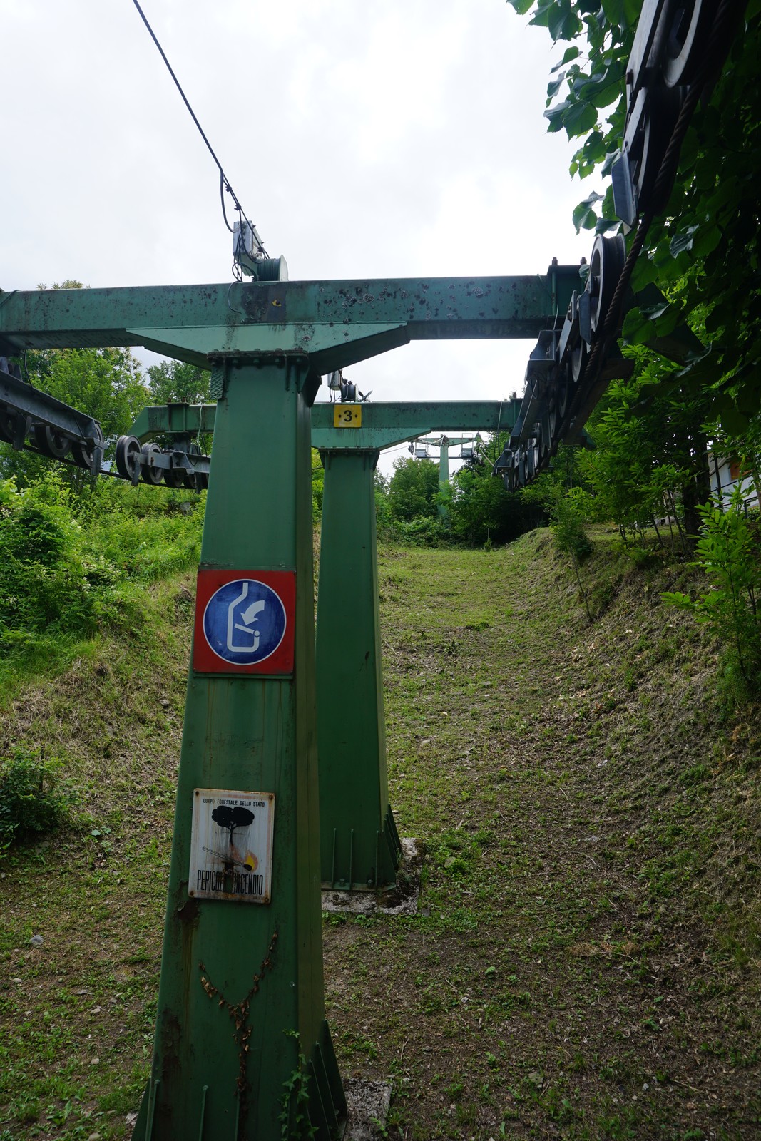 ^ Am Passo del Lupo, Blick zur kurzen DSB Colombaccio. Oben zu sehen die Seile der Pendelbahn