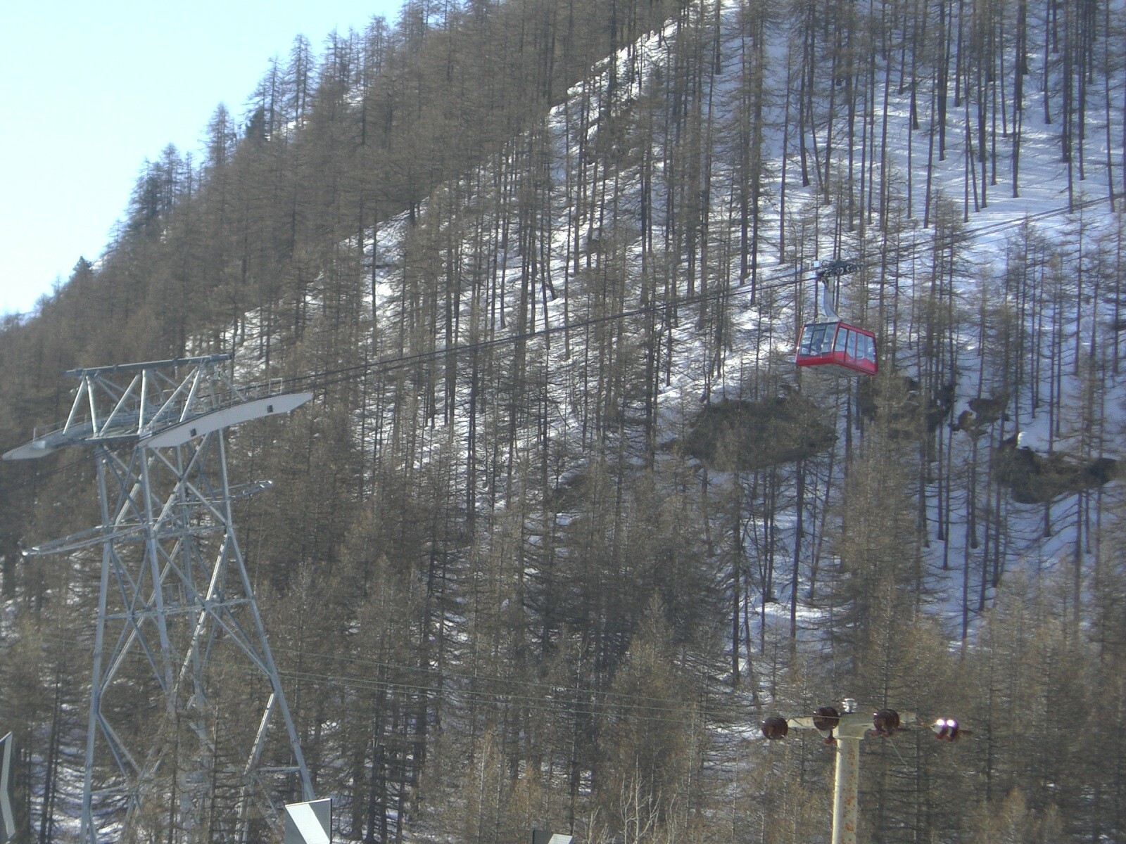 Die erste Fahrt der PB an diesem Morgen. Nachdem die Bahn in der Saison 2007/08 einen schweren Unfall hatte, bei dem die Kabinen mit recht hoher Geschwindigkeit in die Stationen gekracht sind, hat man die Bahn wieder instandgesetzt und die weißen Kabinen gegen rote Kabinen ausgetauscht. Ca. 150m von der PB Talstation entfernt startet diese seltene, alte 2SB von Piemont Funivie.