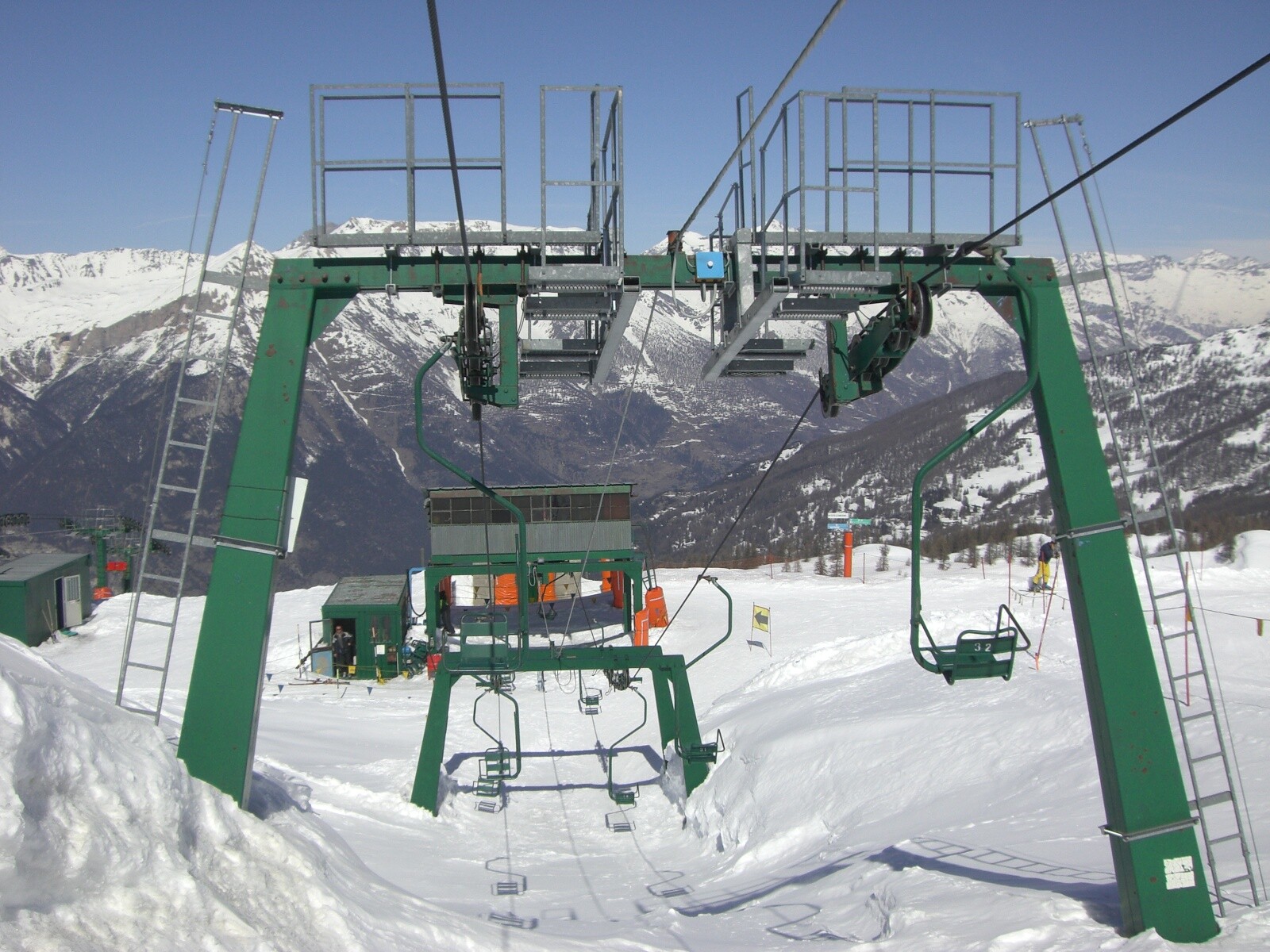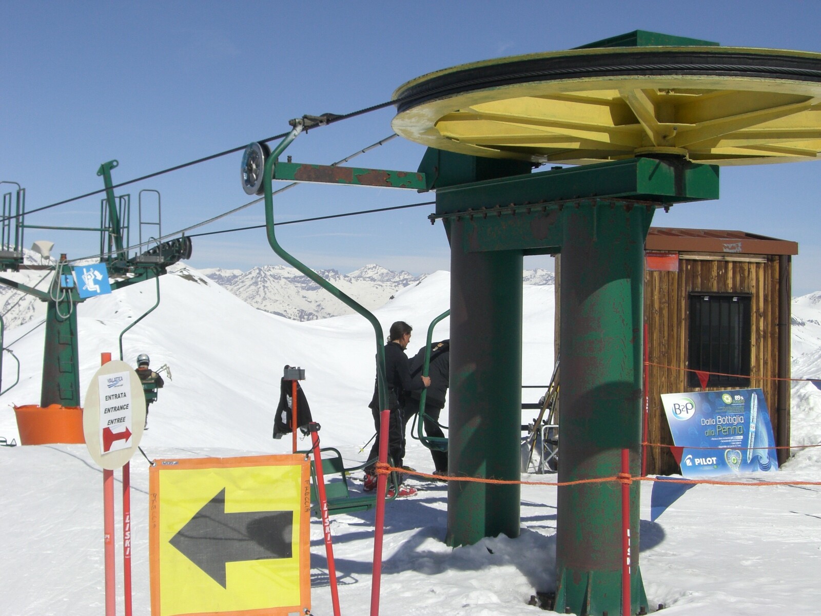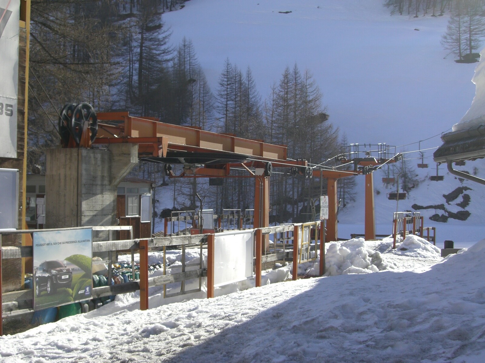 Talstation des Marchisio Lifts, links daneben die Bergstationen der beiden Doppelsesselbahnen. Der ESL Treceira war eine Verbindungbahn die in beide Richtungen benutzt wurde und in der Mitte der Strecke durch eine kleine Senke verlief. Genutzt wurde die Bahn, um vom Col Basset direkt in den östlichen D`Oulx Sektor (und andersrum) zu kommen, ohne den unter dem ESL liegenden Talkessel und die dort platzierten Lifte benutzen zu müssen. Wirklich nötig war der Lift eigentlich nicht, er hat aber die angesprochenen Lifte entlastet. In den letzten Jahren war der Lift aber nurmehr am Wochenende in Betrieb. Der ESL hatte im unteren Teil der Strecke eckige Stützen inklusive 3 Portalstützen, ab ca. 2/3 der Strecke wurden die typischen runden Marchisio Stützen verwendet. Vermutlich wurden beim Wiederaufbau Stützen von verschiedenen Liften verwendet. Sessel mit Kindersitz im Detail Blick vom ESL in den östlichen Teil des Skigebietes von Pragelato. Links bei den Schneisen fuhr bis vor wenigen Jahren ein ESL der mittlerweile auch stillgelegt ist, rechts oben ist einer der aktuellen Schlepper zu sehen. Bergstation des ESL Am Col Basset dann die Bergstation der gleichnamigen 6EUB die von Sestriere die zweite Verbindung in den Sauze D`Oulx Sektor hergestellt hat. Die Anlage ist von Leitner auch wenn die Station ein wenig nach Agudio aussieht. Die Kabinen waren in back to back Anordnung ausgeführt, d. h. jeder Fahrgast hatte optimale Aussicht. Teil der oberen Sektion der Col Basset EUB. Im Hintergrund der Monte Motta/Banchetta Vorne die Mittelstation der EUB dahinter der Monte Motta Sektor mit der PB Bergstation, diversen Sesselbahnen und Schleppliften und oben der geniale Motta Gipfellift. An der Mittelstation ist die Piste zu Ende und ich muss mit der EUB wieder zu meinem Ausgangsort nach Sestriere/Borgata zurückfahren. Nach der Stilllegung der EUB diesen Sommer ist an dieser Stelle wieder eine Talabfahrt nach Sestriere im Pistenplan eingezeichnet die es früher wohl schon einmal gab, deren Verlauf ich aber letzten Winter nicht komplett ausmachen konnte. Erste Sektion der mittlerweile stillgelegten EUB hinter den Häusern Um 13:15Uhr beende ich meine Erkundung des östlichen Teils der Via Lattea, um aus Zeitgründen mit dem Auto in den westlichen Teil zu fahren und dort den Nachmittag auf den Pisten von Montgenevre und Claviere zu verbringen.