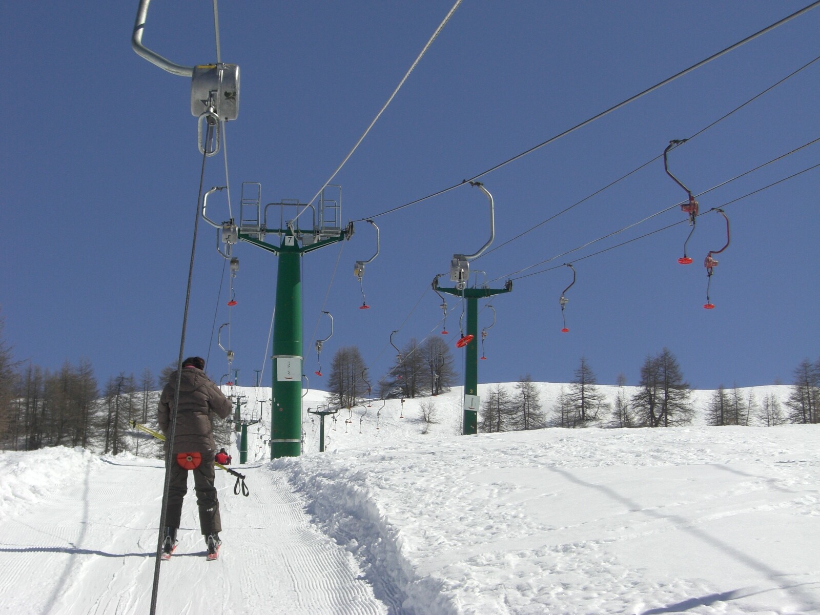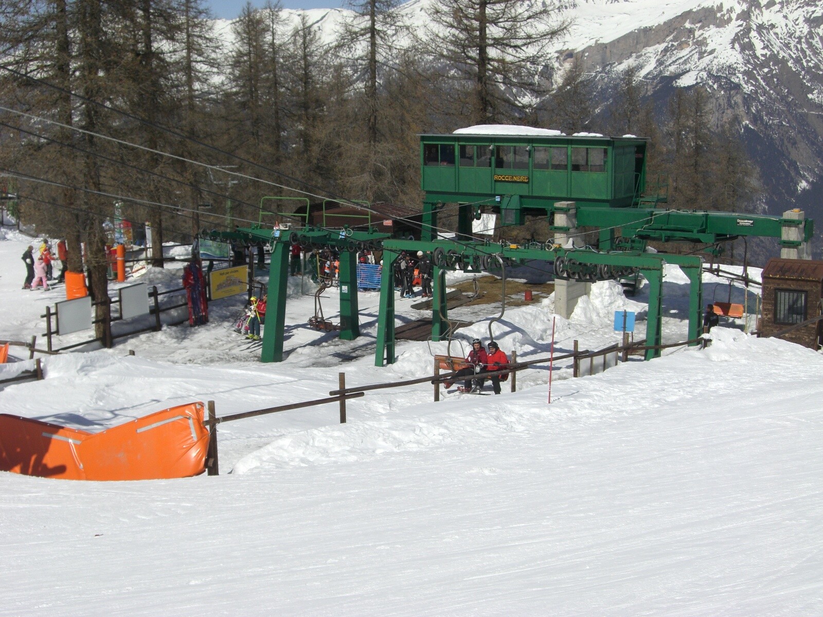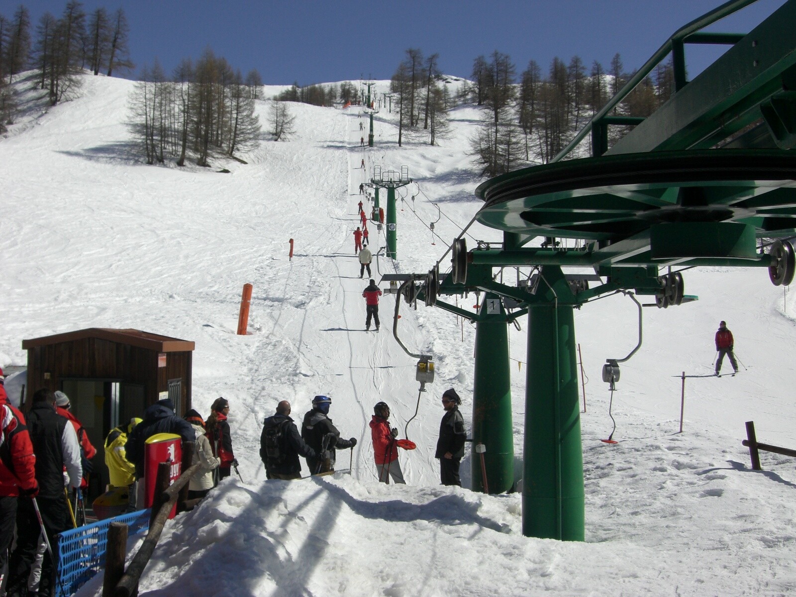 Talstation des Marchisio Lifts, links daneben die Bergstationen der beiden Doppelsesselbahnen. Der ESL Treceira war eine Verbindungbahn die in beide Richtungen benutzt wurde und in der Mitte der Strecke durch eine kleine Senke verlief. Genutzt wurde die Bahn, um vom Col Basset direkt in den östlichen D`Oulx Sektor (und andersrum) zu kommen, ohne den unter dem ESL liegenden Talkessel und die dort platzierten Lifte benutzen zu müssen. Wirklich nötig war der Lift eigentlich nicht, er hat aber die angesprochenen Lifte entlastet. In den letzten Jahren war der Lift aber nurmehr am Wochenende in Betrieb. Der ESL hatte im unteren Teil der Strecke eckige Stützen inklusive 3 Portalstützen, ab ca. 2/3 der Strecke wurden die typischen runden Marchisio Stützen verwendet. Vermutlich wurden beim Wiederaufbau Stützen von verschiedenen Liften verwendet. Sessel mit Kindersitz im Detail Blick vom ESL in den östlichen Teil des Skigebietes von Pragelato. Links bei den Schneisen fuhr bis vor wenigen Jahren ein ESL der mittlerweile auch stillgelegt ist, rechts oben ist einer der aktuellen Schlepper zu sehen. Bergstation des ESL Am Col Basset dann die Bergstation der gleichnamigen 6EUB die von Sestriere die zweite Verbindung in den Sauze D`Oulx Sektor hergestellt hat. Die Anlage ist von Leitner auch wenn die Station ein wenig nach Agudio aussieht. Die Kabinen waren in back to back Anordnung ausgeführt, d. h. jeder Fahrgast hatte optimale Aussicht. Teil der oberen Sektion der Col Basset EUB. Im Hintergrund der Monte Motta/Banchetta Vorne die Mittelstation der EUB dahinter der Monte Motta Sektor mit der PB Bergstation, diversen Sesselbahnen und Schleppliften und oben der geniale Motta Gipfellift. An der Mittelstation ist die Piste zu Ende und ich muss mit der EUB wieder zu meinem Ausgangsort nach Sestriere/Borgata zurückfahren. Nach der Stilllegung der EUB diesen Sommer ist an dieser Stelle wieder eine Talabfahrt nach Sestriere im Pistenplan eingezeichnet die es früher wohl schon einmal gab, deren Verlauf ich aber letzten Winter nicht komplett ausmachen konnte. Erste Sektion der mittlerweile stillgelegten EUB hinter den Häusern Um 13:15Uhr beende ich meine Erkundung des östlichen Teils der Via Lattea, um aus Zeitgründen mit dem Auto in den westlichen Teil zu fahren und dort den Nachmittag auf den Pisten von Montgenevre und Claviere zu verbringen.