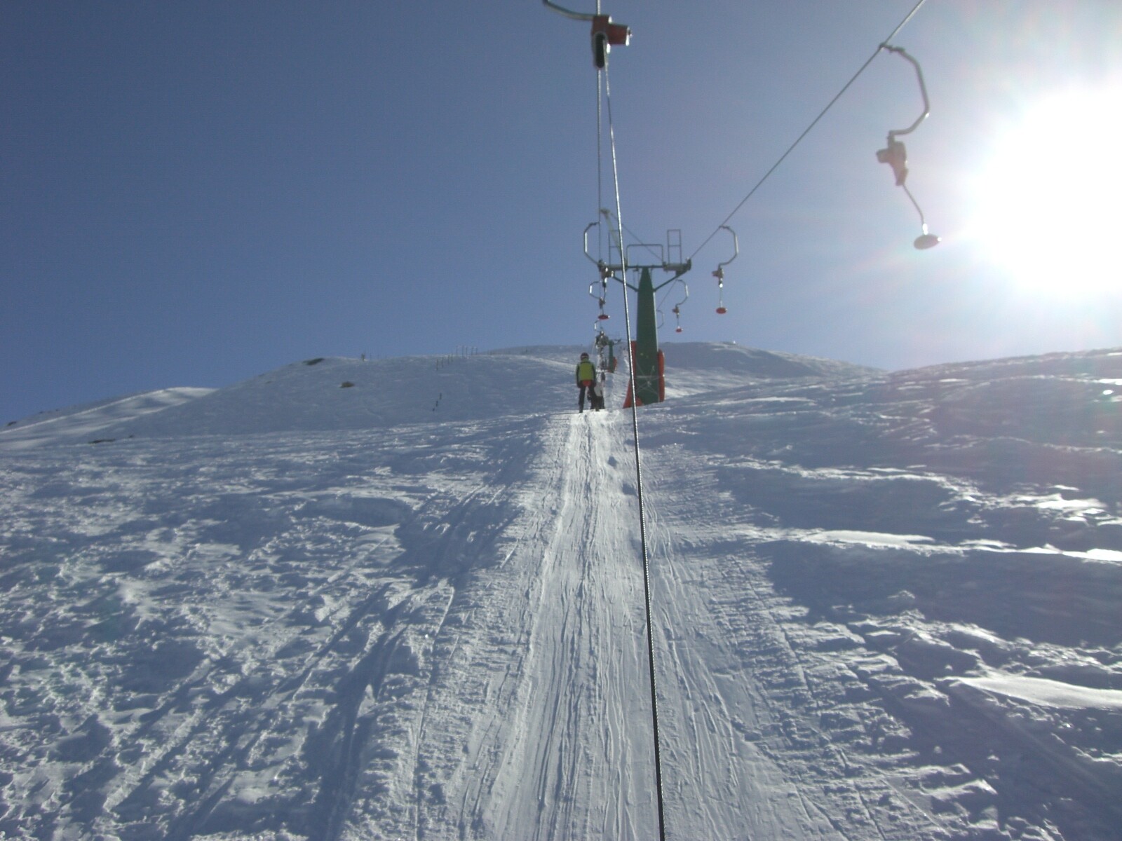 Der Rückbringer zum Monte Fraiteve ist dieser noch relativ neue gedoppelte CCM Schlepper von 2004 der eine der Hauptverbindungen im Schigebiet darstellt. Wenn nicht gerade Ferien oder Wochenende ist läuft meist nur einer der Schlepper. Je nach Bedarf wird auch der Zweite in Betrieb genommen. Oberer Streckenteil der Doppelschlepper Fraiteve 1&2 mit Monte Fraiteve im Hintergrund. Komischerweise hat man sowohl den Schlepplift als auch die EUB nicht bis ganz nach oben auf den Berg gebaut (vermutlich weil da noch die alte PB Bergstation steht), so dass man, wenn man nach Sauze D`Oulx wechseln will noch ein Förderband für die letzten 15 Hm nutzen muss.