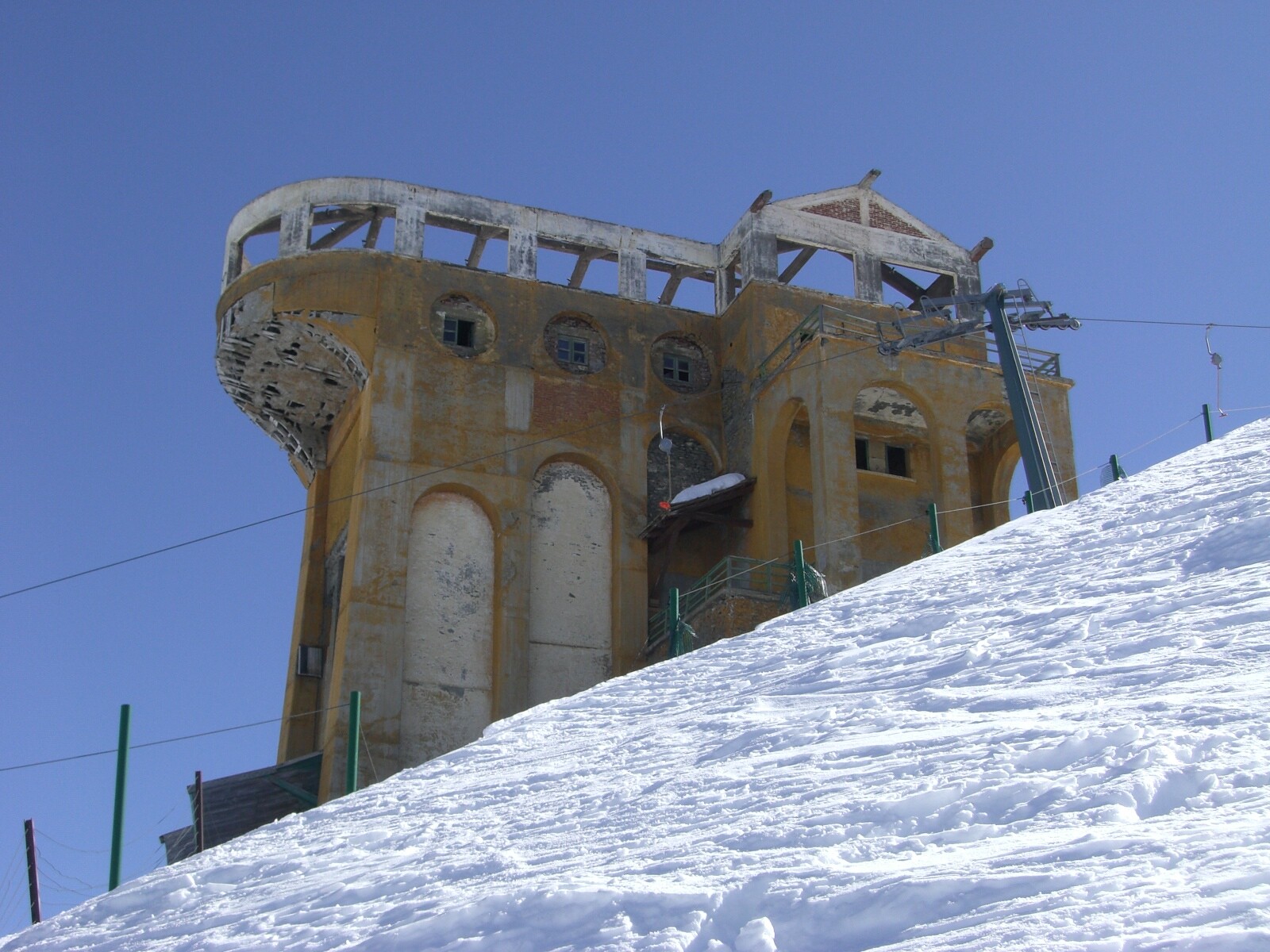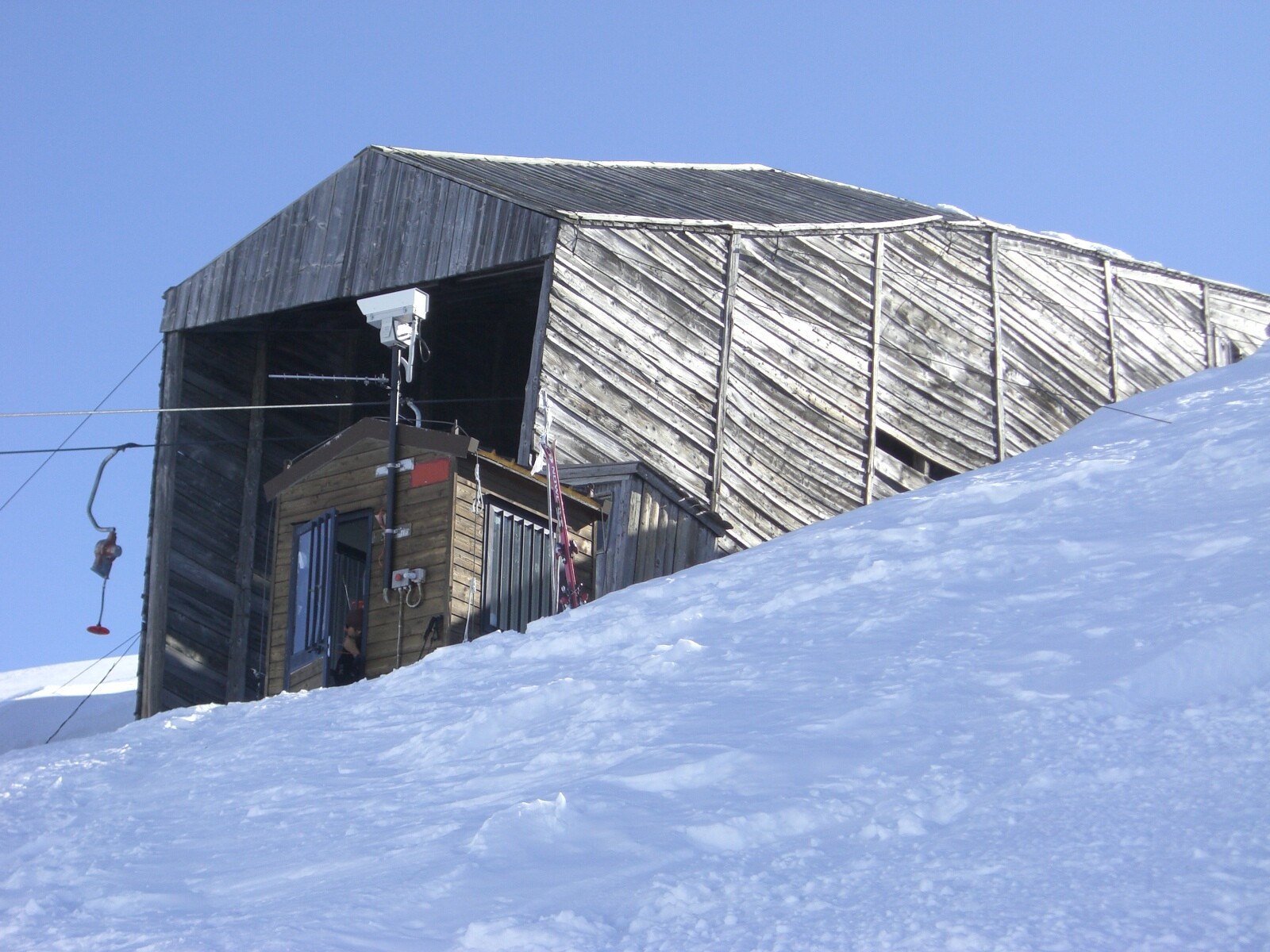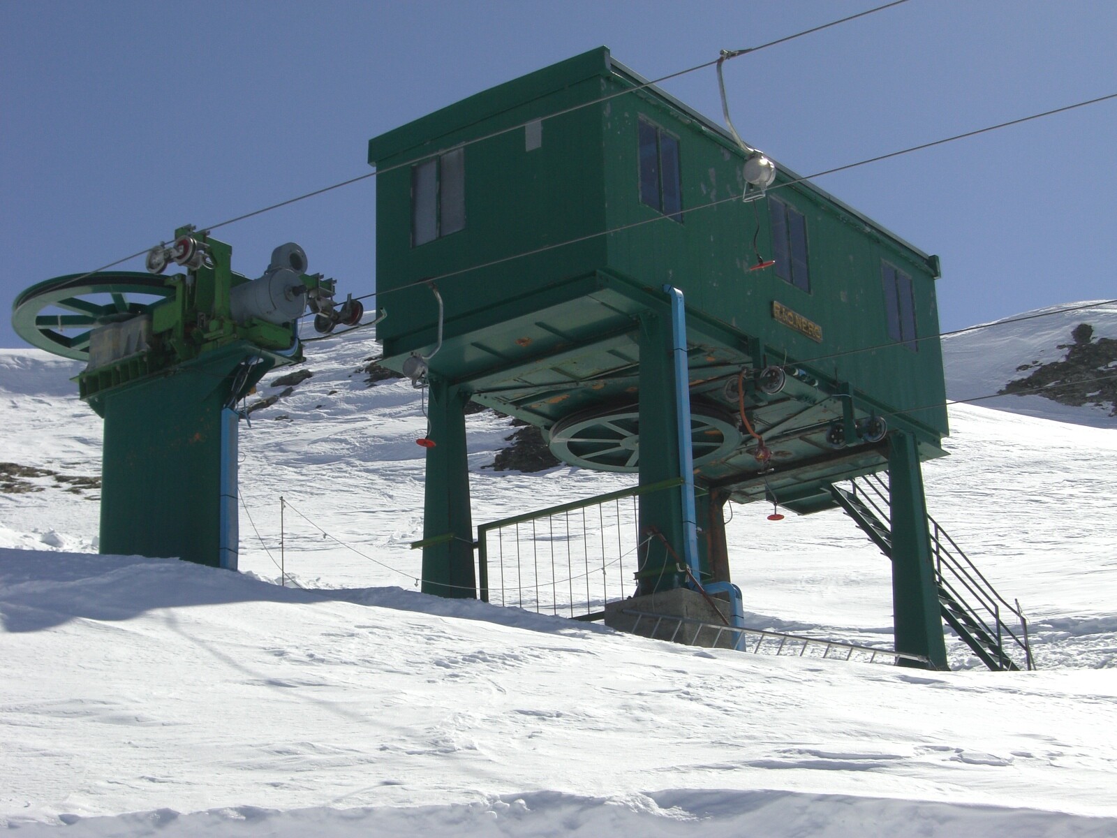 Weiter geht es mit einer weiteren Agudio POMA 4KSB auf den Monte Sises. Interessante Station… Daten der Bahn mit seltener Herstellerangabe Blick aus der 4KSB Cit Roc auf den verbauten zentralen Bereich südlich von Sestriere. Dahinter der Monte Motta mit seinen genialen Abfahrten. Aus dieser Perspektive kann man ansatzweise ahnen wie steil die Pisten wirklich sind. Die rechte Piste ist noch ein wenig steiler als die linke Weltcup-Piste. Im oberen Streckenteil kreuzt die 4KSB Cit Roc die 4SB Garnel. Dahinter der Monte Sises mit dem Kurvenlift und der dazugehörigen schwarzen Piste. Im Leitner Kurverschlepper Monte Sises. Die Fangnetze links sollen den Schnee zusammenhalten der hier oft vom Wind weggeweht wird. Links oben die Ruine der einspurigen stillgelegten PB. Zwei Kurven direkt nacheinander. Der Lift ist übrigens nur in den Weihnachts- und Osterferien und an Wochenenden außerhalb dieser Zeiten im Betrieb. Am Anfang der Saison ist der Lift zudem häufig wegen Schneemangel nicht in Betrieb. An der Bergstation mit Blick nach Südwesten. Hier gäbe es noch viele Hänge die man erschließen könnte… Direkt neben der Bergstation steht dieses Monument der Seilbahngeschichte. Ich find es genial das diese Ruine hier noch steht und die gelbe Bemalung hat sooo viel Style. Ruine von schräg unten. Vermutlich war früher oben in der Station ein Panoramarestaurant drin. Dann fahre ich die steile Piste neben dem Schlepper Richtung Tal hinunter und genieße dabei den genialen Blick von oben auf Sestriere. Leider habe ich keine Zeit für eine Wiederholungsfahrt.