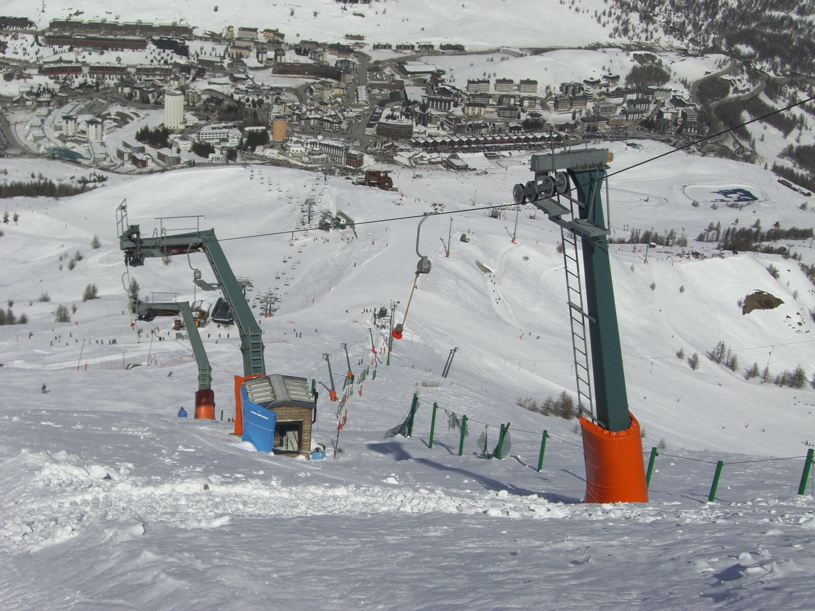 Zwischen der Piste und dem Ort ist der Verbindungsbereich zwischen dem Motta und dem Sises Sektor zu sehen der durch ein 4KSB und eine 4SB erschlossen wird. Die 4KSB ist laut Pistenplan immer in Betrieb die 4SB nur bei Bedarf (vor allem am Wochenende und in den Ferienzeiten). Wieder eine LSAP Talstation mit Trasse zwischen Motta und Sises Sektor. In diesem Bereich gibt es heute keinen Lift mehr. Allerdings machen das Gebäude und vor allem das Dach noch einen sehr neuen Eindruck. Bin etwas ratlos was das mal war. Im Hintergrund am Berg oben wieder die Ruine der Monte Sises PB Bergstation. Hier will ich nun als nächstes hinfahren. Weiter geht es mit der 4KSB Trebials, eine der zwei Verbindungsbahnen zwischen Motta und Sises Sektor. Nett ist auch die inoffizielle schmale Buckelpiste die unter der Bahn durch den Lärchenwald führt. Waren die Pisten und Lifte bisher recht leer, erwartet mich nun direkt oberhalb von Sestriere ein Gewusel aus Skischulgruppen und anderen Skifahrern auf einem unendlich breiten Hang durchzogen von Liften, Flutlichtmasten, Schneilanzen etc. An diesem Hang finden übrigens die Weltcup Slalom (Nacht-) Rennen statt und auch bei Olympia wurde hier um Medaillen gefahren. Hinter Sestriere ist gut die eckig in den Hang hinein geholzte Talabfahrt vom Monte Fraiteve nach Sestriere zu erkennen die mitten im Dorf endet. Die Piste war zwischenzeitlich einige Jahre aus dem Pistenplan verschwunden und sieht auch schon ein wenig zugewachsen aus. Dieser Bereich hat mir im ganzen Skigebiet am wenigsten gefallen, weil alles ziemlich verbaut war und zu viele Leute auf der Piste waren. Andererseits muss man wiederum auch sagen, dass sich fast alle Anfänger und Skischulgruppen hier ausgetobt haben und die anderen Pisten recht leer waren und vor allem keine überforderten Anfänger auf den anspruchsvollen Pisten anzutreffen waren. Das steht ganz klar im Gegensatz zu Österreich wo alle Anfänger am zweiten Tag denken sie kämen überall runter und aufgrund der oft alles erschließenden KSBs und EUBs auch überall hoch kommen. Hier ist es ein wenig anders. An vielen anspruchsvollen Pisten findet die Selektion schon über die steilen Schlepplifte statt.