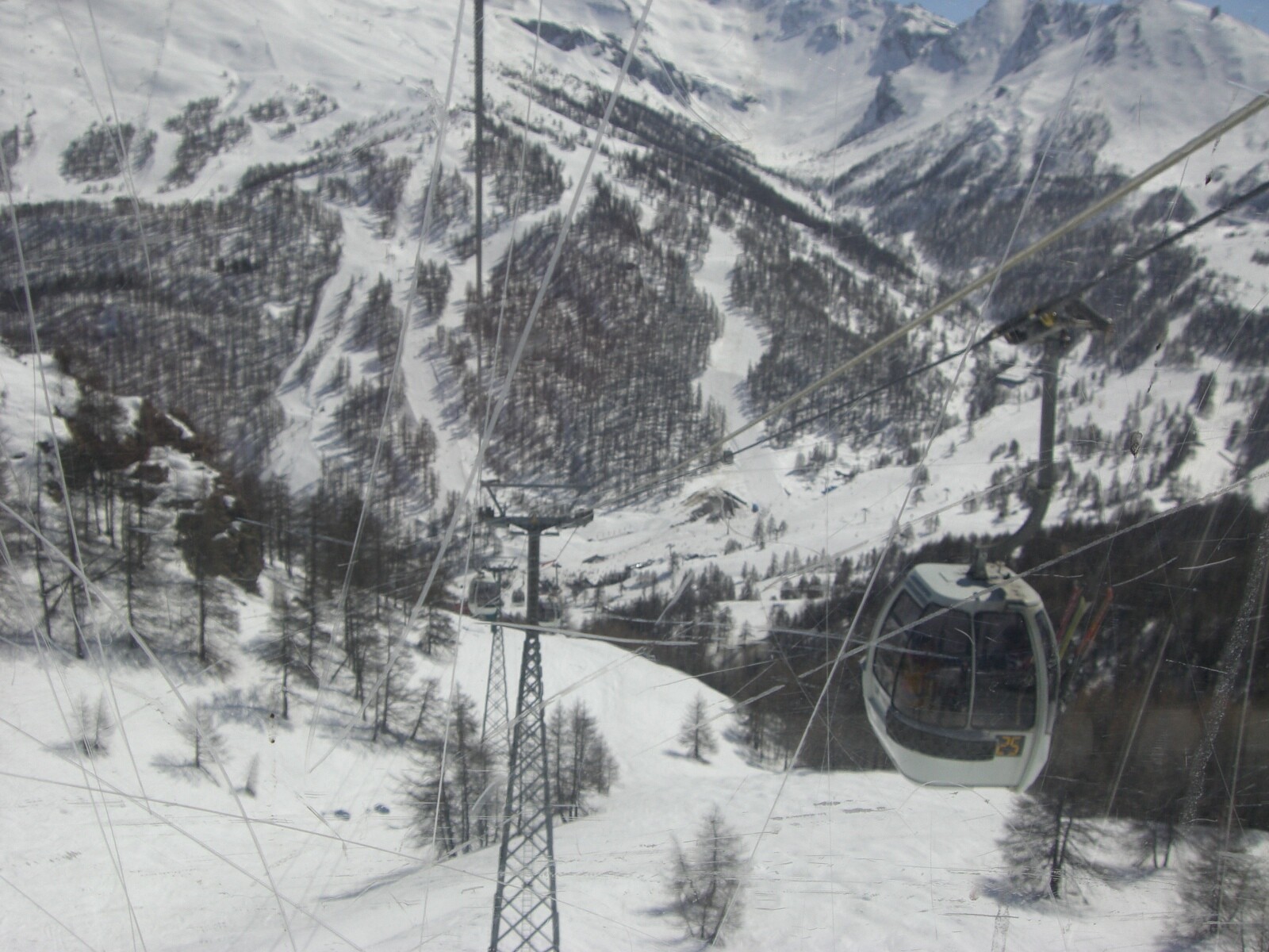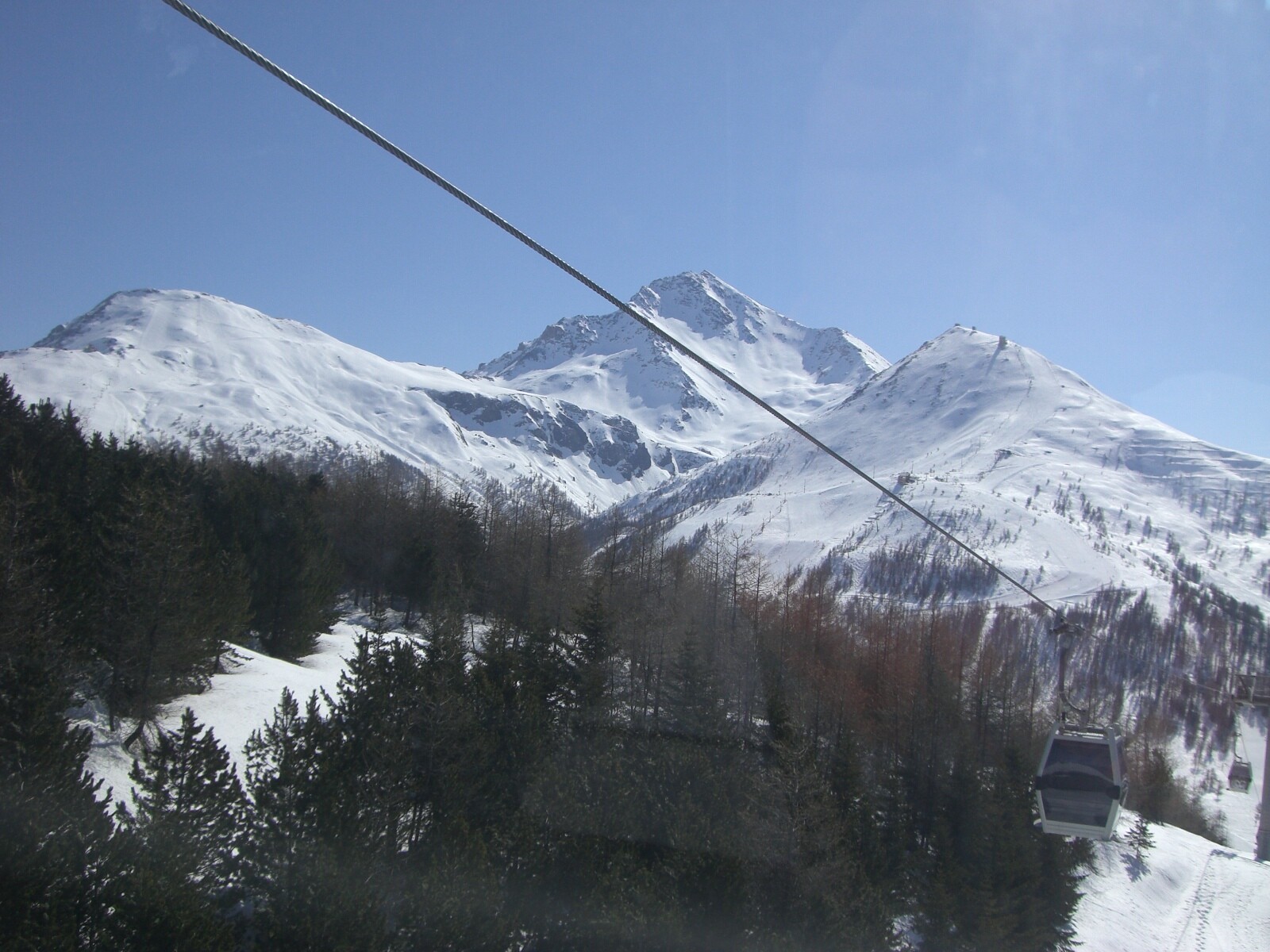 Bei der Auffahrt von Cesana nach Sestriere sieht es nicht nach viel Schnee aus. Die auffälligen Hoteltürme sind das Erste was man von Sestriere sieht. Da ich noch eine halbe Stunde Zeit habe bis die Lifte aufmachen, beschließe ich noch kurz in Pragelato vorbeizuschauen, das hinter Sestriere wieder im Tal unten liegt. Zu sehen ist die Strecke der Leitner 60PB die 2005 als Neuerschließung während der Olympiavorbereitungen gebaut wurde und als reiner Zubringer von Pragelato nach Sestriere fungiert. Die PB ist die erste PB die nach langer Zeit ohne PBs in der Via Lattea wieder gebaut wurde. Früher gab es hier mal mindestens 5 PBs. Aufgrund der schattigen Lage der PB Strecke und des ansprechenden Gefälles könnte man hier sicher auch eine Piste bauen, allerdings müsste man dazu eine Schneise in den Wald holzen.