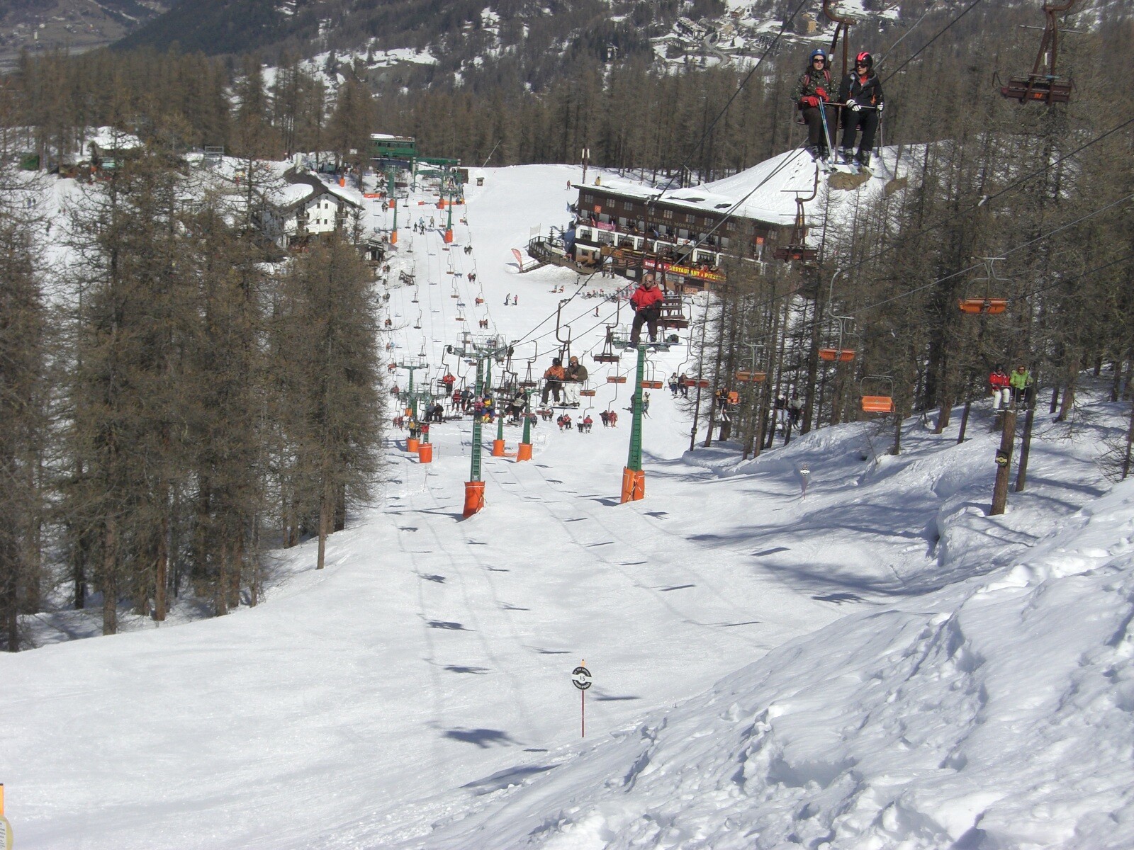 Hinten runter entscheide ich mich für eine unpräparierte steile schwarze Piste die toll trassiert Richtung Sauze D`Oulx führt. Weiter unten mündet sie in die flacher und breiter auslaufende Piste am Kurvenschlepper Rio Nero Sansicario. Dieser Lift diente bisher als einziger direkter Rückbringer von D`Oulx nach Sansicario und führte über einen nördlich dem Monte Fraiteve vorgelagerten Bergkamm.