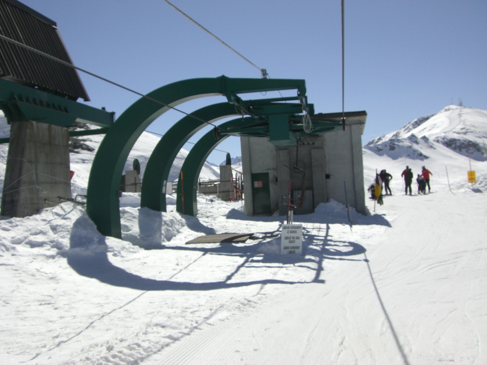 Ich habe mir noch überlegt, ob ich nicht auch noch kurz hier am Vormittag in Pragelato fahren soll, dies aber dann wieder verworfen, da die Zeit für eine Ausflug nach Montgenevre am Nachmittag dann nicht mehr gereicht hätte. Talstation im Detail Nach diesem kurzen Stop in Pragelato ging es wieder zurück nach Sestriere, wo ich mit der 4KSB Nouva Nube von Agudio POMA im Ortsteil Borgata Richtung Monte Motta starte. Im Hintergrund sieht man die 6EUB die in 2 Sektionen zum Col Basset führt und leider diesen Sommer ersatzlos stillgelegt wurde. Etwa auf der Hälfte der Strecke der 4KSB wird diese vom SL Nube gekreuzt. Dieser Marchisio Lift, der unten eine extrem steile Lifttrasse hat, war an diesem Sonntag nicht in Betrieb. Vermutlich dürfte er nur noch sehr selten, wenn überhaupt noch als Entlastung der 4KSB in Betrieb sein. Blick nach Osten mit dem Skigebiet von Pragelato im Hintergrund. Links sieht man (leider etwas unscharf) die letzte Stütze und die Bergstation der Verbindungs-PB von Pragelato. Die 4SB Anfiteatro in der Mitte stellt die Verbindung zum Skigebiet nach Sestriere sicher. Hinter der 4SB steht noch ein sehr alter Marchisio SL (mit den dicken Stützen). Laut Pistenplan ist auch dieser Lift nur noch bei Bedarf in Betrieb. Schade eigentlich, erschließt er doch auf der Ostseite eine schwarze steile Piste, die man mit der Sesselbahn nicht erreicht. Schön in die Landschaft integrierter Speicherteich unterhalb der 4KSB Nouva Nube. Blick auf Sestriere und schön trassierte dem natürlichen Gelände folgende Piste im Vordergrund Blick zum Monte Sises der früher durch eine PB, heute durch einen Schlepplift erschlossen wird. Kurz vor der Bergstation der Nouva Nube 4KSB. Rechts ist die Bergstation der stillgelegten PB zu sehen, die früher von Sestriere hier herauf führte. Das Gebäude wird heute als Restaurant und Hotel genutzt. Bergstation der POMA Agudio Bahn Dann geht es weiter zum SL Motta der schon 1959 gebaut wurde, mittlerweile jedoch eine neue Talstation und Antrieb bekommen hat.