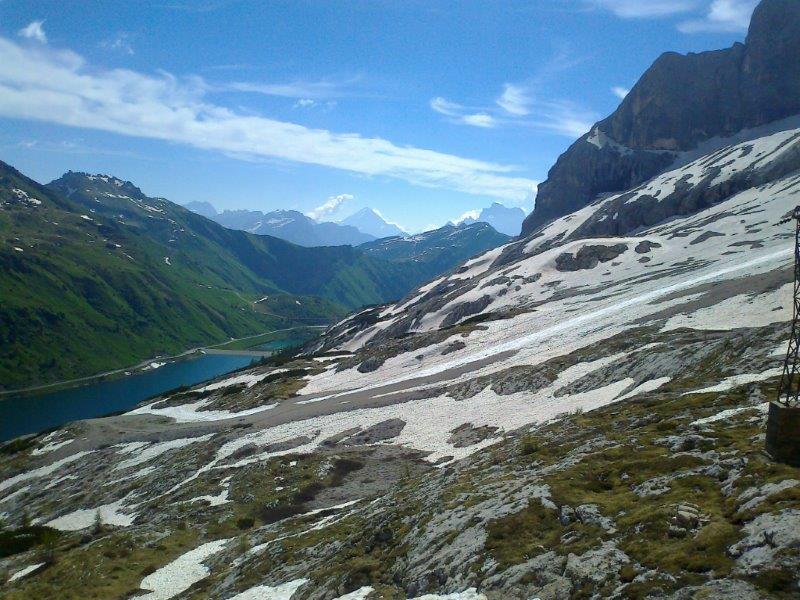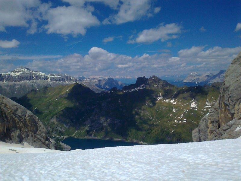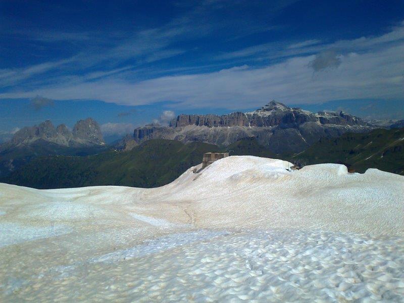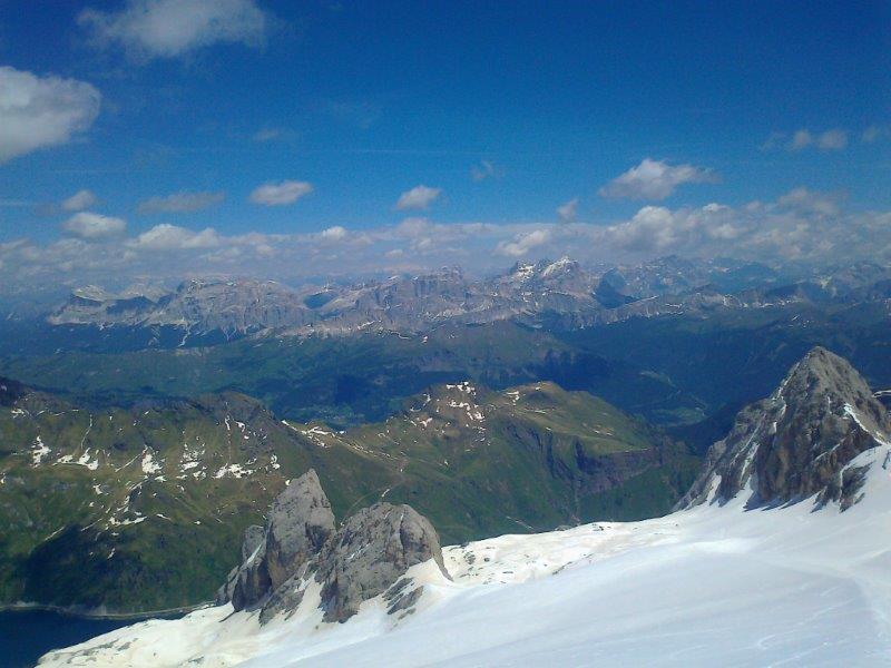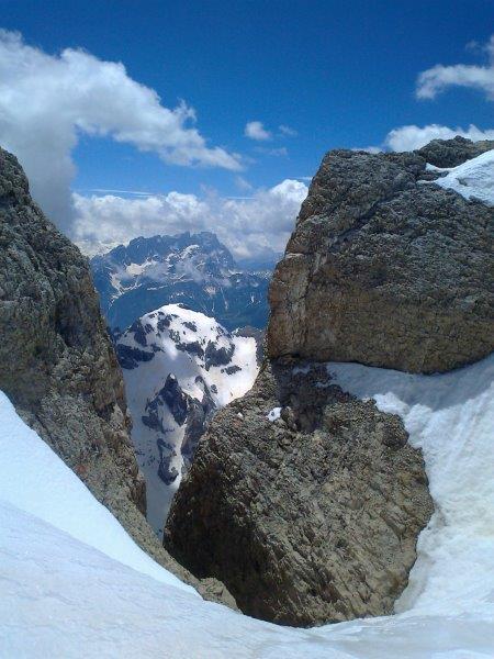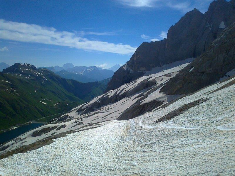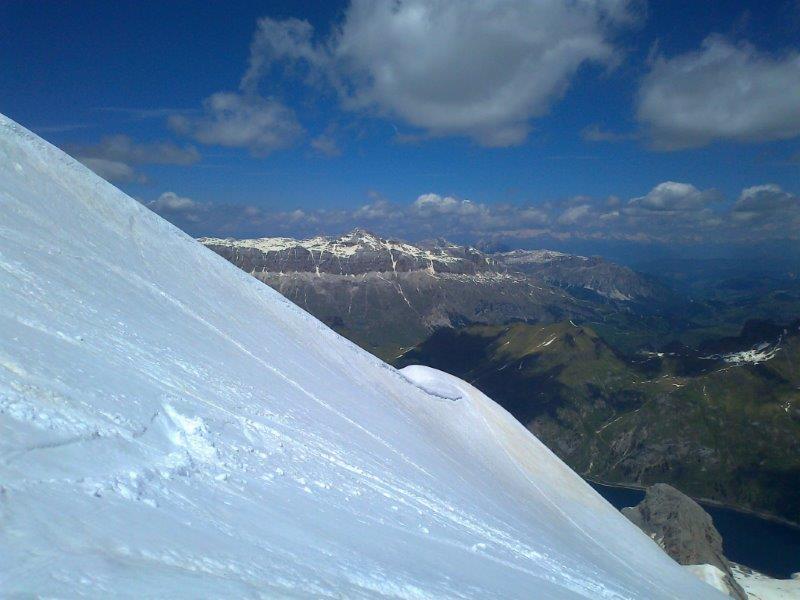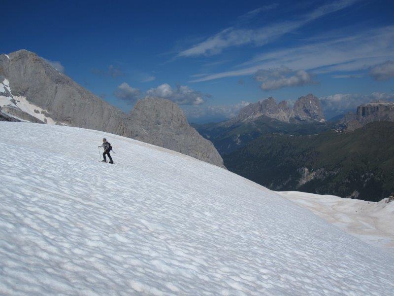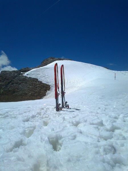 Der Aufstieg über den Gletscher zur Punta Rocca war völlig problemlos. Die Schneemengen sind gewaltig: Trotz der sommerlichen Witterung Mitte Juni hatte die "Sahara-Grenze" den Gletscher noch nicht erreicht. An den Gletscherspalten nahe der Punta Rocca konnte man gut sehen, dass die Saharaschicht vom 19.2. noch fast einen Meter unter der Schneeoberfläche liegt; darunter liegen ja dann die meterdicken Schichten der Starkschneefälle der Weihnachtstage und des "tsunami di neve" Ende Januar.