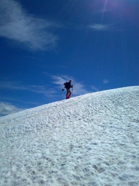 Jetzt, Mitte August, als ich endlich zum Schreiben dieses Berichtes komme, kann man absehen, dass unser Ausflug an einem der wärmsten Tage dieses Sommers am Gletscher stattfand. Der Schnee war bereits früh aufgefirnt und gerade gut zum Laufen mit Bergschuhen bzw. Tourenski. Entsprechend schweißtreibend stellte sich der Aufstieg heraus.