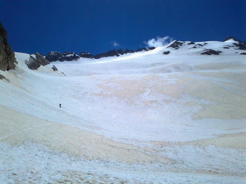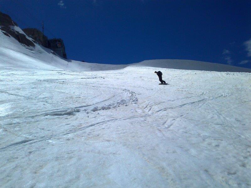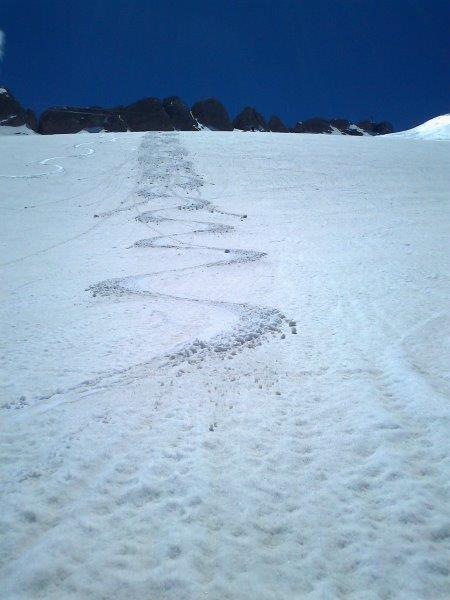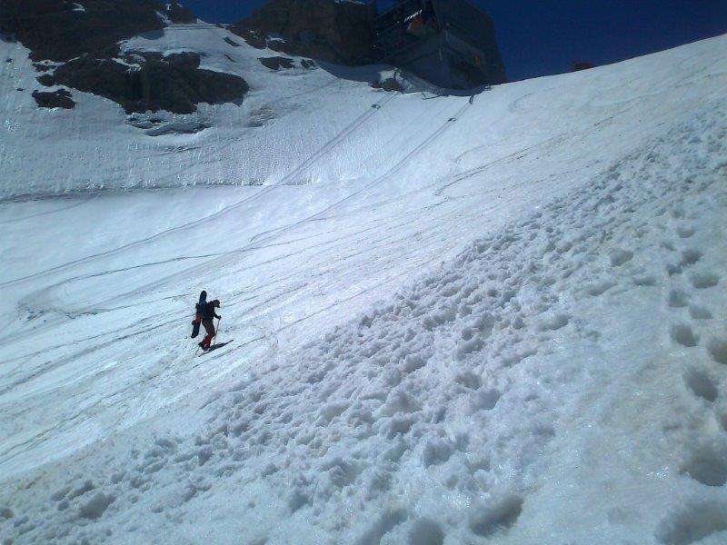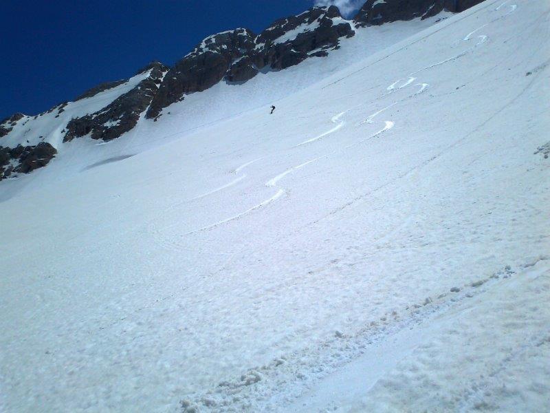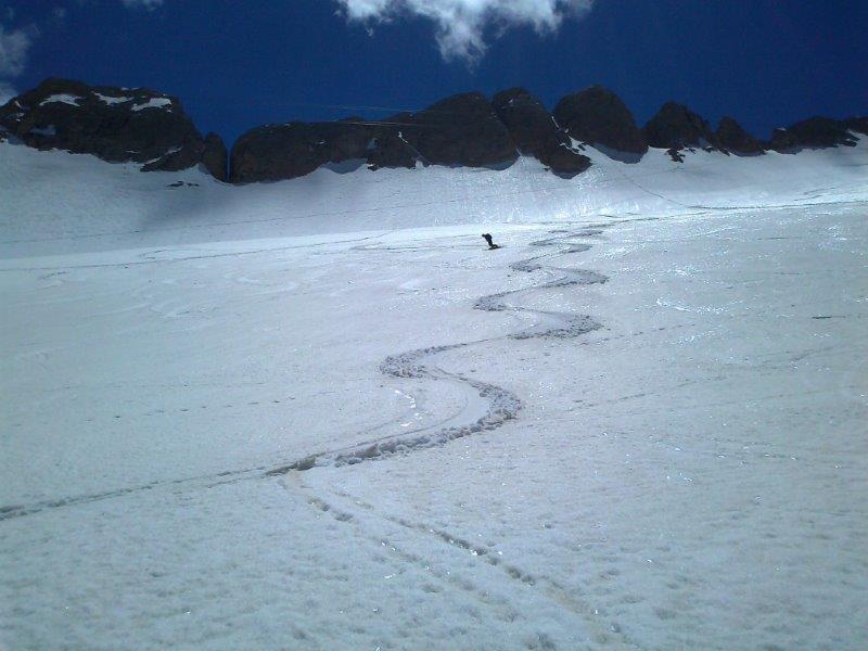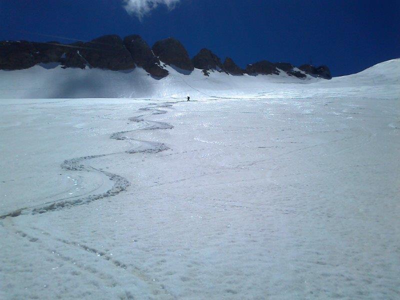 Es geht auf die Abfahrt; an den Gletscherspalten sieht man die Saharaschicht eingebacken Butterweicher Firn!