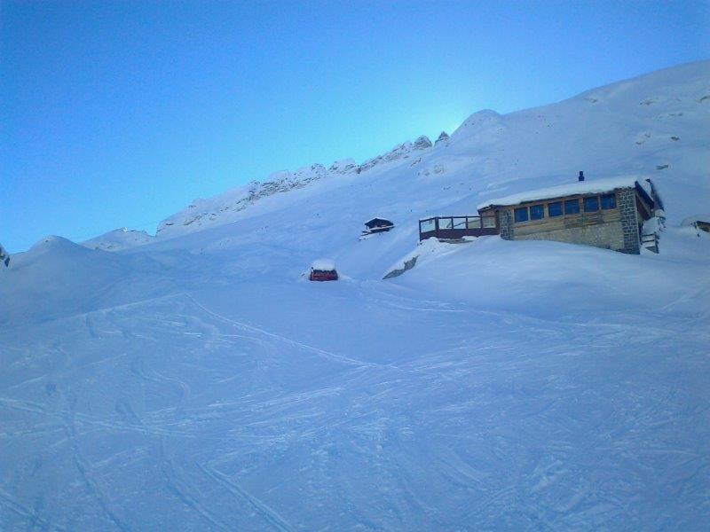 Das Rifugio und links unterhalb die hauseigene Pistenkatze "Bettina" im Winterschlaf