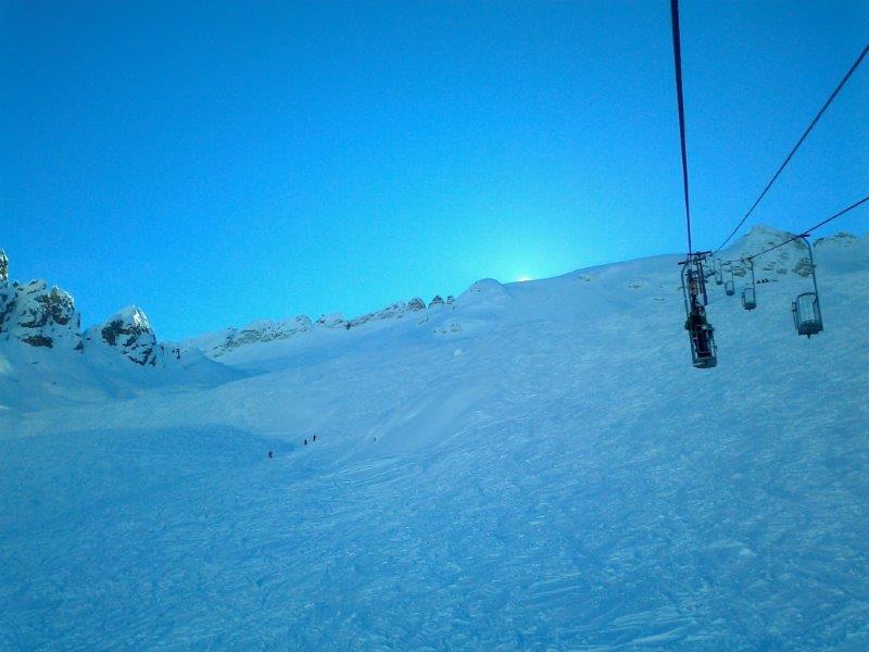 Das prächtige Wetter, die fantastische Schneelage und das Tourenski-Event zogen Freeride-Begeisterte aus allen benachbarten Provinzen an, so dass die parkenden Autos bis über die gesamte Staumauer wie im August standen. Wahnsinn. Da die meisten Leute jedoch mit Tourenski unterwegs waren, gab's am Lift keine Wartezeit.