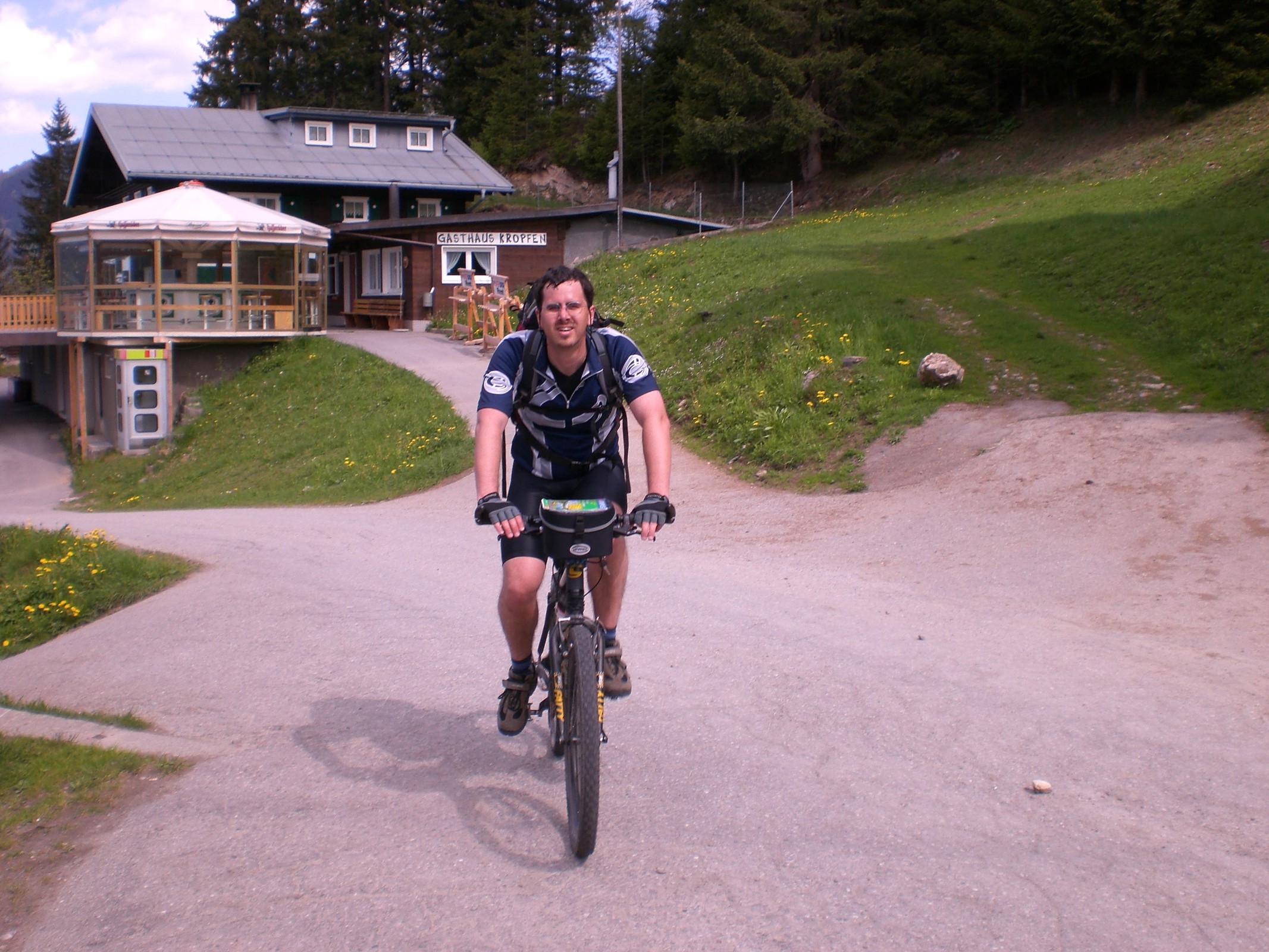 Los geht’s, in die Strecke, die es in sich hat mit ca 1400 Höhenmetern! Leider gehts direkt in die Steigung, zunächst auf der Talabfahrt Richtung Mittelstation/Gasthof Kropfen. Serpentinenartig geht’s mit ziemlich zäher und gleich bleibender Steigung Bergan, Höhenmeter für Höhenmeter wird erklommen, immer wieder mit schönen Aussichten.