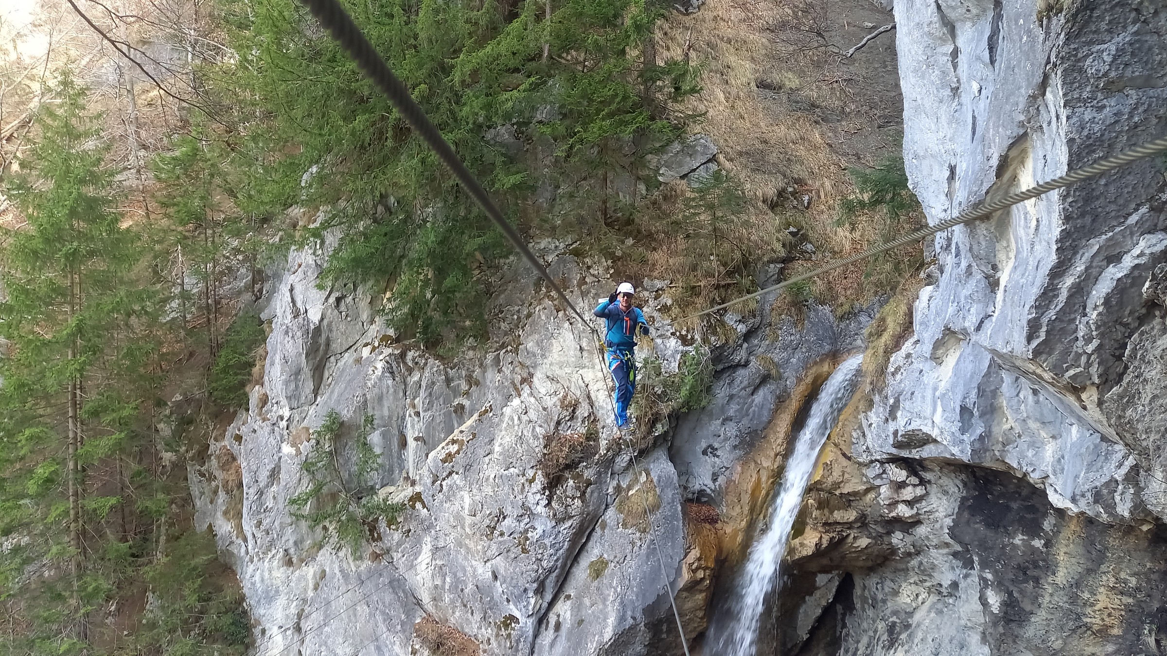 Ab hier geht es über eine kleine Brücke danach nach links weg (Tafel: „Klettersteig, Wasserfall“; rechts geht’s nach Valleu). In dem Wald an einer Wegkurve steht eine Bank, die man gut nutzen kann um sein Klettersteigset anzuziehen. Weil wir es dort gemacht haben, hat es das nachfolgende Pärchen auch dort gemacht. Kurz darauf folgt das erste Stahlseil entlang des Waldweges bis zum Fuß des Wasserfalls, geht es unschwierig weiter.