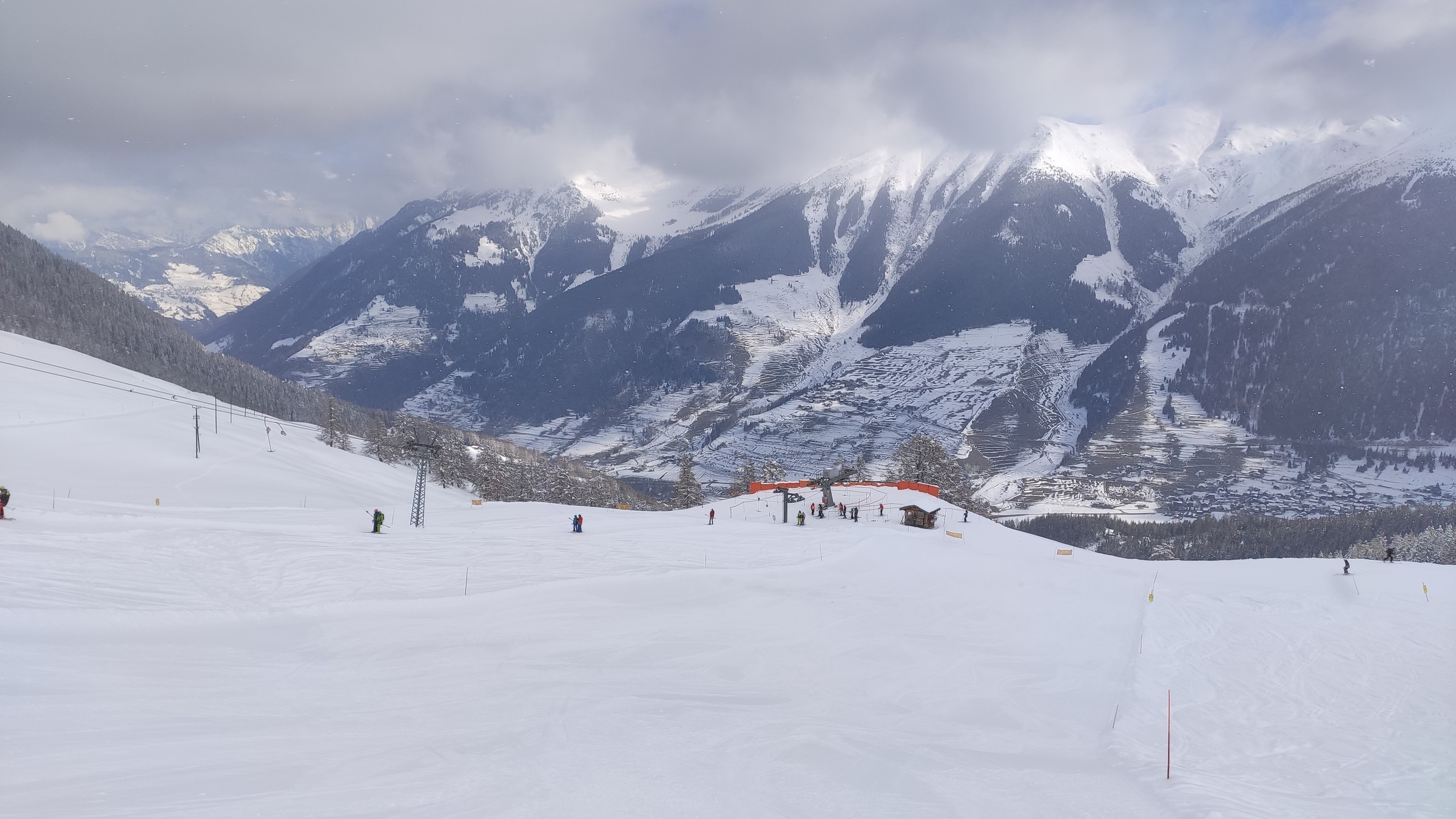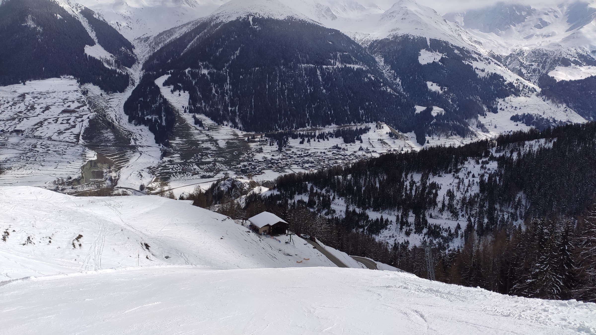 Angefangen habe ich in Liddes, am Morgen war es dort noch recht bedeckt. In linken Teil war es am Bügellift am hellsten, also habe ich dort erstmal die vier Varianten gemacht. Es war auch eine feine Schicht Neuschnee auf der Piste, war gut zu fahren und die roten Pisten dort sind recht abwechslungsreich. Danach hat es etwas aufgehellt und ich bin zum rechten Tellerlift gewechselt, der hat auch einen Zwischenausstieg, der zur Bergstation vom Sessellift führt. Auf dem Pistenplan war das nicht korrekt drauf. Dann habe ich die knackige schwarze Piste rechts gefahren und links auf eine blaue Piste abgebogen. Nachdem die immer weiter weg vom Skigebiet geführt hat, habe ich mal auf den Pistenplan geschaut, und dort ging die Piste einfach rechts aus dem Bild