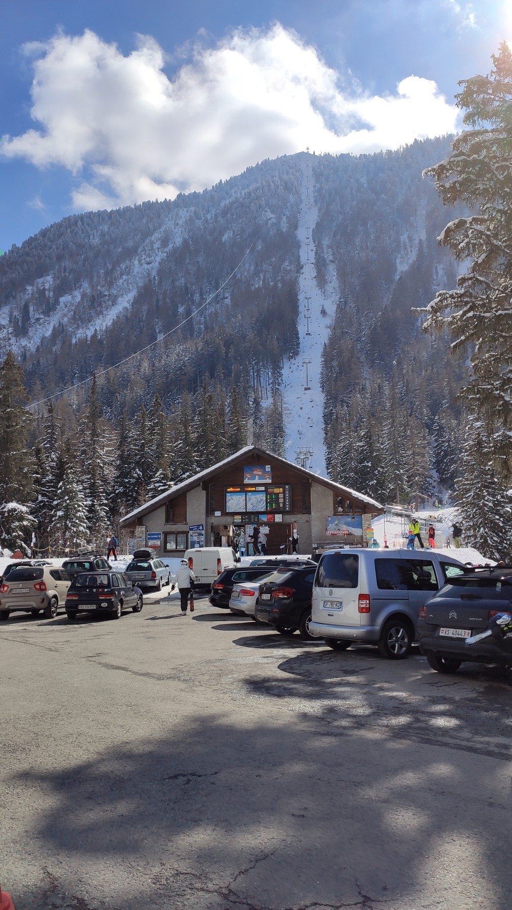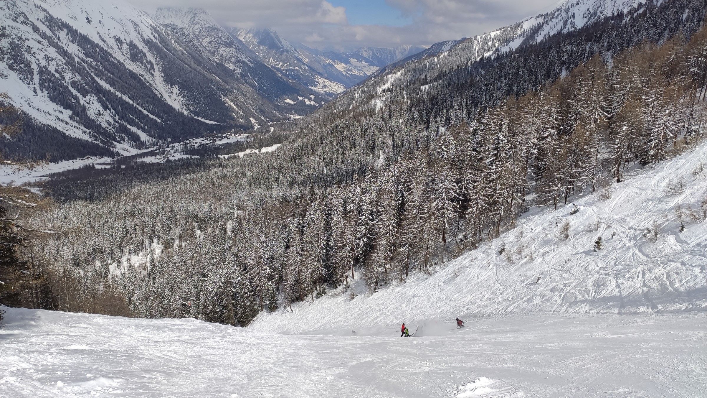 La Fouly ist am Ende vom Val Ferret, sehr schön umschlossen von Bergen. Hier bin ich erstmal mit dem 2er Sessel hoch, und dann weiter mit dem oberen Schlepplift. Der hatte einen recht steilen Einstieg, aber zum Glück kein Poma. Interessant war hier auch, dass jeweils 2 Bügel und ein Teller aufgehängt waren. Mit dem Board ist der Teller bequemer. Die schwarze Piste zum unteren Schlepplift war richtig knackig, ziemlich steil, aber auch ziemlich griffig. Definitiv das Highlight hier. Am Sessellift gibt es auf der rechten Seite auch noch ein paar interessante Varianten. Beim Mittagessen wurde die Maskenpflicht sehr liberal ausgelegt, die Einheimischen sind hier anscheinend unter sich