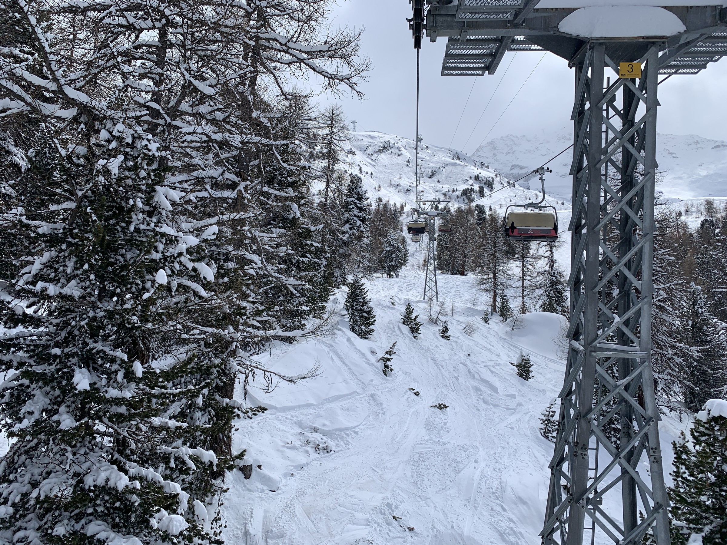 Um diese Zeit kurz nach 12 war noch Plateu Nair geöffnet und Corviglia zu. 2h später kehrte es dann aufgrund des Sturmes.