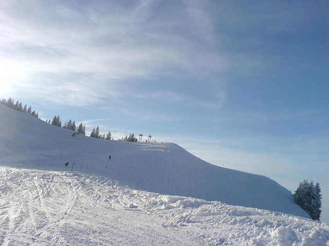 Die haben in der Wolzen übrigens ein sehr cooles Eigenbau-Pistenfahrzeug für die Präparation der Talpiste bei wenig Schnee (hab mich ja echt auch gefragt, wie sie bereits seit Anfang Dez. durchgehend die Talpiste geöffnet halten konnten - viel Neuschnee hats ja im Januar nicht grad gegeben). Das Gefährt besteht aus einem Schneetöff und als Anhänger wird die Walze eines 70er Jahre Pistenbully angekuppelt!