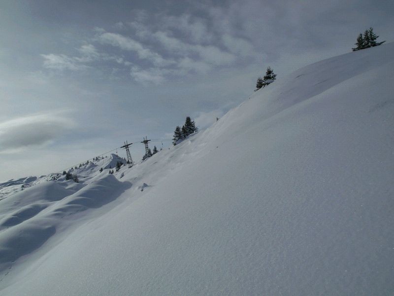 SCHNEE (PISTE): griffiger Naturschnee. Ein paar braune Flecken, besonders bei den sehr zahlreich vorhandenen Kuppen. Wer vollbeschneite, planierte Carvingautobahnen sucht und 8-KSB mit Haube und Sitzheizung, der ist hier falsch. Aber auf planierten Pisten würde es bei nur zwei Liften recht schnell langweilig, so aber ist für Abwechslung da. Die Wellblechpisten verlangen auch von geübten Fahrern noch Konzentration und sorgen für Achterbahn-feeling.