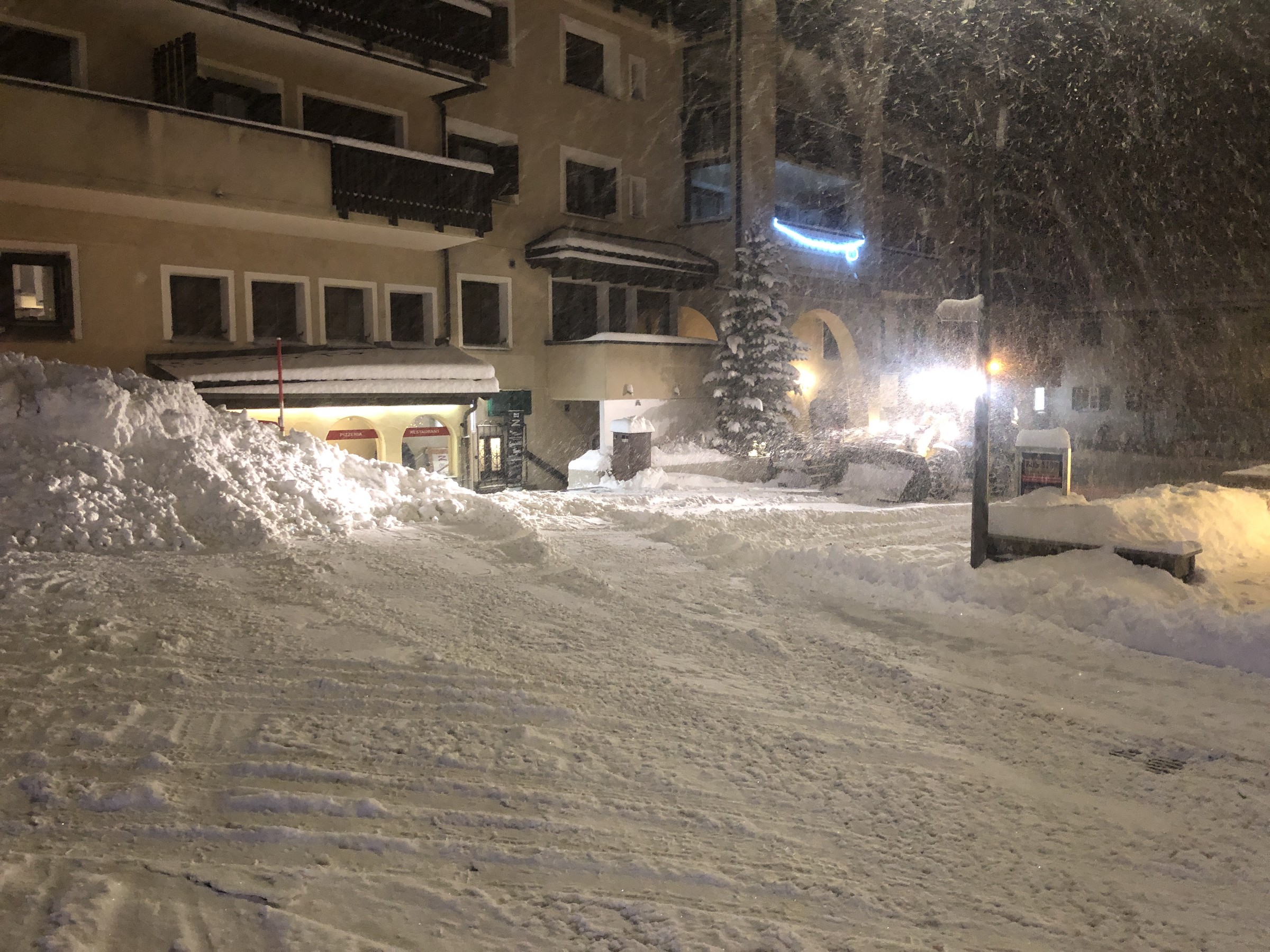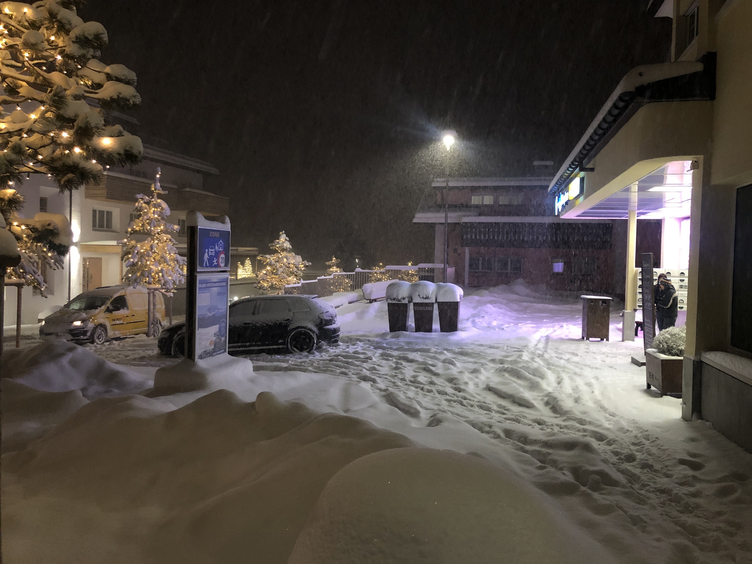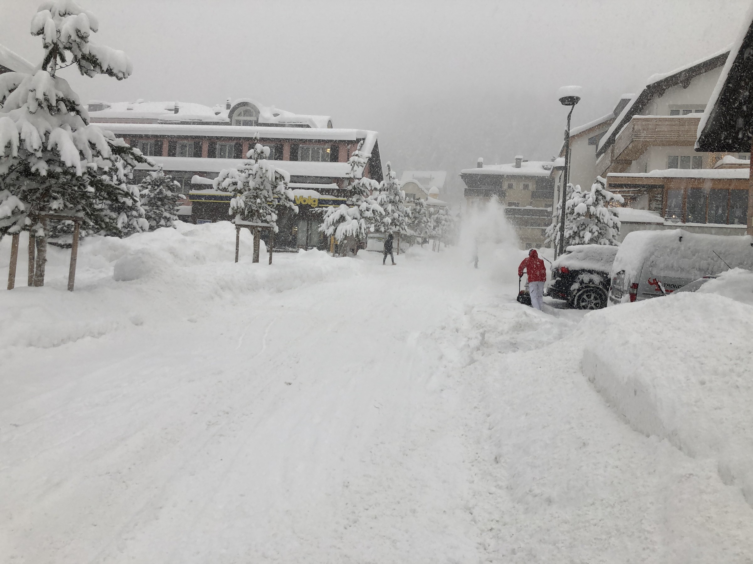 Von der Piste gibts nicht viel zu berichten. Kalt, windig, Schneefall, geschlossene Restaurants, abgesagter Weltcup, wenig Leute, eingeschränkter Liftbetrieb aufgrund der Lawinengefahr. Zudem öffnete Chantarella erst um 10:00h. Währenddessen werden die Schneemassen auch im Tal immer grösser:
