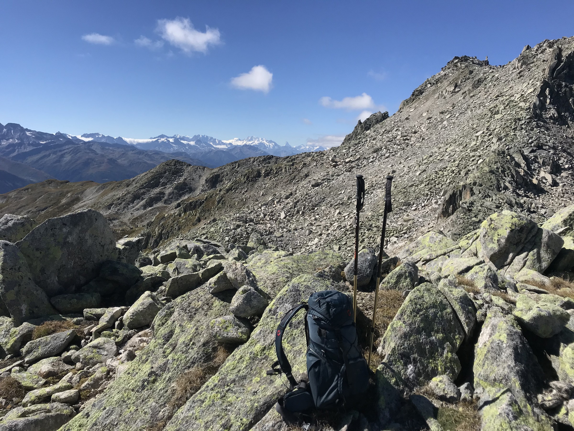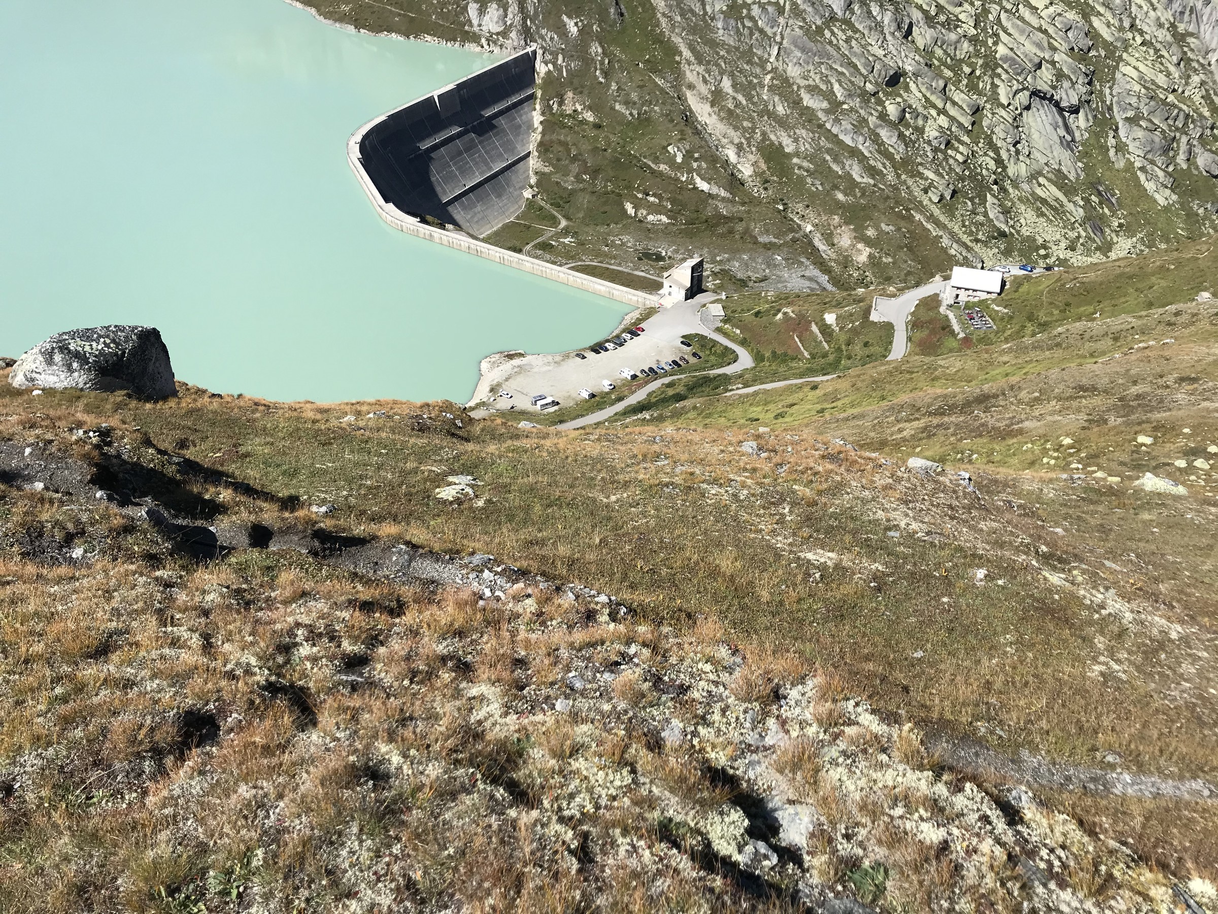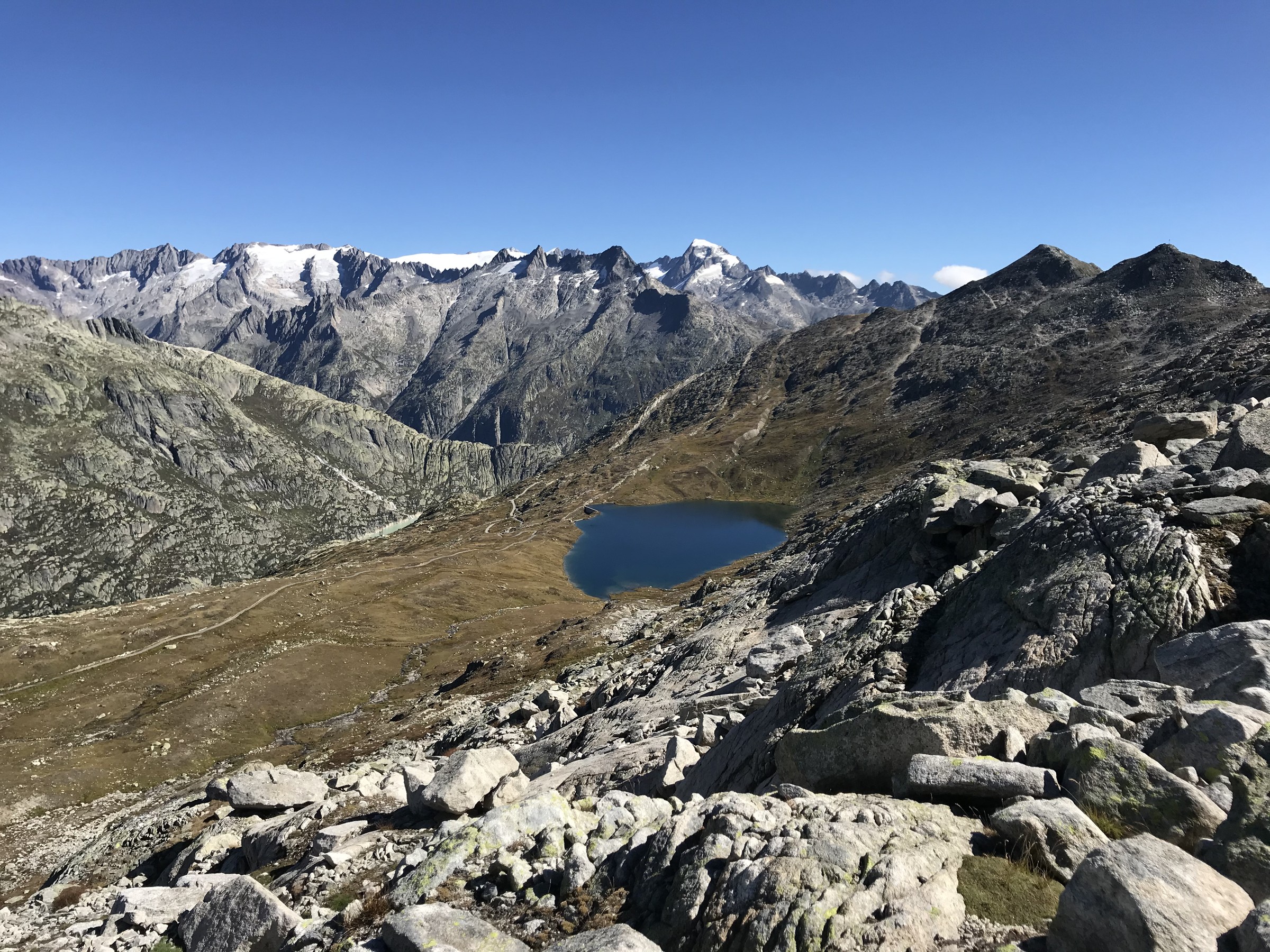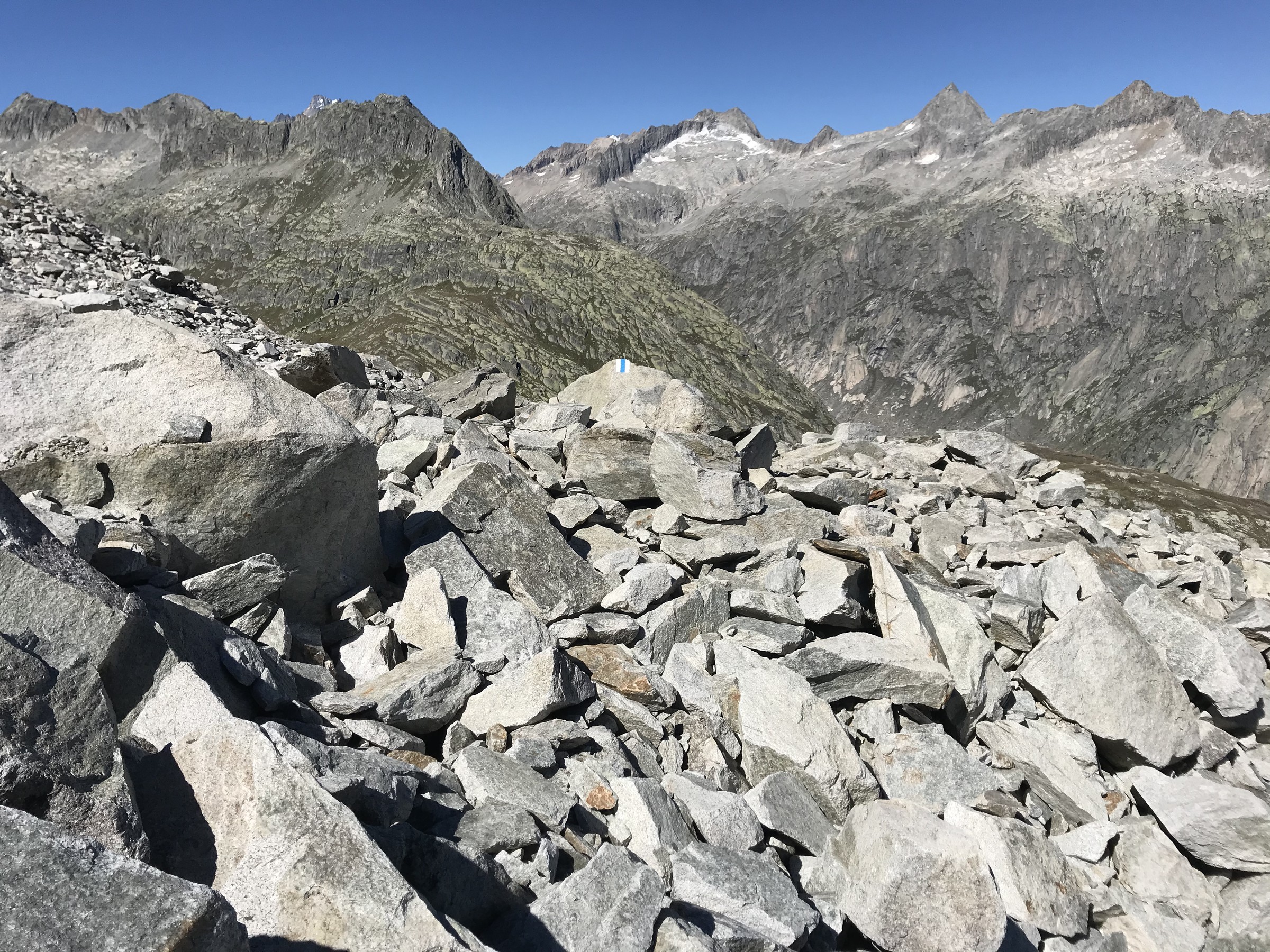 Meine heutige rund 5 1/4 stündige Wanderung führte mich zuerst zur Gestlerlicke unterhalb des Gross Sidelhorns und anschliessend an die beeindruckende Zunge des Oberaargletschers. Eigentlich wollte ich auf das Sidelhorn, aber als ich die Massen an Leuten dort hochspulen sah, entschied ich mich, die Panoramastrasse zu fahren, in Oberaar zu parkieren und von dort aus zu einem Nebengipfel zu wandern, der dank der blau-weissen Markierung ganz sicher viel weniger frequentiert sein würde. Das war dann auch so: Ich war bei Auf- und Abstieg mutterseelenalleine. Zwischendrin führte der „Weg“ über eine anspruchsvolle Gröllhalde, die mich technisch fast an die Grenzen brachte. Alle Steine wackelten und manchmal wusste ich kaum mehr, wo weiter. Zum Glück war die Strecke vorbildlich markiert und an den ganz schwierigen Stellen fand ich alle paar Meter einen blauen Streifen an den Felsblöcken. Auf der Gestlerlicke angekommen, entschied ich mich, nur noch auf den namenlosen 2750m hohen Gipfel östlich zu steigen, weil der Aufstieg zum Gross Sidelhorn nicht mehr markiert und noch gröllhaldiger aussah. Ich wollte mich nicht überfordern. Und die Wahl war sowieso gut, der Platz war herrlich für ein Zmittag mit Blick aufs Matterhorn.