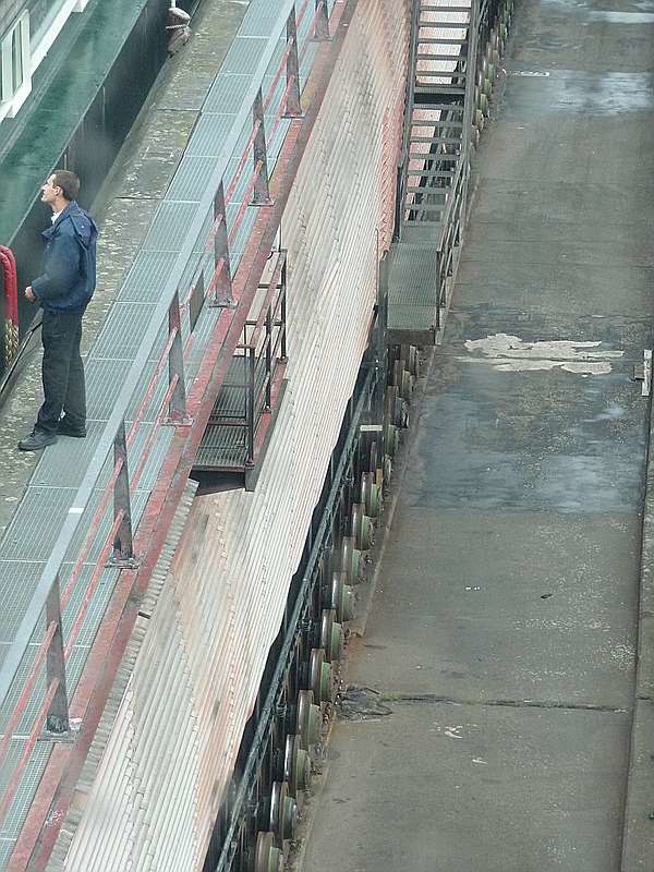 Das Schiff passiert die Tore, zu sehen ist die Führung der beiden Tore. Der linke Teil ist der Wagen.