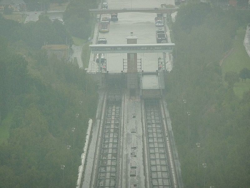 Am Sonntag, dem 15. August besuchten wir den Ort Ronquieres in Belgien. Dort fahren im nahen Zentrumskanal die Schiffe zwischen Brüssel und Charleroi. Bereits im 19. Jhdt wurde der Kanal errichtet, allerdings mit 55 Schleusen auf nur 60 Kilometer. Zwischen 1947 und 1968 wurde der Kanal modernisiert. Jetzt hat er nur mehr 10 Schleusen und als Herzstück die „schiefe Ebene von Ronquieres“. Das ist nichts anderes als ein Schrägaufzug, der Schiffe transportiert. Genauer gesagt handelt es sich um zwei voneinander unabhängige parallele Aufzüge. Streckenlänge 1432m – Höhenunterschied 68m. Die Seilbahnwagen (Tröge) fahren auf 59 Achsen, sind 91m lang, 12m breit, haben eine Wassertiefe von 3,7m und ein Maximalgewicht von 5700t. Die Gegengewichte wiegen 5200t. Trog und Gegengewicht sind mit 8 Seilen verbunden. Ob jetzt im Trog vollbeladene Frachter transportiert werden, oder ob er ohne Schiff fährt macht keinen großen Gewichtsunterschied, da ein Schiff beim Einfahren in den Trog die entsprechende Wassermenge verdrängt.