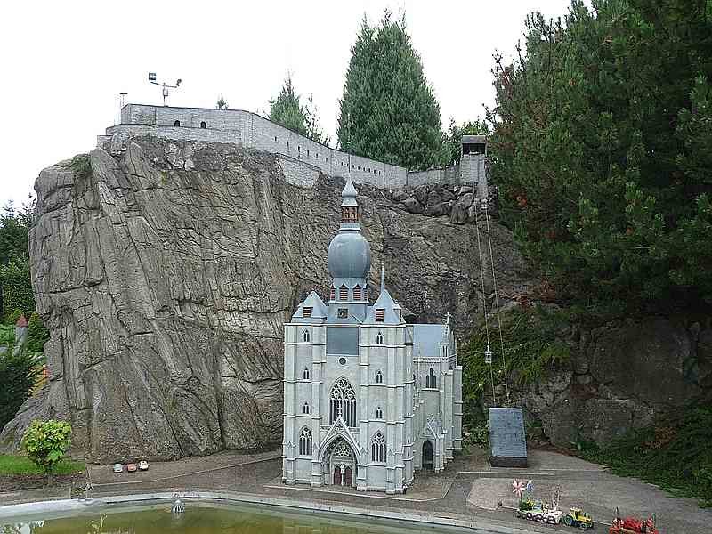 Kirche, Seilbahn, und Festung als Modell im Freizeitpark "Mini-Europe" in Brüssel.