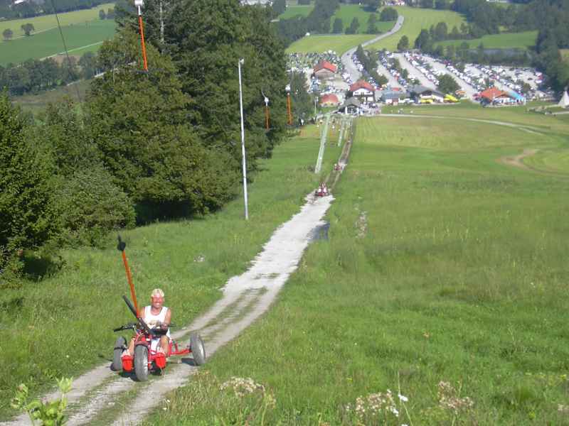 Hi Leut-- es is der absolute Hit- habs erst gestern erfahren, daß sowas existiert- heute schon gestestet- neben der Talstation der Brauneck Bergbahn steht schon seit den 60 ern der Streidllift- einer der ersten DM Schrägmasten Schlepplifte- und seit Juni- weiß gar net, daß ma da net schon eher was davon ghört hat- gibt s da ne Bullcart Bahn- d. h. es schaut so Go-Cart ähnlich aus, mit 2 Scheibenbremsen- und 3 Rädern- die etwa die Größe eines Roller-Reifen habn, per Schlepplift- der herkömmliche Bügel hat unten einen Karabiner- wird damit an einen Haken am Cart angehängt- und los gehts nach oben- der Fahrer muß allerdings die Stange- ein sogenannter 2. Lenker- gut festhalten- sonst is s vorbei mitm hochfahrn...oben einfach loslassen- und nach links lenken- schon iss ma in der Startposition- und dann gehts recht rasant nach unten... macht echt süchtig...