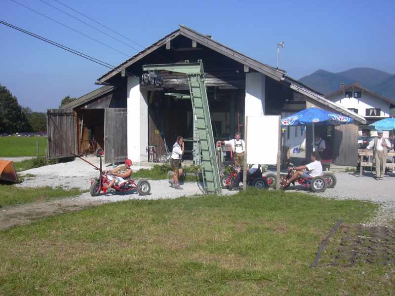 Bullcarts heißen die Funsport-Geräte, die in diesen Tagen zumeist Väter und Söhne, aber auch ganze Betriebsausflüge und zum Beispiel Burschenvereine aus der Umgebung an den Streidlhang bei Lenggries (Kreis Bad Tölz-Wolfratshausen) ziehen. Wo im Winter am Fuße des Braunecks Skikurse die ersten Stemmschwünge üben, rauschen jetzt Urlauber und Tagesausflügler auf überdimensionalen, geländetauglichen Dreirädern mit dicken Gummireifen nach unten. "Das ist ein Wahnsinnskick", sagt Josef Wohlmuth, der außer dem Skilift am Streidlhang auch die Ausflugsgaststätte "Alte Mulistation" dort betreibt. "Viele wollen nicht mehr aufhören, wenn sie es ausprobiert haben."
