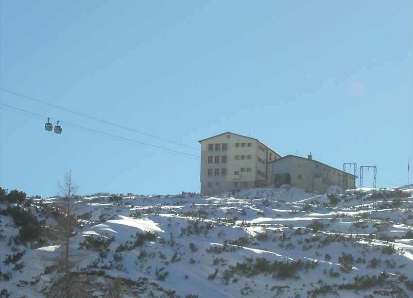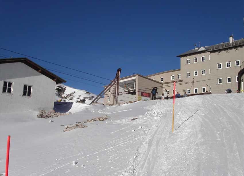 Bergstation Krippenstein von hinten, nach links geht die 3. Teilstrecke zur Gjaidalm runter, die beiden dicken Seile, die mittig aus dem Haus herauskommen und schräg nach links unten zu dem kleinen Gebäude führen, sind die Abspannvorrichtung