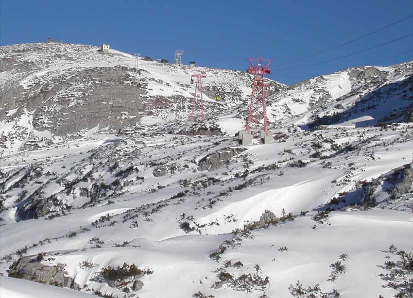 3. Teilstrecke der Seilbahn, hier noch sehr wenig Schnee im Gelände