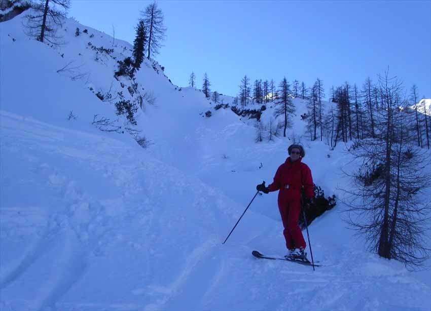 Gelände war bei nur mäßig viel Schnee eher anspruchsvoll und vor allem im Schlußteil der Route zur Mittelstation Schönberg ziemlich zerfahren, die Plateauwanderung bis zum Däumelkogel dafür mit richtigem Hochalpenfeeling, dann einige gute Pulverpassagen. Auch wenn die Abfahrt vom Pulver-Genuß sicher nicht optimal war, so schätze ich einfach das Ursprüngliche an den Varianten in diesem Gebiet. Man muß umsichtig an Gelände und Schnee angepaßt fahren, es gibt keine Markierungen oder Kontrollen, wenn man sich verfranzt, kann man schnell oberhalb einer senkrechten Felswand stehen, das Gebiet ist mit seinen maximal 2100m Höhe trotzem auf jeden Fall als hochalpin zu bewerten.