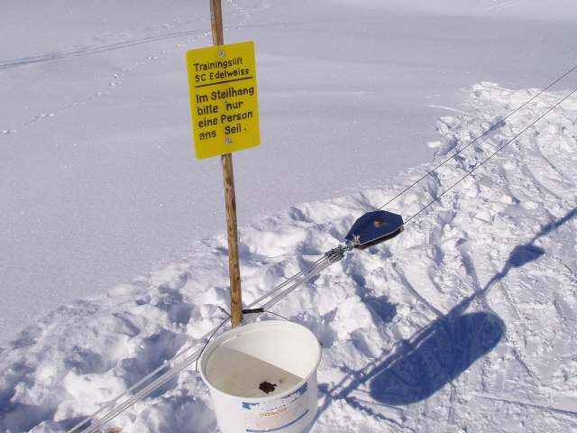 ^^ Und auf geht's! 200 Meter Liftstrecke nach oben. Solange kein Fahrgast im Lift ist, schleift das Seil auf dem Boden.