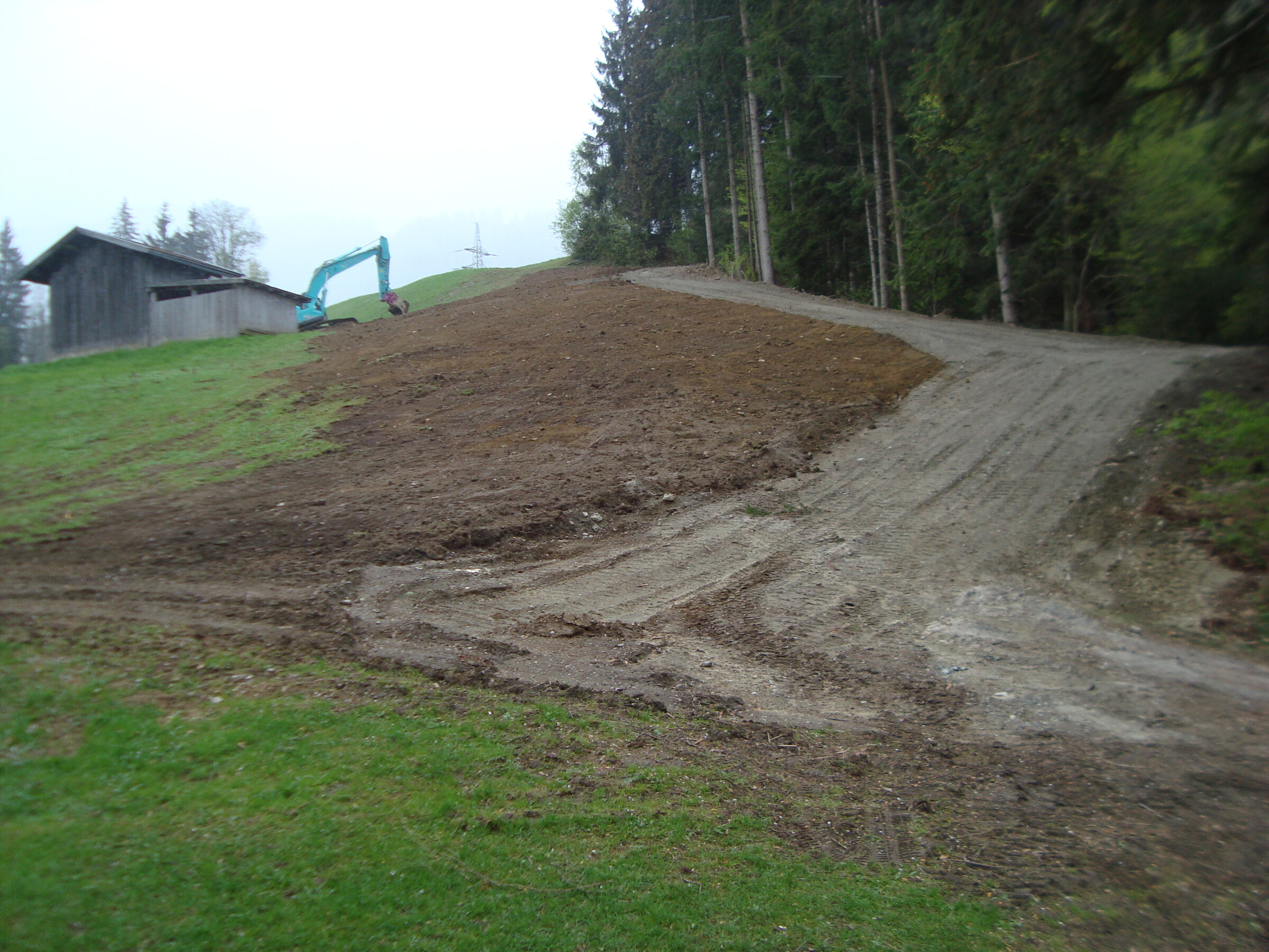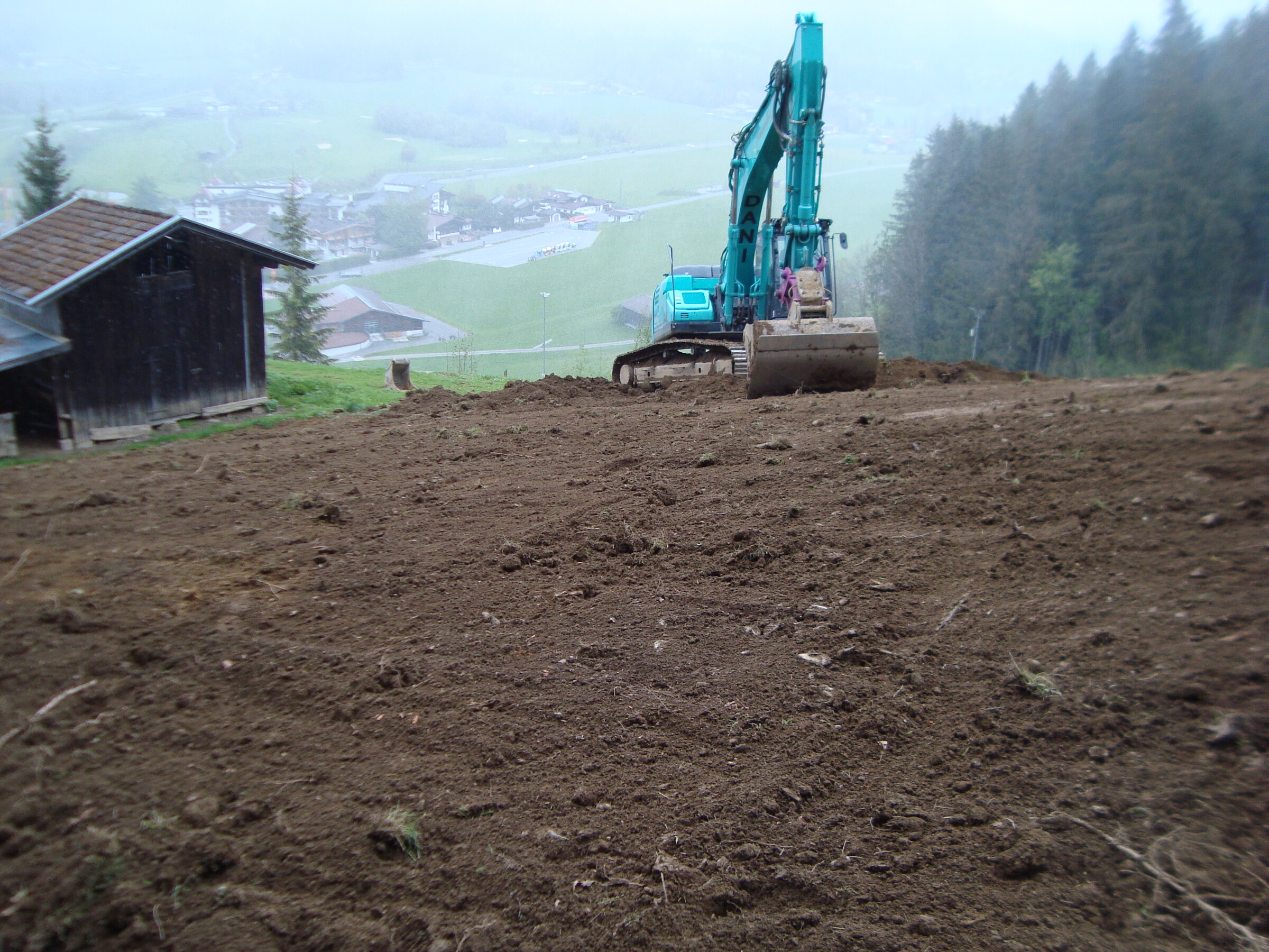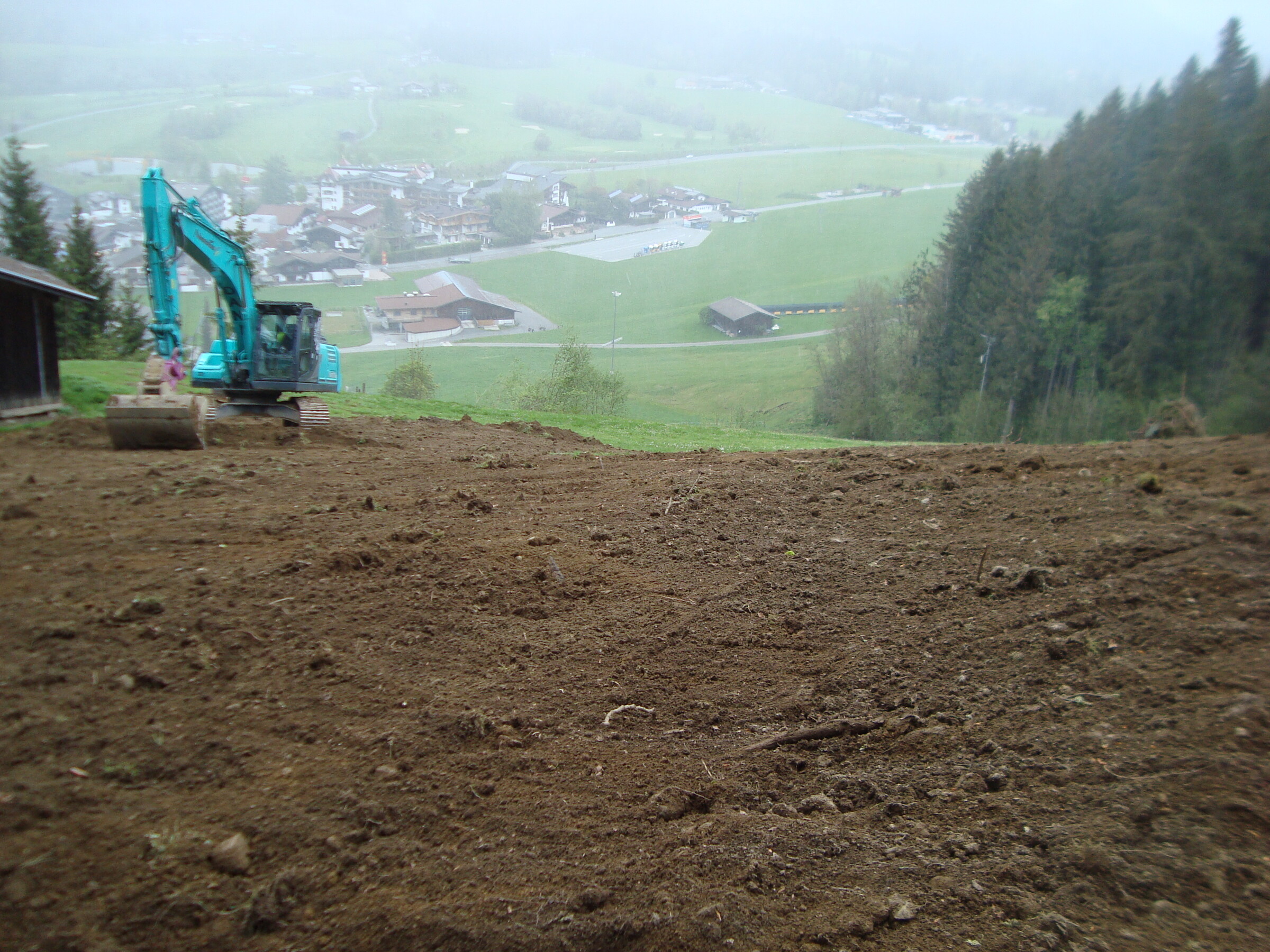 Gampenkogel-Gipfel ist zu steil, da muss man dann Anfänger-tauglich Serpentinenwege bauen, nicht prickelnd. Gleiches gilt für die (Nord-)Ostseite, das ist viel zu steil und felsdurchsetzt, oder? Und die (Süd-)Ostflanke ist bewaldet, da macht man sich sicher nicht beliebt.