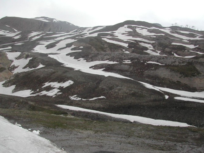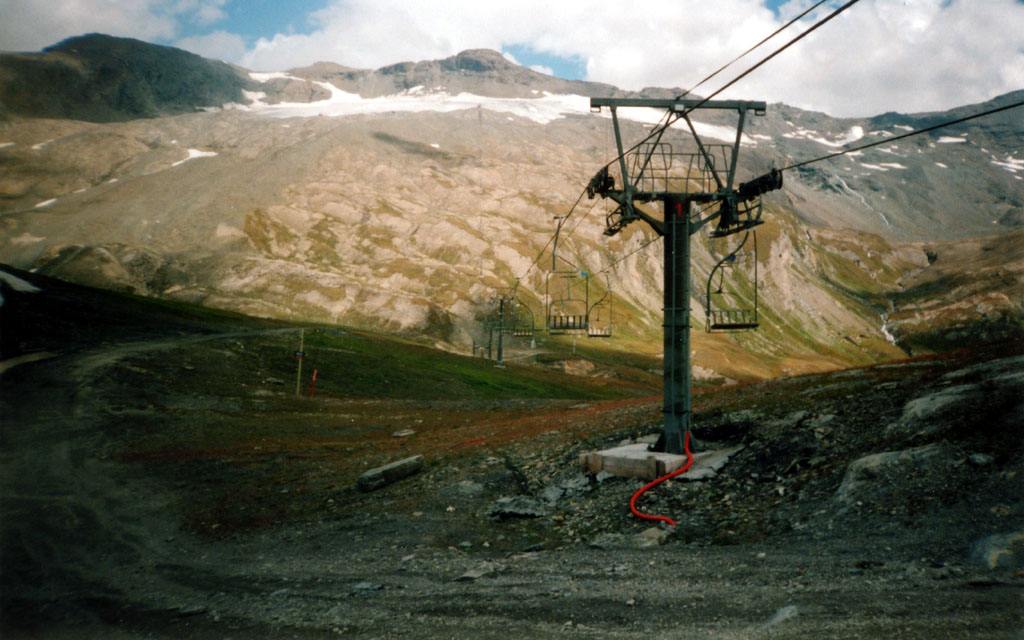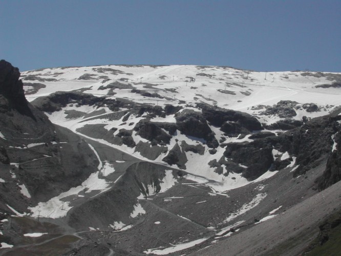 Was den Gletscher an sich angeht: der Sommer 2003 war eine Katastrophe für ihn. Enorme Löcher haben sich auf der Zunge des Gletschers aufgetan mit dem Aus-apern von Felsen. Die Abfahrt zur Talstation des SLtes macht man mit Hilfe eines Firnfeldes, kein Gletscher mehr. Der Gletscher erstreckt sich folglich zwischen 3000/3100 und 3300 Metern. Der Gletscher ist flächenmäßig sehr begrenzt, weshalb das Sommerskifahren auch keine großen Leidenschaften weckt. Außerdem, abgesehen von den beiden ziemlich steinigen roten Abfahrten hinunter zur 4 KSB sind die Pisten sehr flach. Im letzten Winter hat es auf der Iseran-Seite wohl weniger geschneit, das sieht man im Vergleich zu den Gletschern an der Grande Motte und Varet an der Aiguille Rouge in Les Arcs, die sehr viel besser in Form waren, Anfang Juli.