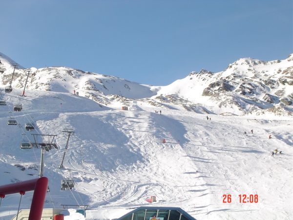 Blick auf die Gletscherlifte, das wetter war super, nur die Piste war doch eher vereist. Es war aber auch sehr windig, dass es dort viel Schneeverwehungen gab.