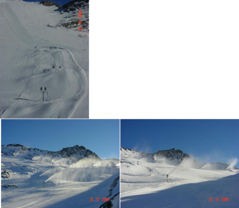 Am Mölltaler wird auch am Gletscher direkt beschneit. Der große Doppelturm ist noch auf einem freigewordenen Felsen am unteren Rand verankert. Dahinter sind noch zwei Doppelhydranten, die direkt am Eis stehen (siehe Fotos - aktuell). Die Wasserrohre liegen am Eis auf und sind mit Schnee bedeckt. Seit der Installation 2003 sind sie nicht mehr freigetaut worden. Die Stromversorgung wurde mitverlegt, die Steuerung geschiet per Funk.