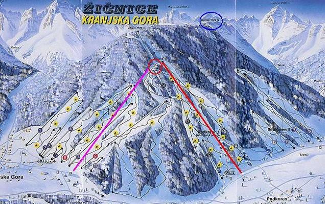 Rot = 4KSB Podkoren (in Bau), im roten Kreis der Pistenabschnitt wo gerade gebaggert wird. Lila = mein Vorschlag der zukünftigen 4KSB Vitranc 1.