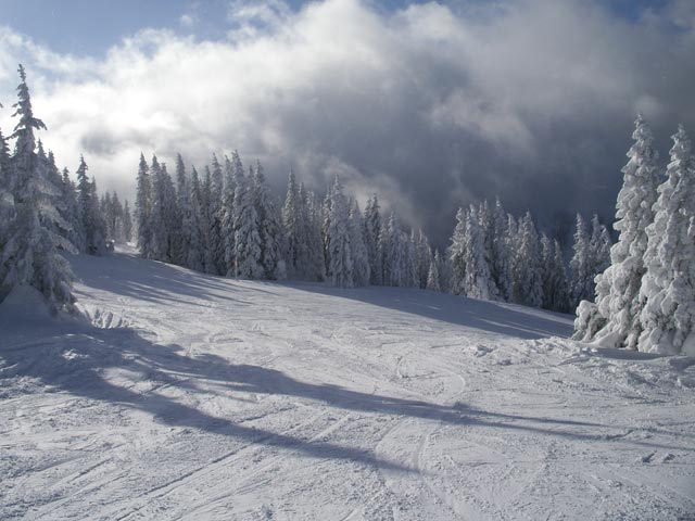 in der Früh Schneefall, ab dem Vormittag sonnig, Stuhleckgipfel jedoch meist in Wolken, insbesondere oberhalb der Baumgrenze sehr stürmisch, Tal: -4 °C, Friedrich Hütte: -9 °C